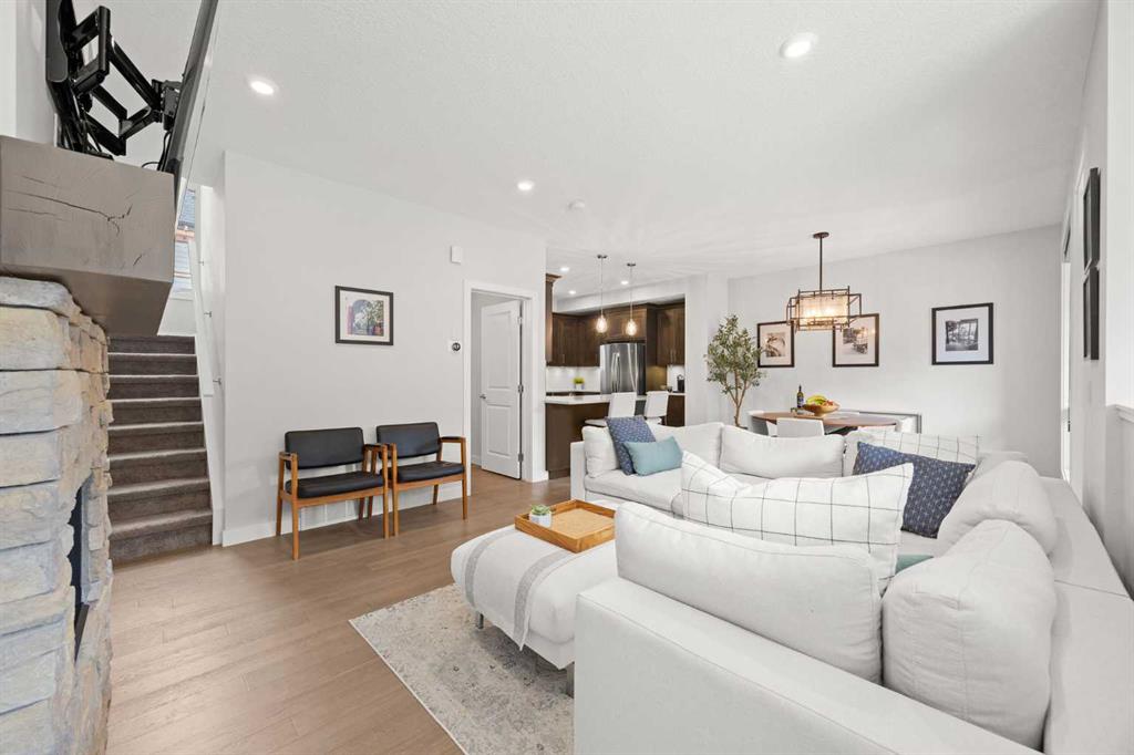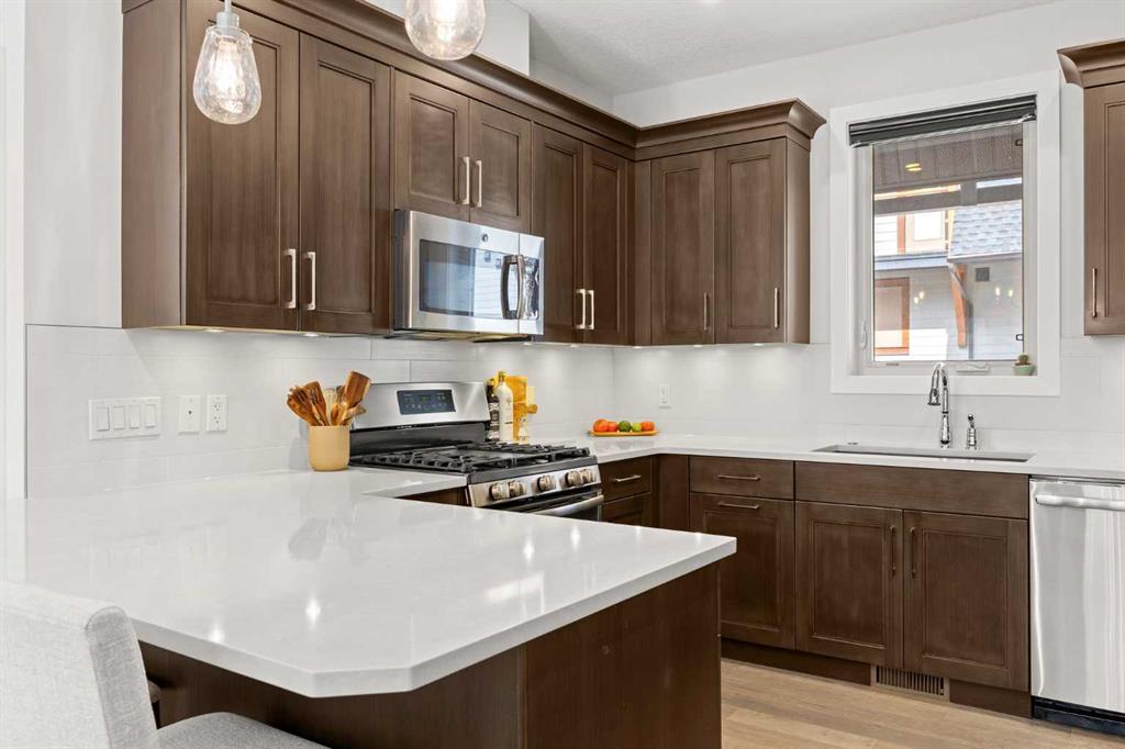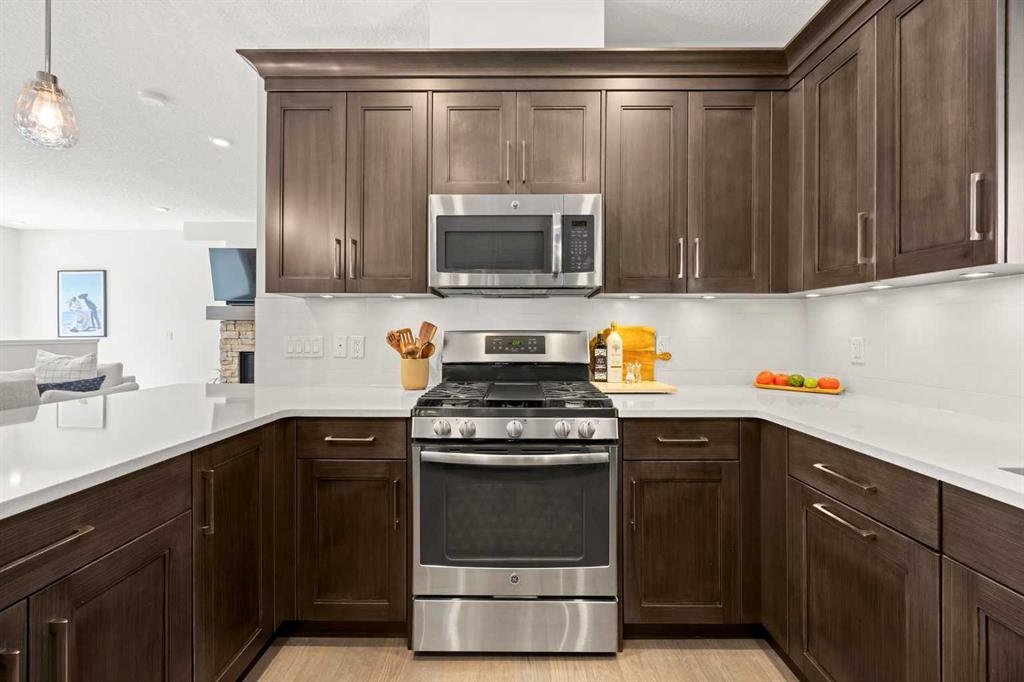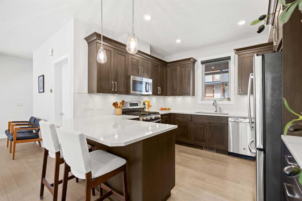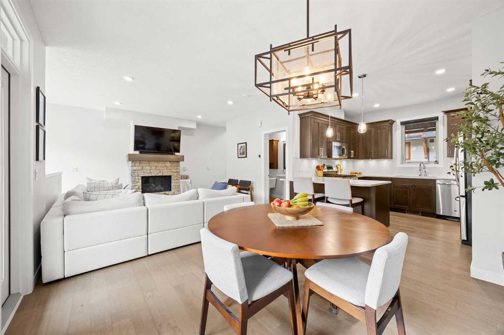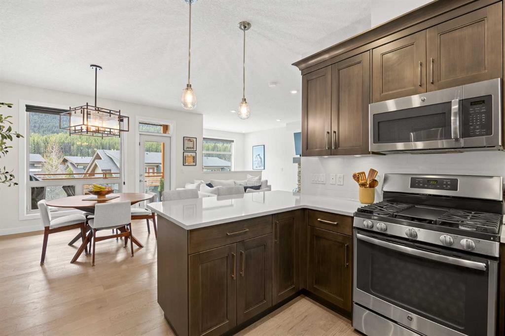 An OPEN-CONCEPT main floor flooded with NATURAL LIGHT showcases breathtaking views in every direction. The spacious living room is anchored by a cozy fireplace, creating the perfect setting to unwind after a day outdoors. The kitchen is a true SHOWPIECE—featuring EXTENSIVE CABINETRY, sleek STAINLESS STEEL APPLIANCES, and QUARTZ COUNTERTOPS that combine both style and functionality. Whether you’re entertaining or enjoying a quiet night in, this space delivers. The adjoining DINING NOOK is perfectly positioned to capture the views and flows effortlessly out to a SPACIOUS DECK overlooking the GORGEOUS ROCKY MOUNTAINS—creating the ultimate indoor-outdoor experience you’ll appreciate every single day.