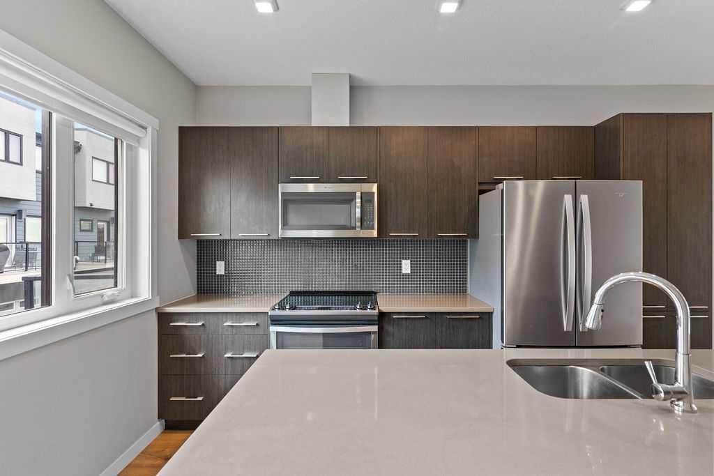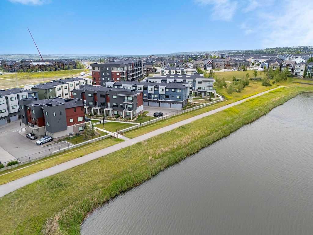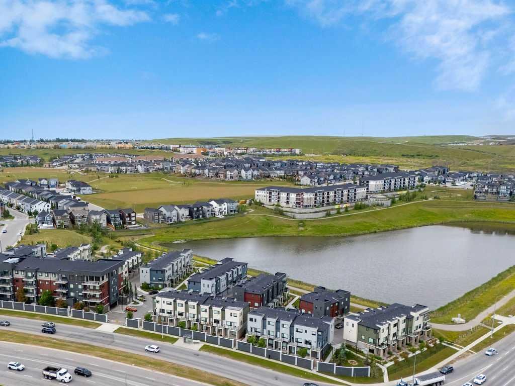 Welcome to this exceptional, fully upgraded townhome located in the highly desirable Diseno Development of Sherwood in NW Calgary. Offering 1,565 sq. ft. of thoughtfully planned living space, this sun-filled home is perfectly positioned just steps from the community park and pond, providing tranquil views and a peaceful setting, while still being within walking distance to the everyday conveniences of Sage Hill Crossing. From the moment you enter, you’ll appreciate the modern design and attention to detail throughout. The entry level features a versatile flex or bonus room, ideal for a home office, fitness area, media room, or hobby space—perfect for today’s flexible lifestyle. Access to the side-by-side double attached garage adds both functionality and everyday convenience. The main living level is bright, open, and designed for both entertaining and comfortable daily living. Large windows allow natural light to pour in while showcasing picturesque park views. The contemporary rear kitchen is a standout, complete with quartz countertops, upgraded stainless steel appliances, ample cabinetry, and a functional layout that opens seamlessly to the dining area. The spacious living room sits at the heart of the home, creating an inviting space to gather with family or unwind at the end of the day. Step out onto either the front or rear private balcony to enjoy morning coffee, evening sunsets, or outdoor entertaining. Upstairs, the well-appointed upper level offers three generously sized bedrooms and two full bathrooms. The bright and airy primary suite serves as a private retreat, featuring a walk-in closet and a luxurious ensuite with a walk-in shower and modern finishes. The additional bedrooms are spacious and versatile, ideal for family members, guests, or additional workspace. This home was built with a full builder upgrade package and includes laminate flooring on the main level, window coverings throughout, and enhanced exterior finishes with Hardie Board siding, stucco accents, and brick detailing, giving the property timeless curb appeal. Pride of ownership is evident throughout this beautifully maintained residence. Ideally located close to public transportation, major roadways, schools, parks, and shopping at Beacon Hill and Sage Hill Plaza, this townhome offers the perfect balance of comfort, style, and convenience. An excellent opportunity to own a modern, move-in-ready home in one of NW Calgary’s most sought-after communities.