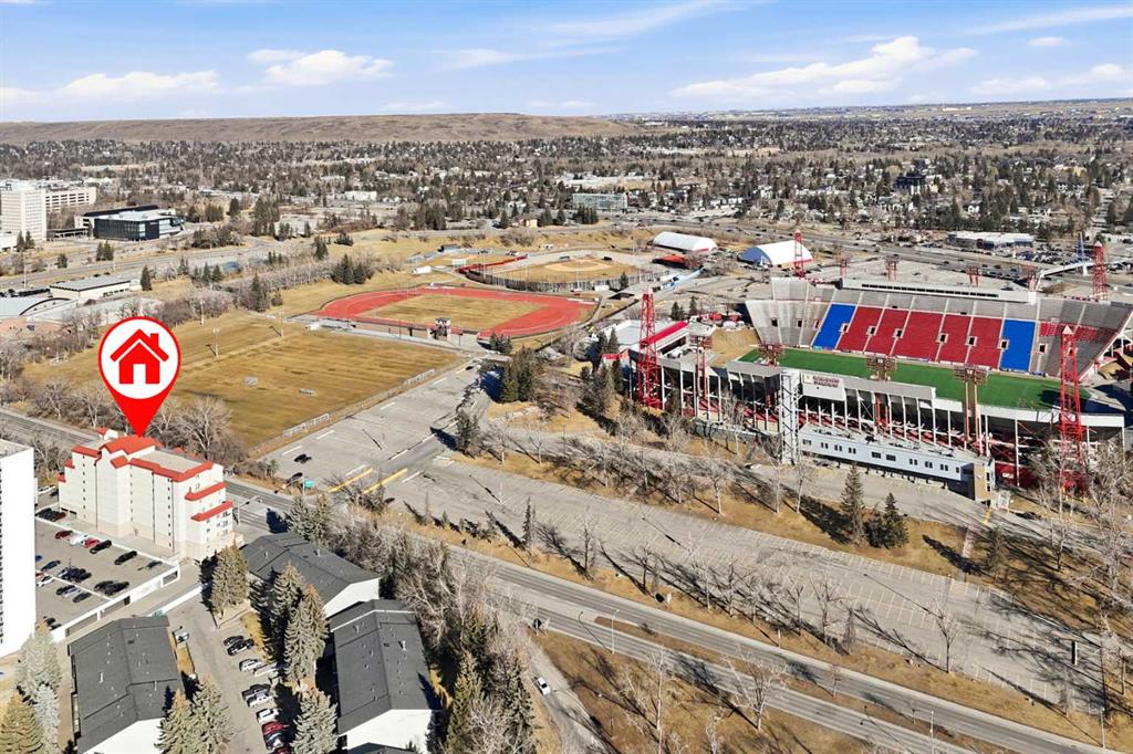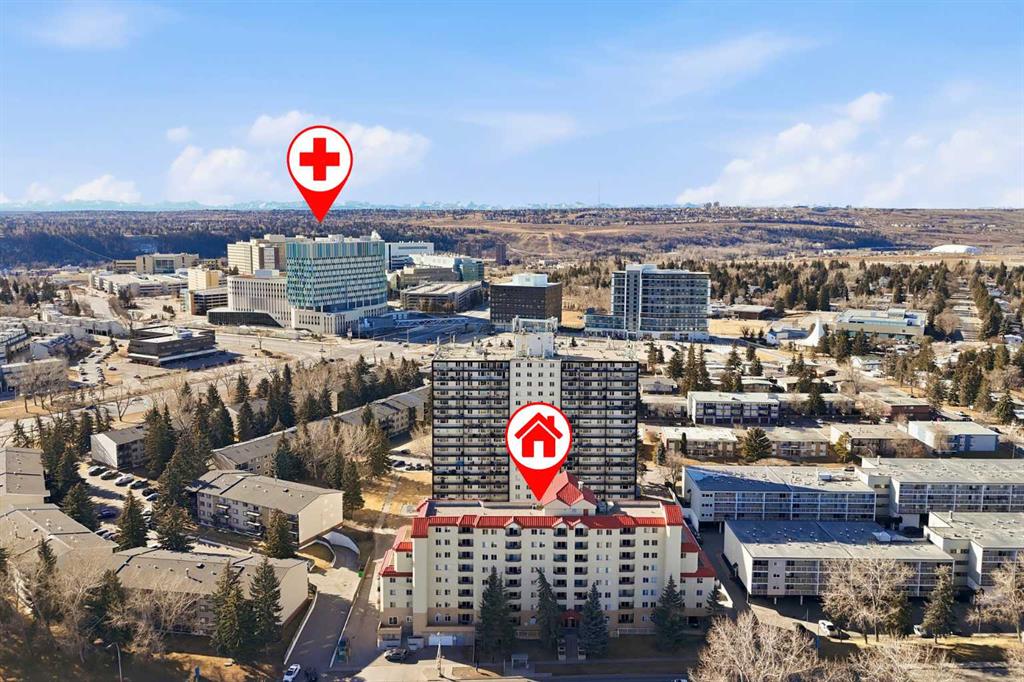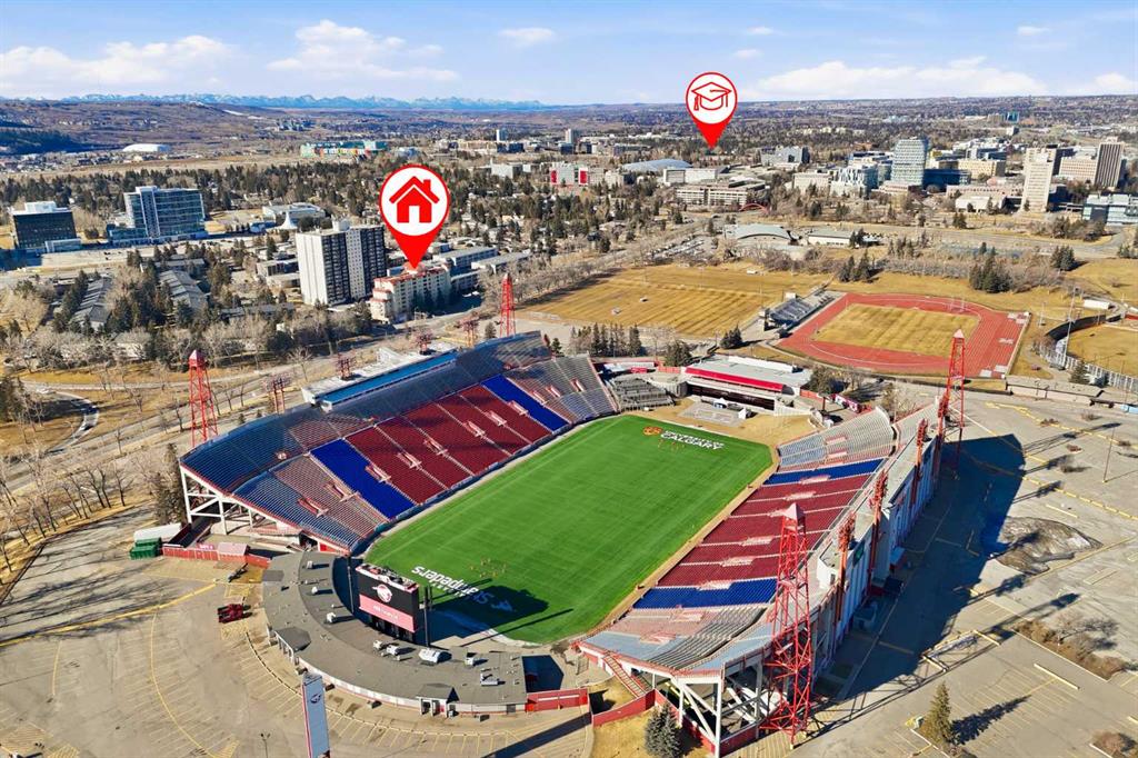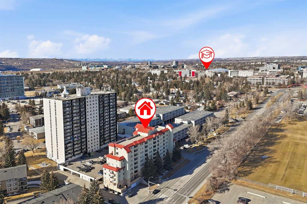 Welcome to the Laureate! Don’t miss this outstanding opportunity to own in one of NW Calgary’s most connected & convenient locations. Just steps from the University of Calgary, McMahon Stadium & Foothills Medical Centre, this bright & well-maintained 2-bedroom, 2-bathroom condo offers over 930 sq ft of functional living space in a solid concrete building—ideal for homeowners, students, or investors alike. Situated on the 6th floor, this east-facing unit enjoys morning sun & open views from the covered balcony overlooking Foothills Athletic Park & McMahon Stadium. The elevation is high enough to significantly reduce traffic noise while still keeping you connected to the energy of the area. Inside, the layout is both practical & inviting, featuring ceramic tile & luxury vinyl tile flooring (2023), most walls freshly painted (2023), & recently painted kitchen cabinetry (2023). The kitchen has been thoughtfully opened up by removing overhead cabinets above the sink, creating a brighter, more seamless flow between the kitchen & dining area. Stainless steel appliances, breakfast bar seating, generous pantry storage & space for a full dining table make this a flexible & functional space for everyday living or entertaining. The large, sunny living room opens directly to the balcony through patio doors, extending your living space outdoors. The primary bedroom includes a great walk-in closet & private 4-piece ensuite, while the second bedroom is generously sized, also has a large closet & is located near the additional full 4-piece bathroom—perfect for guests, roommates, or a home office. Added conveniences include stacked laundry, a dedicated in-unit storage room, large closets, & garbage/recycling just down the hall on the 6th floor. This well-managed concrete building is quiet, offers two elevators, an updated & spacious lobby, secure FOB entry, & visitor parking. Unit 604 includes an assigned parking stall in the heated, enclosed parkade—an invaluable feature during Calgary winters. The location truly sets this property apart. Walk to campus, catch a game or concert, or commute with ease thanks to immediate access to transit & major routes including Crowchild Trail, Trans-Canada Highway & Memorial Drive. You’re minutes from SAIT, Market Mall, Brentwood Shopping Centre, Kensington, Bow River Pathway, Confederation Park & Nose Hill Park. Downtown & 17 Ave SW are just a 15-minute drive, & you can be in the mountains in under 90 minutes. Whether you’re attending U of C, looking for a turnkey move-in ready home, or searching for a strong rental property in a high-demand location, this clean, updated unit offers exceptional value in the heart of the city. Book your showing today!