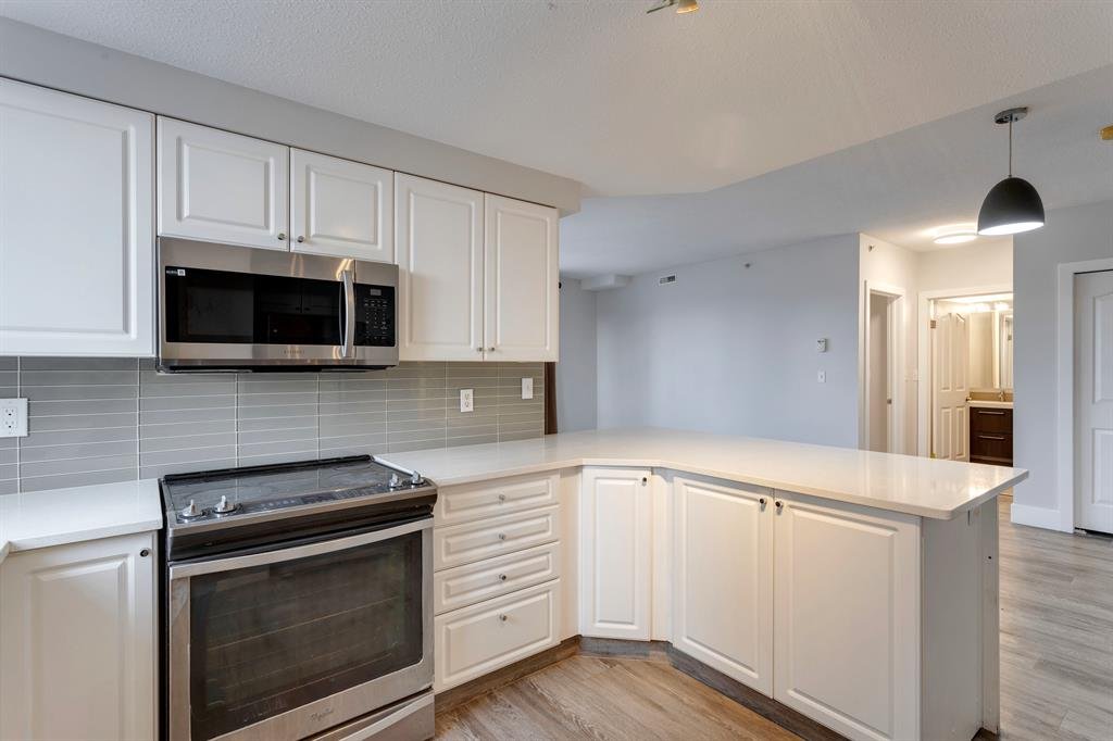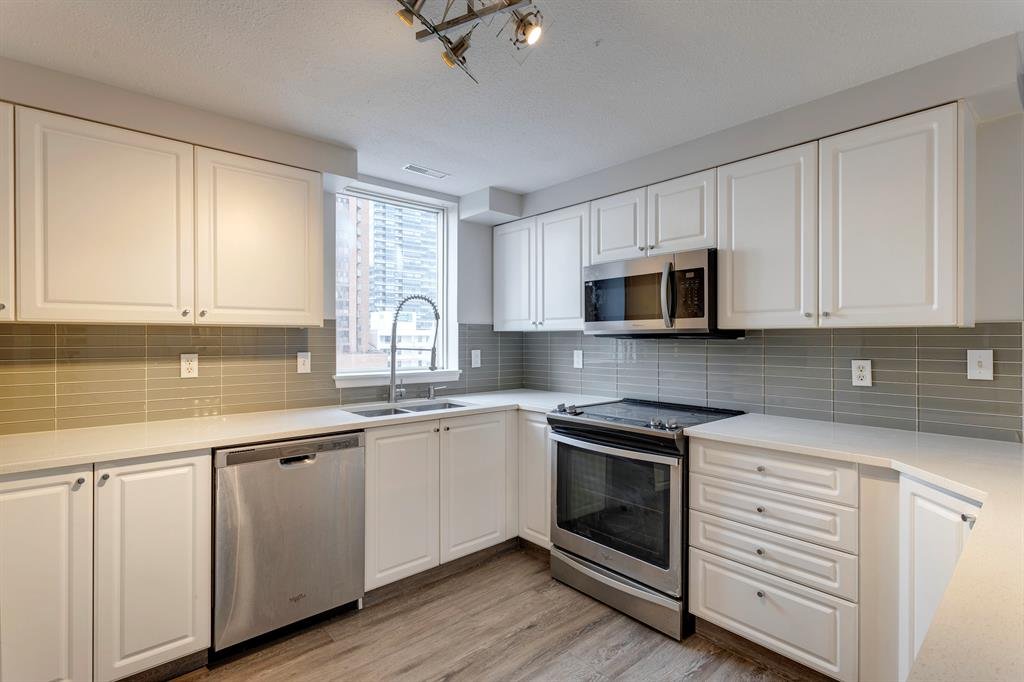 Available for immediate Possession! Freshly painted, substantially renovated 2 bedroom, 2 bathroom corner unit in Downtown West End. Very spacious, open concept with bright sunny west exposure & lovely river valley plus downtown views. Low maintenance laminate flooring throughout. Large peninsula kitchen with modern white cabinetry, quartz countertops, breakfast bar, stainless appliance package & a lovely window over the kitchen sink! Steps to the C-train free fare zone. This building offers security, concrete construction, underground parking plus fitness room. Walk to Kensington in 10 minutes, enjoy the Bow River pathway, restaurants and shops.