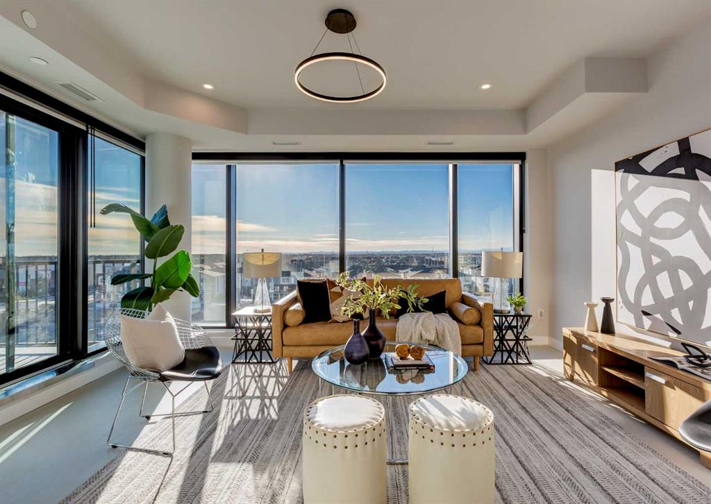 Welcome to this brand-new corner-unit condominium in the Plaza, located in the award-winning West District, where modern design meets an exceptional urban lifestyle. This bright and beautifully designed home features 9-foot ceilings and expansive windows that flood the space with natural light throughout the day. With the main living area and primary bedroom facing south, the home enjoys incredible sunshine, while the east-facing balcony and second bedroom overlook the stunning central patio below. The open-concept floor plan is ideal for both everyday living and entertaining. The contemporary kitchen is finished with quartz countertops, a gas range, and a built-in refrigerator, seamlessly blending style and functionality. The layout offers two spacious bedrooms and two well-appointed bathrooms, along with a large laundry room with excellent storage, a rare and highly desirable feature. Plaza offers exceptional building amenities, including a fully equipped fitness centre and an inviting owners’ lounge complete with arcade games and a pool table. Additional conveniences include a dedicated dog wash and a car wash. The home also includes heated underground parking, modern finishes throughout, and thoughtful design details that set this residence apart. Just steps from your door, enjoy boutique shopping, some of Calgary’s best dining and cafés, and the beautifully designed Central Park. The corner-unit position is truly the standout feature, offering exceptional light, privacy, and views making this a rare opportunity to own in one of Calgary’s most sought-after communities.