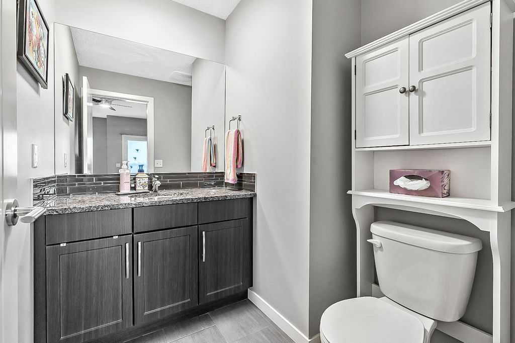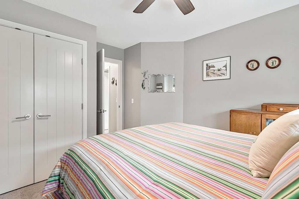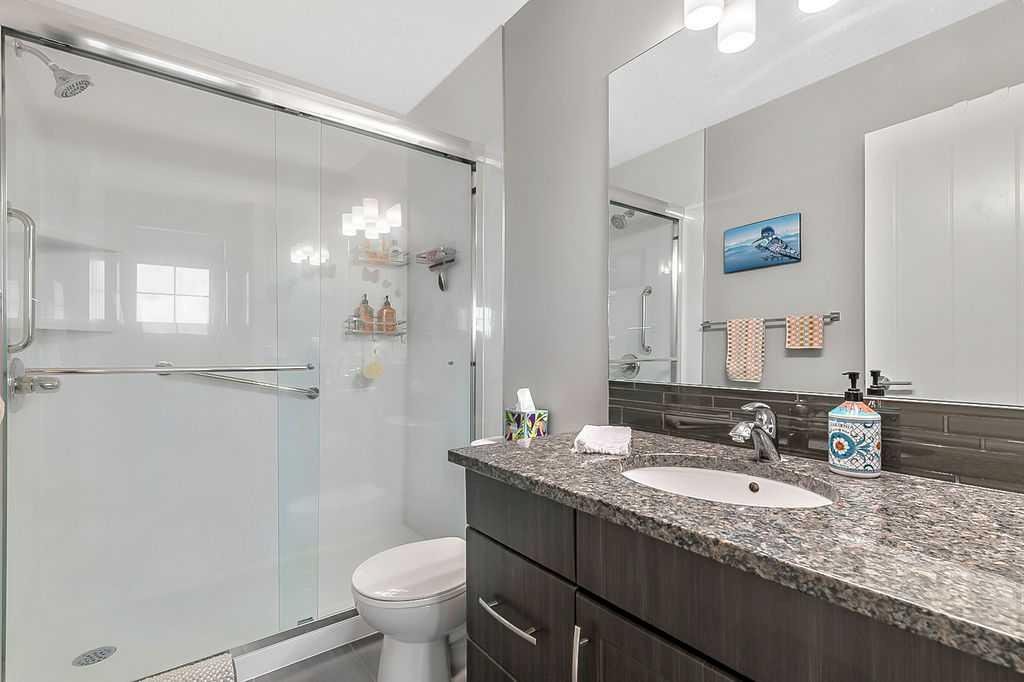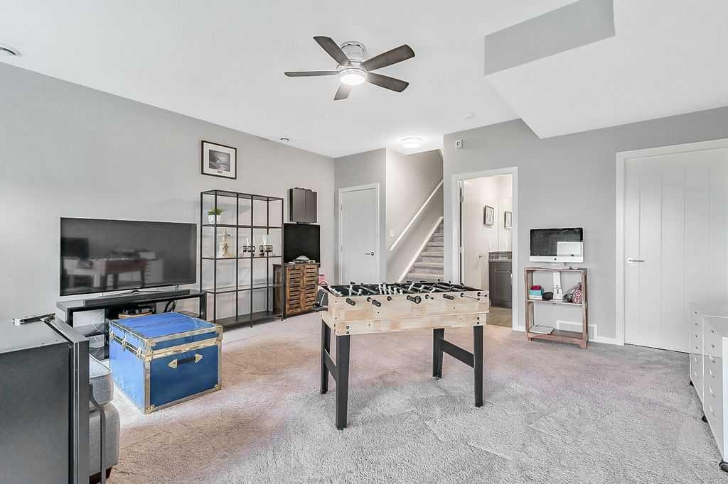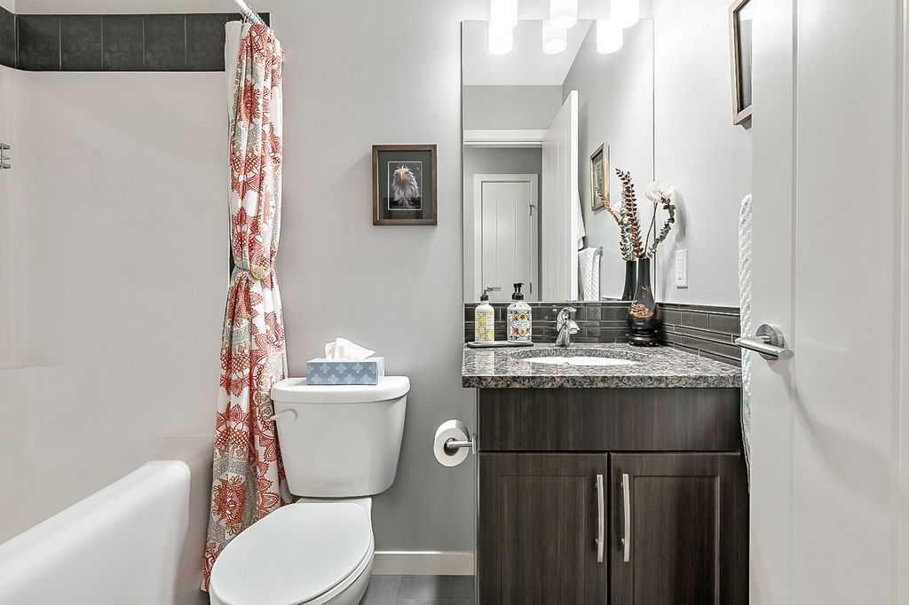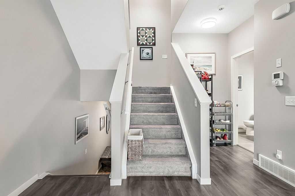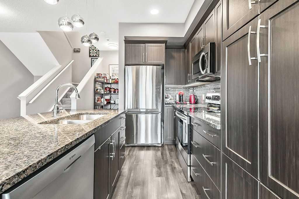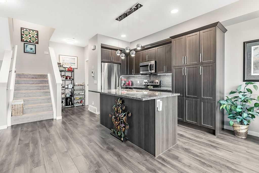 Welcome to this meticulously maintained 3-bedroom, 4-bathroom three-level split townhome; offering over 1,800sqft of beautifully developed living space in the desirable community of Sunset Ridge. Step inside to an open-concept main floor featuring 9’ ceilings and rich plank flooring throughout. The gourmet kitchen is sure to impress with stainless steel appliances, granite countertops, tiled backsplash, custom cabinetry and a large central island that seamlessly overlooks the spacious living room — perfect for both everyday living and entertaining. A separate dining area provides access to the west-facing balcony, where you can unwind while taking in stunning mountain views. A convenient 2-piece powder room completes this level. The second level offers two generously sized bedrooms and a well-appointed 4-piece bathroom; ideal for family or guests. Retreat to the entire third level dedicated to the oversized primary suite, featuring breathtaking west-facing mountain views, a large walk-in closet, additional storage and a private 3-piece ensuite with an oversized walk-in shower. The conveniently located laundry area with custom cabinetry adds to the functionality of this upper level. The fully finished walk-out basement expands your living space with a large family room, 2-piece bathroom, and ample storage—perfect for a media room, home office, or guest space. Additional features include a single attached garage with epoxy flooring and custom storage, alarm system, blackout blinds and updated lighting throughout. Ideally located close to schools, parks, shopping, and with easy access to main roadways, this home offers the perfect blend of comfort, style, convenience and lifestyle.