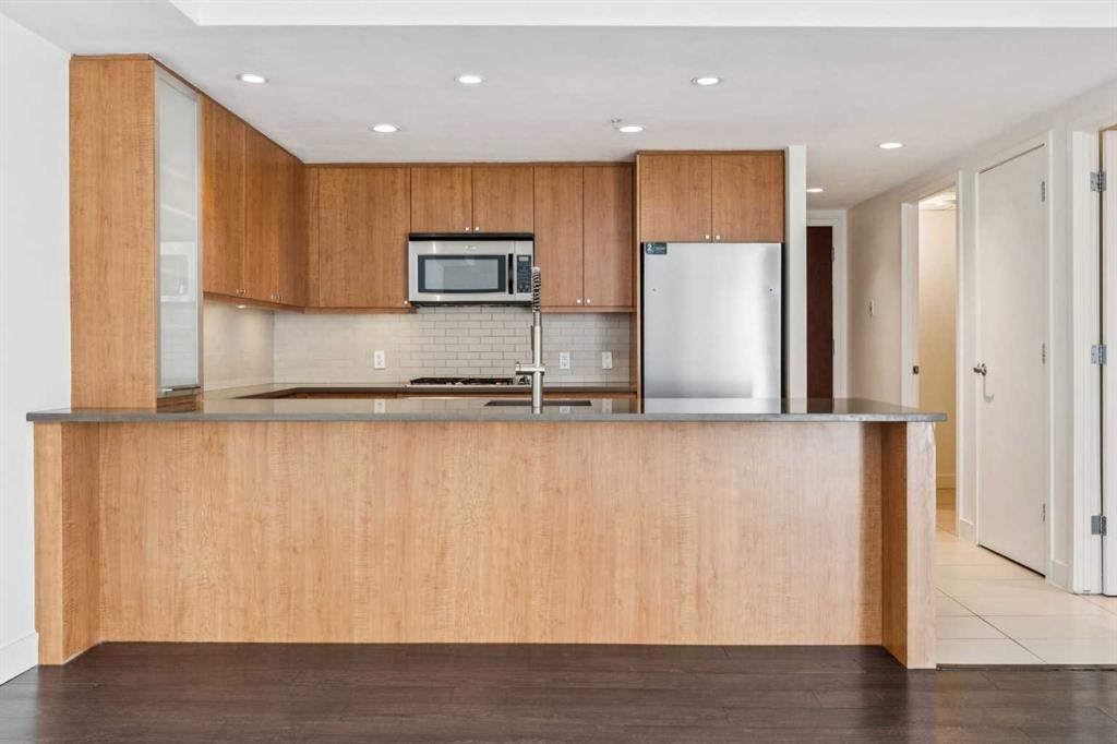 An efficient open-concept layout seamlessly connects the kitchen, dining, and living areas. The U-shaped kitchen is equipped with a gas cooktop, oven, microwave hood fan, refrigerator, dishwasher, tiled backsplash, ample cabinetry, and a breakfast bar island. Sliding doors from the living room open onto a generously sized balcony. floor-to-ceiling windows complete the bright bedroom and living room. The den/storage provides excellent flexibility to set up an office. Refrigerator is brand new.