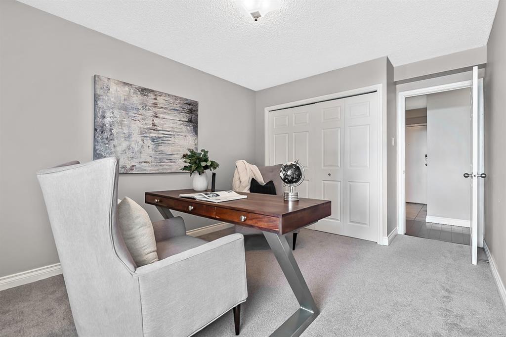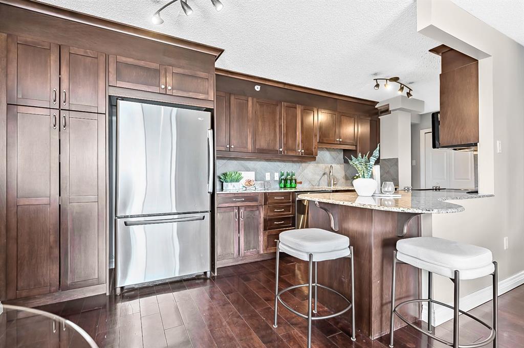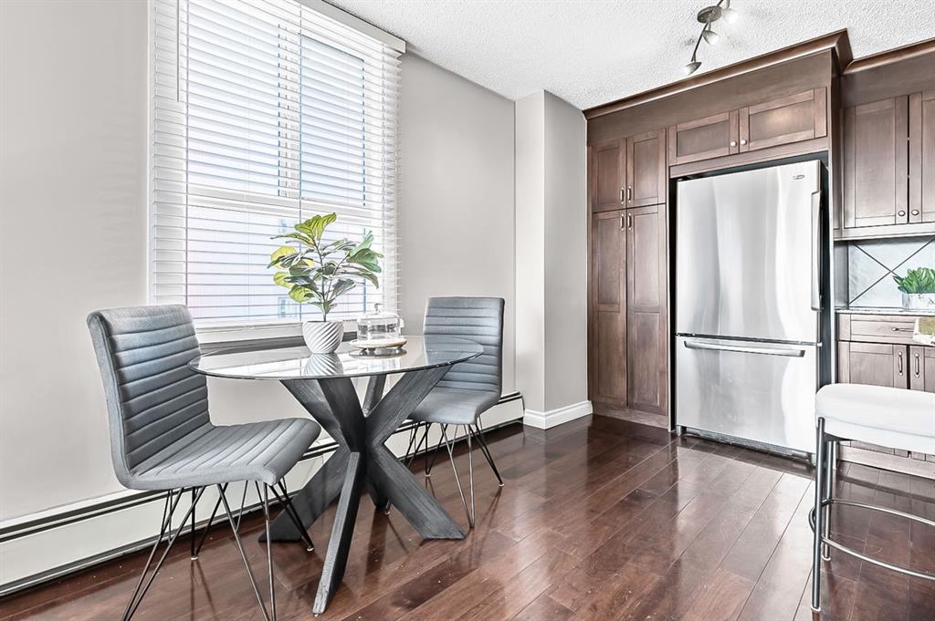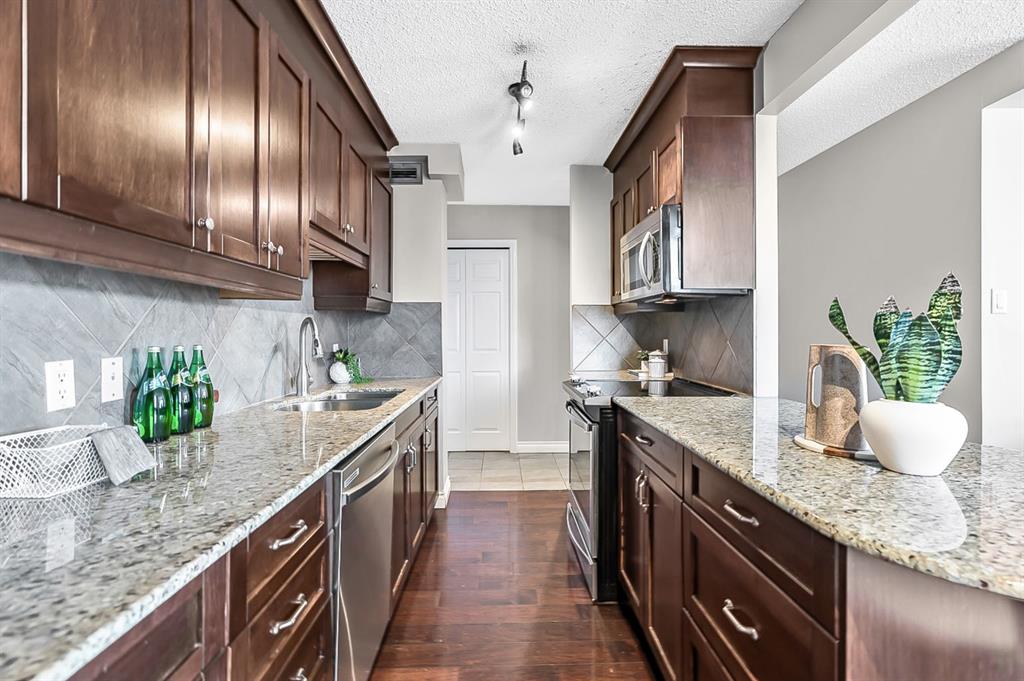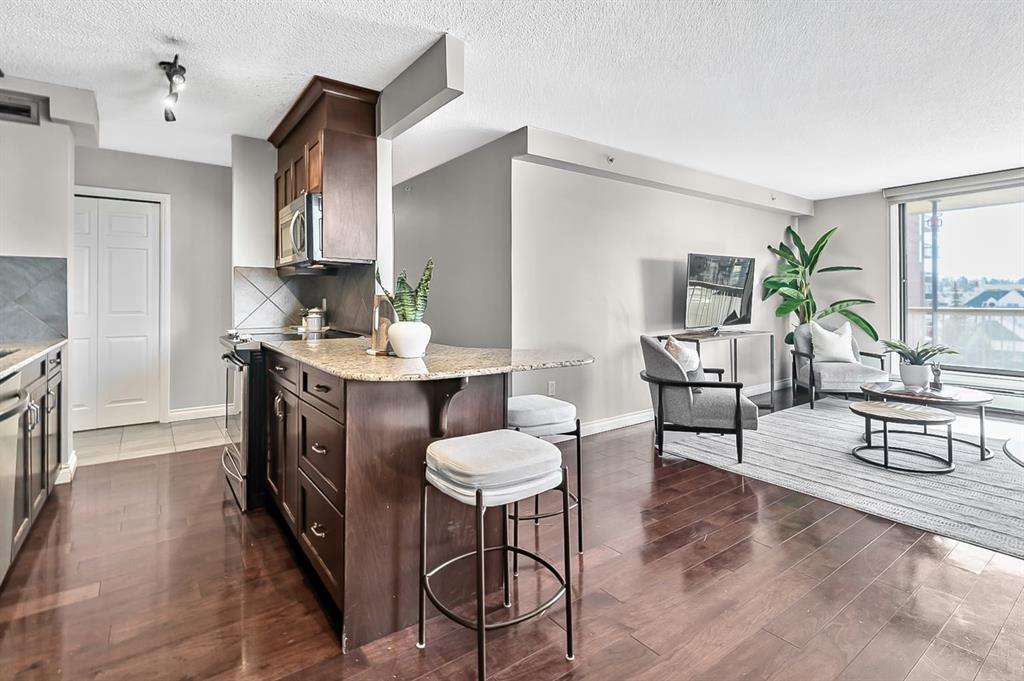Inner city convenience meets budget friendly value at the Grosvenor House in the Beltline. This CORNER unit offers South and West exposures drawing in the natural light! As you enter this well-maintained UPDATED residence you will notice the functional layout and gleaming hardwood floors. The kitchen is a focal point with dark maple cabinets that reach to the ceiling, a tile backsplash, upgraded stainless steel appliances, gorgeous granite counter, and a cabinet pantry with pull outs for additional storage. This looks onto the dining room and a well sized living room. The expansive patio is off the living room creating a great indoor-outdoor space for entertaining. Offering over 150 sq ft of outdoor living space, and UNOBSTRUCTED VIEWS. This sun-drenched patio is ideal for BBQing, gatherings, relaxing and enjoying the outdoors. The main bath is tucked away for privacy, has stone counters, and a deep soaker tub/shower combo. There is a well sized secondary room along with a spacious primary offering plenty of room for a king-sized bed. In addition to this enjoy a large in-suite storage room with a euro washer & dryer, plenty of room for a freezer or seasonal items. This home also comes with one titled, underground heated parking stall, as well as a communal rooftop patio on the 2nd floor. This pet friendly building has new windows and a walk score of 97 along with a bike score of 98. Enjoy walking distance to the Co-op Grocery store, community foods, boutique stores, parks and playgrounds, the excellent culinary scene on 17th Ave. View the virtual tour or call to book your private showing today!