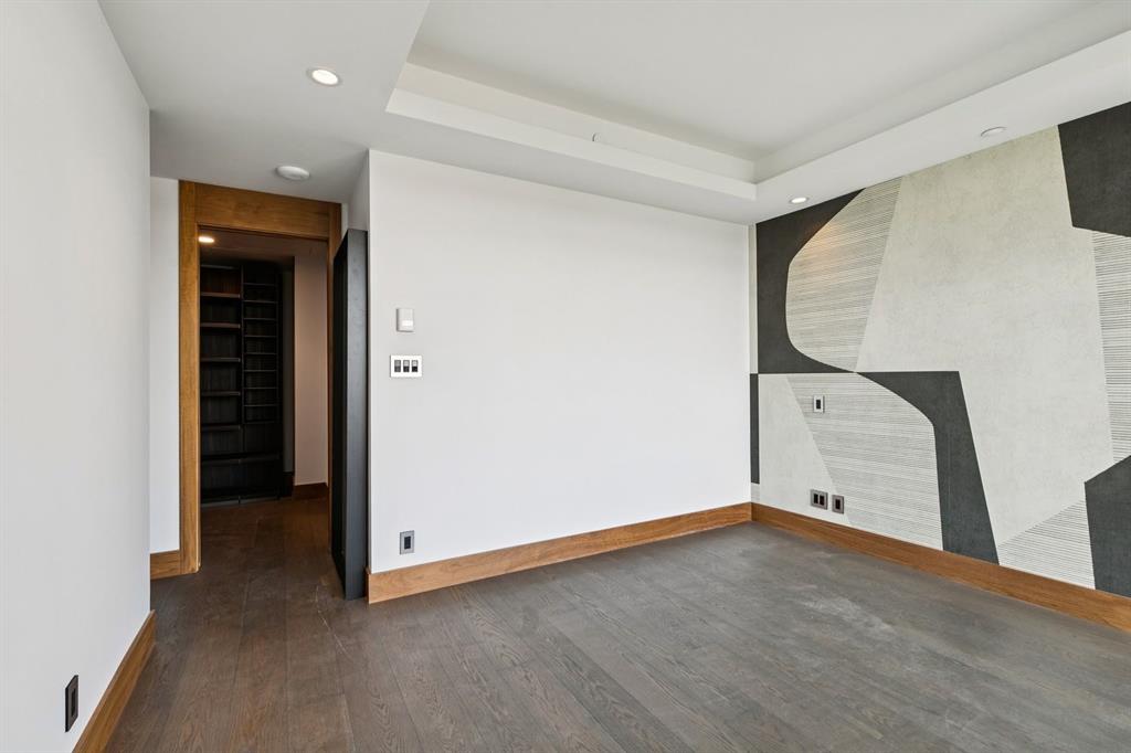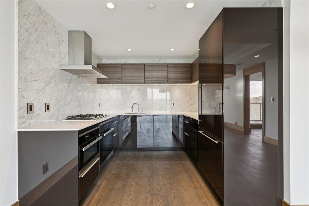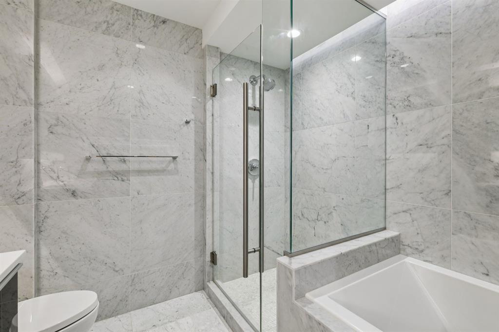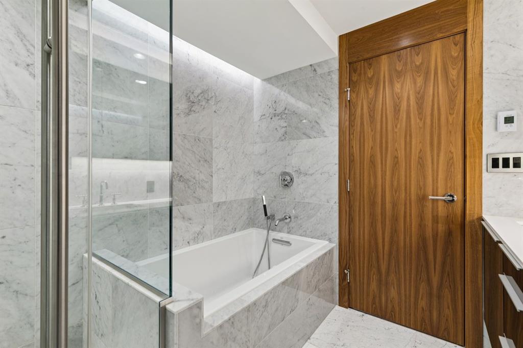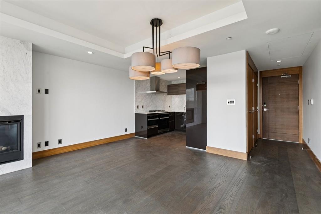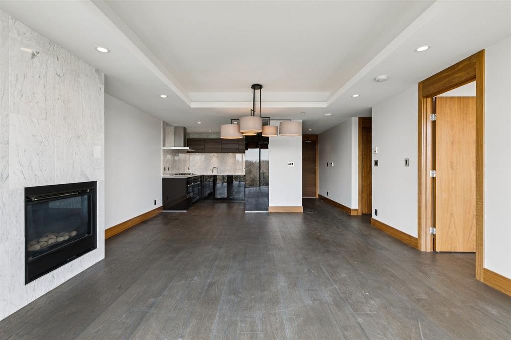 This unit includes a decorative gas fireplace for cozy evenings, a separate laundry area with plenty of shelving and storage, and luxurious touches like electric heated bathroom floors and hardwood flooring in the main areas, complemented by marble tile in the bathrooms. Built-in speakers and a keypad on the front door add convenience and style to your living experience.