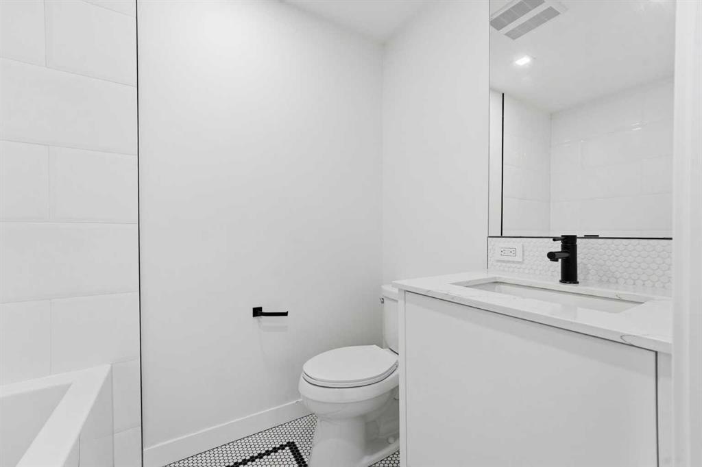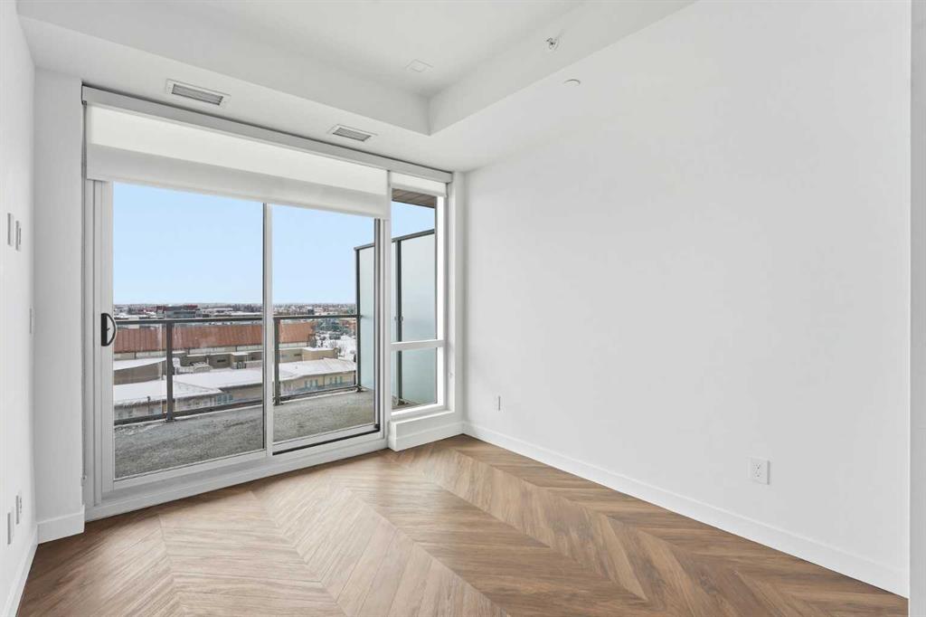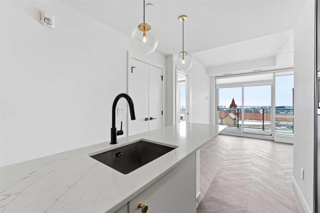 Welcome to Gateway by TRUMAN, perfectly positioned in Calgary’s vibrant, master-planned West District. Built with concrete construction, this residence delivers refined design, elevated finishes, and effortless urban living. This 2-bedroom, 2-bathroom condo with titled underground parking showcases chevron wide-plank flooring, designer lighting, and smooth flat-painted ceilings for a clean, contemporary aesthetic. Expansive floor-to-ceiling windows flood the interior with natural light and frame impressive city views, while central air conditioning provides year-round comfort. The chef-inspired kitchen is both striking and functional, featuring matte custom cabinetry, brushed-gold accents, quartz countertops and full backsplash, under-cabinet lighting, and a generous eating bar. Premium appliances include a gas cooktop, wall oven, 36” Fisher & Paykel integrated refrigerator, panelled dishwasher, and statement hood fan. Open-concept living and dining areas extend seamlessly to a private balcony. The primary suite offers a walk-in closet and spa-inspired ensuite complete with quartz counters, mosaic tile detailing, and a glass-enclosed shower. The second bedroom provides versatility as a guest room or home office, with convenient access to a stylish four-piece bath. Additional highlights include in-suite laundry, excellent storage, and secure titled underground parking. Residents enjoy upscale amenities including a rooftop patio, owner’s lounge, concierge service, bike storage, EV charging stations, and visitor parking. Surrounded by parks, pathways, boutique shopping, cafés, and dining, this is elevated urban living in one of Calgary’s most desirable communities.