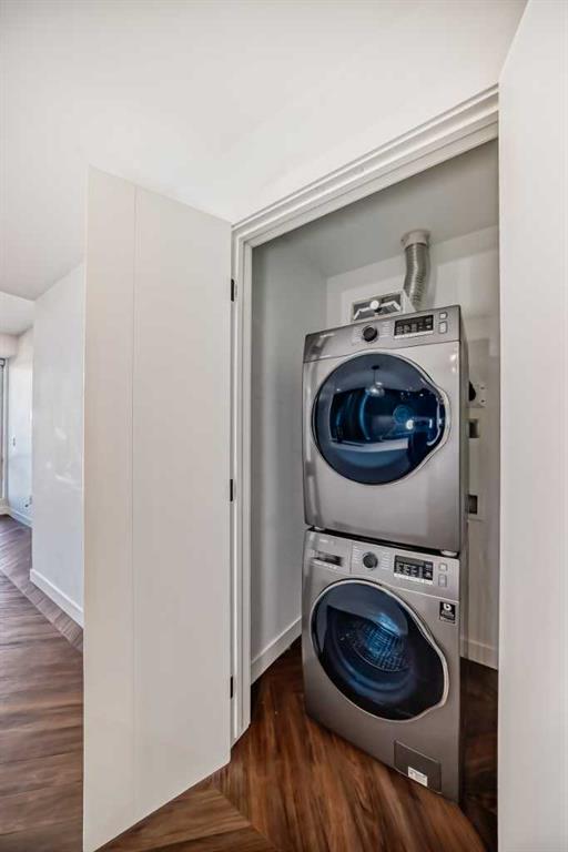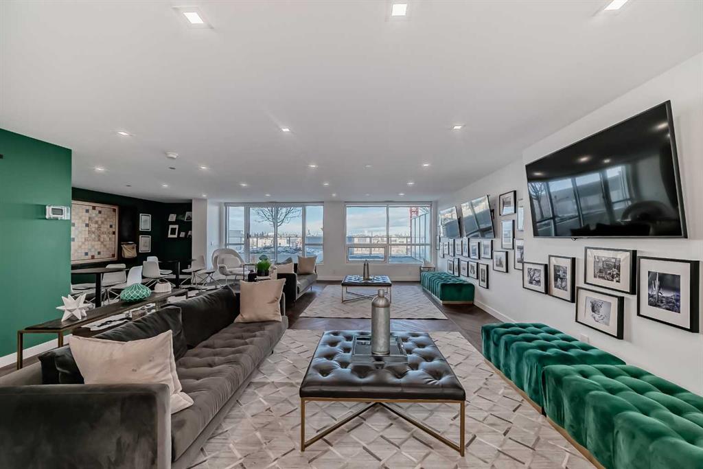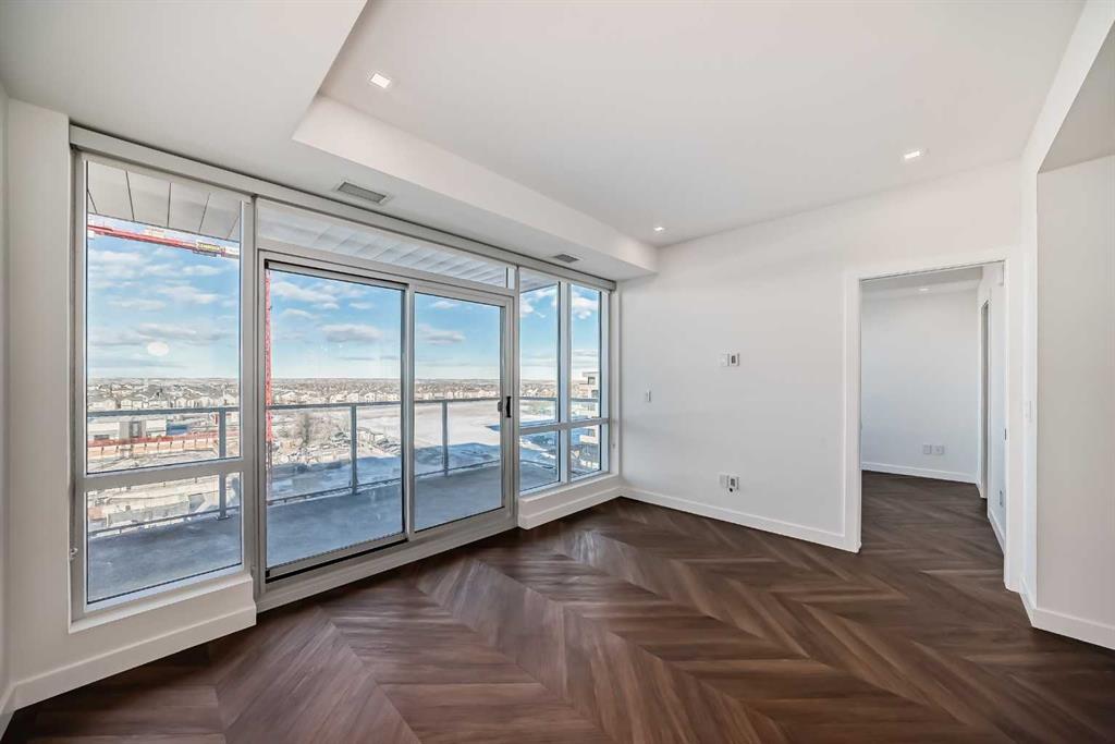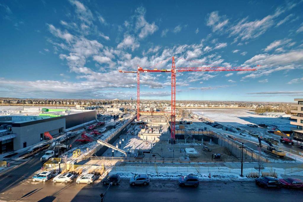 Beautiful 2 bedroom 2 bath condo with mountain views! This condo comes with high end finishings including herringbone flooring, quartz countertops, integrated fridge, floor to ceiling windows, spa-like bathrooms with tile surround shower. The kitchen has an oversized island which allows for seating of 6 people. Cabinets are a beautiful charcoal colour. The living room has huge floor to ceiling windows that offer views of the gorgeous mountains and Calgary. Tons of natural light. The large balcony is covered and has a power outlet and natural gas hookup. The primary bedroom also has floor to ceiling windows with a modern ensuite and walk in closet. Both bathrooms have quartz counters. Pocket doors throughout the unit save space. The location is amazing, close to all amenities, tons of restaurants, cafes, gym and grocery stores. The building is just off Stoney Trail so only 1 hour to Banff and less than an hour to Canmore. 20 minute commute to downtown Calgary! The building has concierge working Mon-Friday in the beautiful lobby. There is a residents lounge in the building which offers tons of space for entertaining and a rooftop terrace.