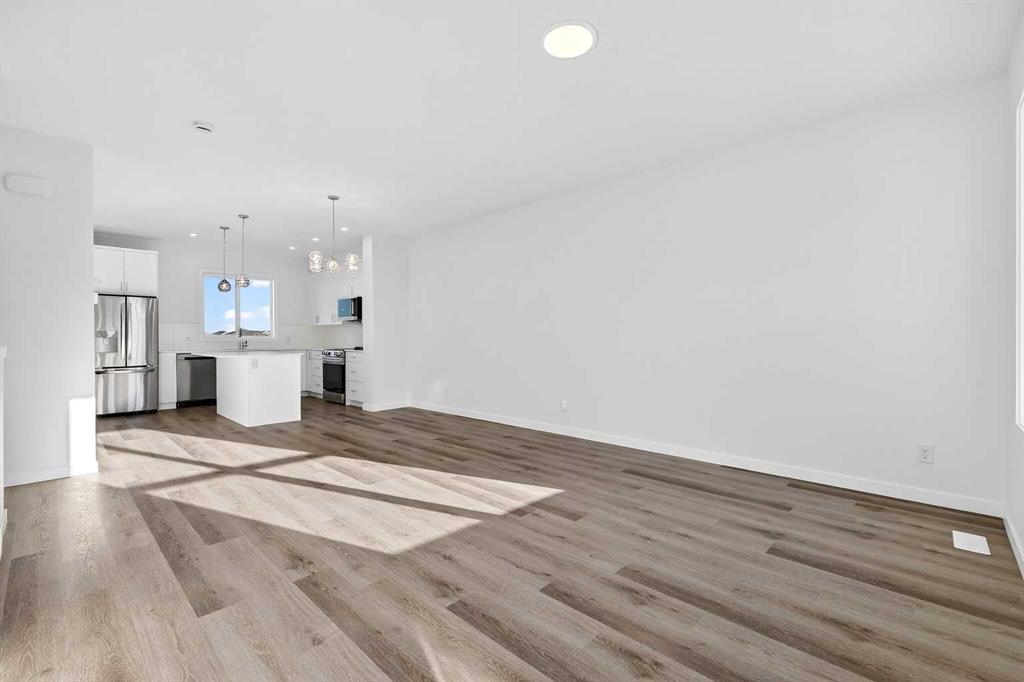 The interior showcases high end craftsmanship, including modern white slab-style cabinetry with a full bank of drawers for maximum storage. The kitchen is further elevated by polished white quartz countertops and a full suite of premium stainless steel appliances. Durable luxury vinyl flooring runs throughout the primary living areas, while the stairs and upper level are finished with plush carpet over an 8lb underlay for superior comfort. Additional conveniences include an attached double car garage, professionally maintained landscaping, and a lifestyle defined by maintenance free living.