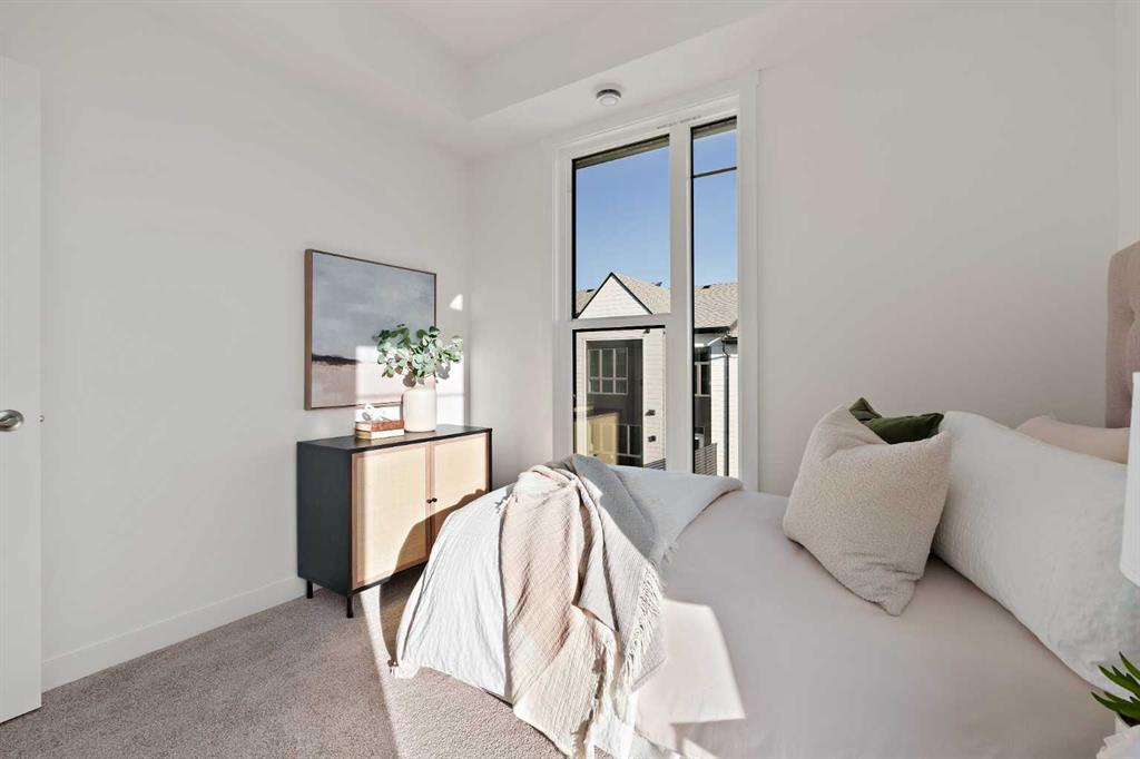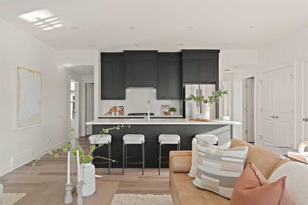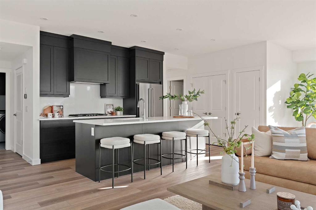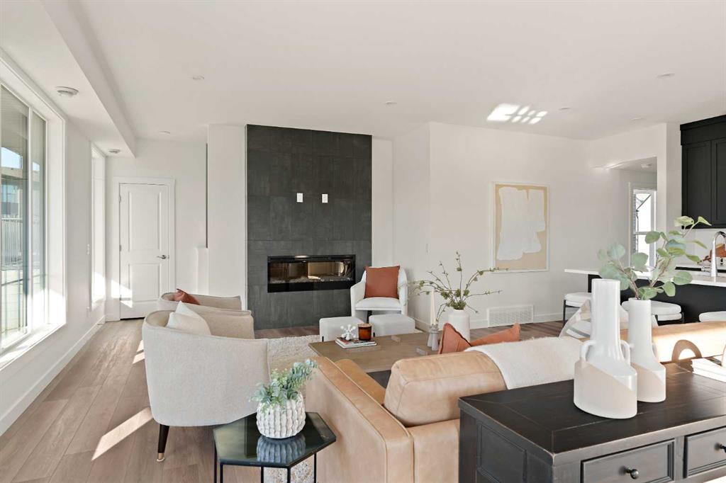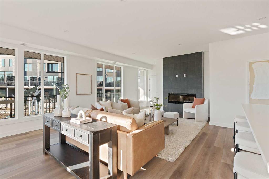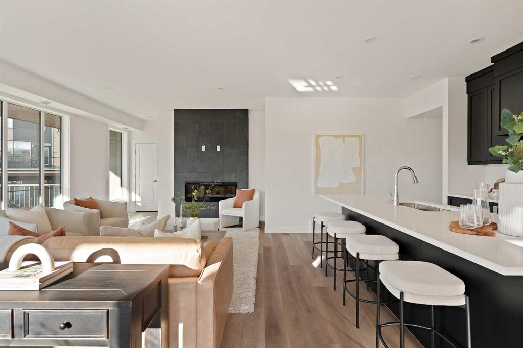 The Hyde at Crown Park is the perfect townhouse for those wanting single-level living without compromise. Featuring 3 bedrooms, 2 bathrooms, and nearly 1,400 ft2 of living space on one level with a private double attached and endless storage space, this home is perfect for those looking to downsize without compromising. Located in the heart of Crown Park overlooking a central park and just minutes from downtown Calgary, this brand new end-unit townhome perfectly combines maintenance-free living within a central urban setting. The beautifully designed main living area has the perfect open-concept design, making it ideal for entertaining and hosting. The kitchen anchors the main living space and opens perfectly to the living and dining areas with a wall of southwest-facing windows flooding the space with natural light. The timeless kitchen is complete with shaker cabinets, quartz countertops, and a suite of built-in appliances including a gas cooktop. The expansive living area has a central fireplace and ample seating space for six+ people, making entertaining a breeze. The large dining area can easily accommodate a table with seating for eight people and includes additional windows for added natural light. The primary suite is located at one end of the property, with laundry providing added privacy between the owner’s suite and secondary bedrooms. A luxurious 4 pc ensuite with dual sinks and a walk-in shower as well as a large walk-in closet complete the primary suite. Two additional bedrooms provide added flexibility, with space for a guest bedroom + home office space or media room, and have their own full bathroom. The main living area is complete with a large laundry room with additional cabinets for storage and a countertop for added convenience. A ~26’x8′ balcony provides the perfect outdoor living space – complete with a gas line, hose bib, and overlooking the park with optimal southwest exposure ensuring you’re maximizing your sun and natural light all year long. The lower level of the property provides access to the oversized private double attached garage and two expansive storage spaces provide the space you’ve been looking for! Located at Calgary’s newest inner-city development, this brand new home provides a lock-and-leave lifestyle without compromise and includes full builder warranty + Alberta New Home Warranty. These rare designs don’t come available often – this is your opportunity to get the bungalow-style home you were looking for that offers single-level living with a private garage and low fees that provide you with a maintenance-free lifestyle.