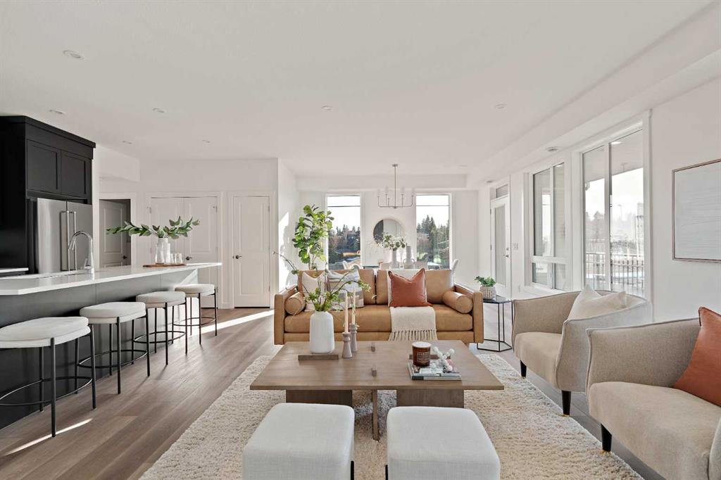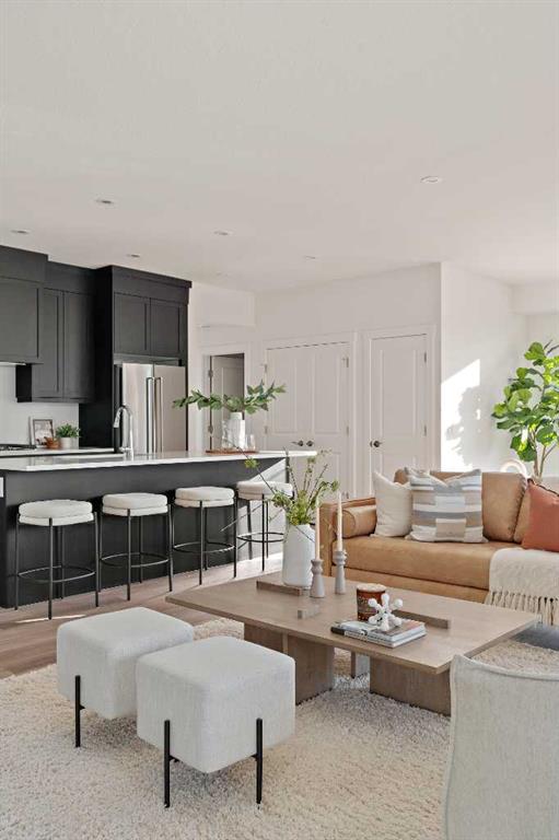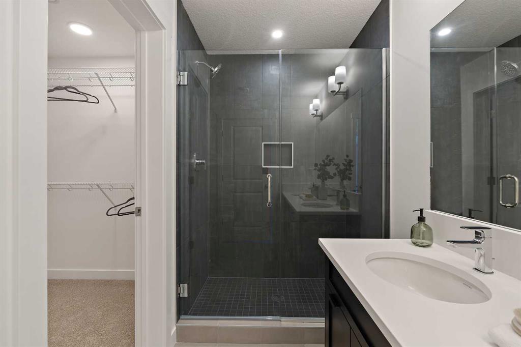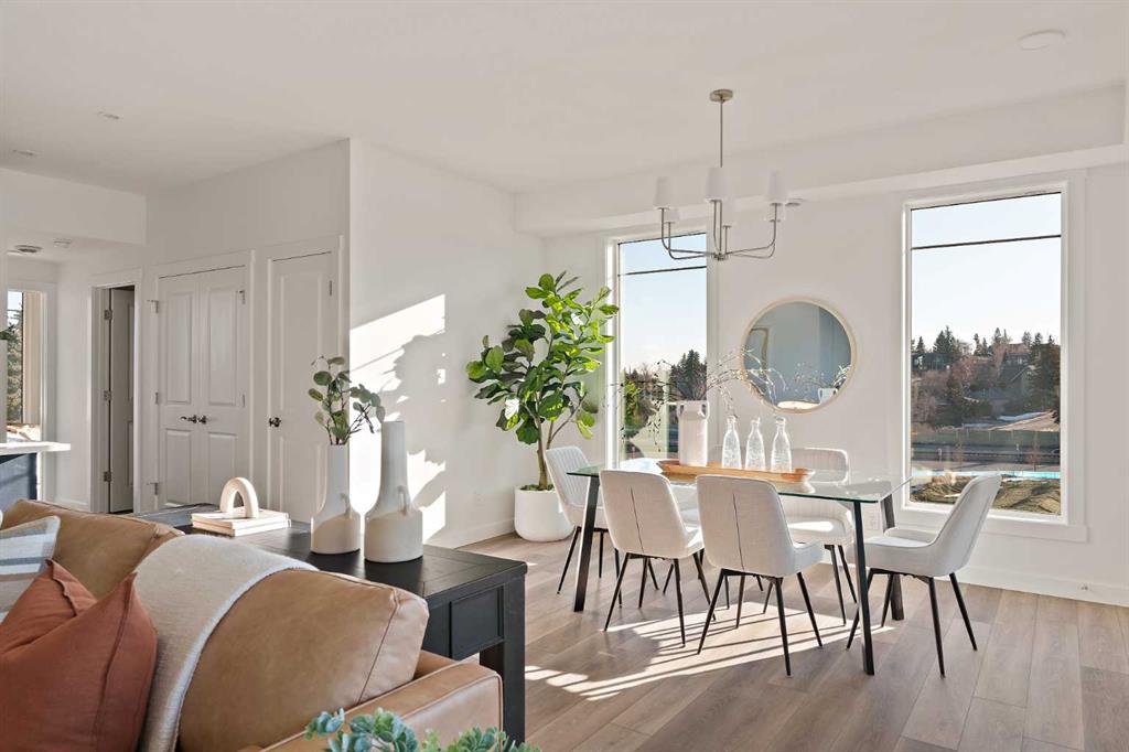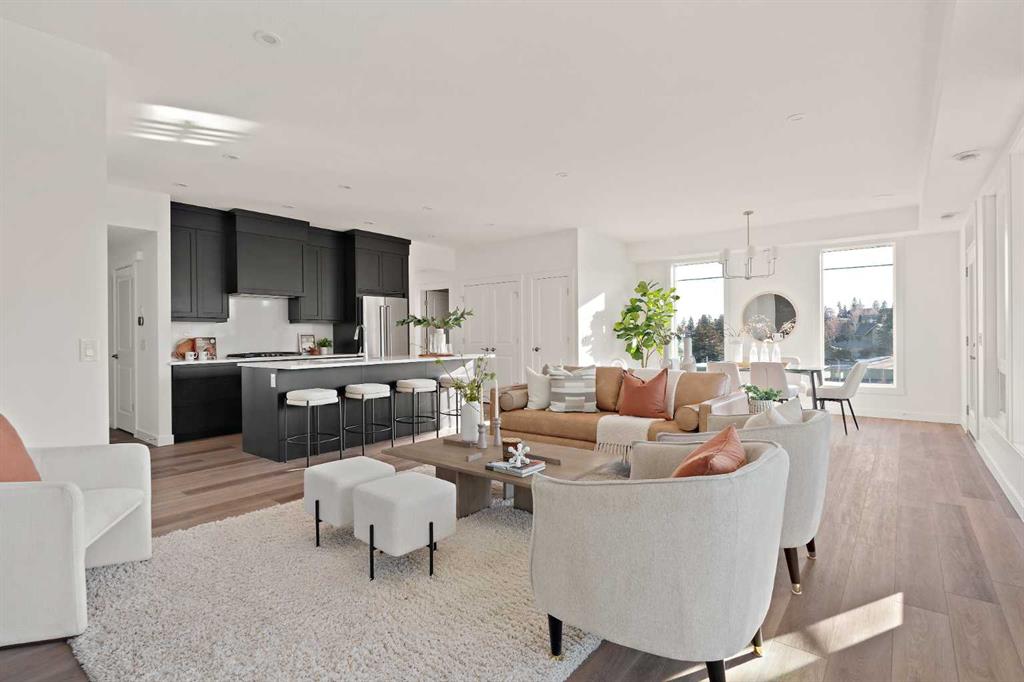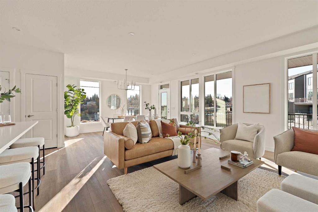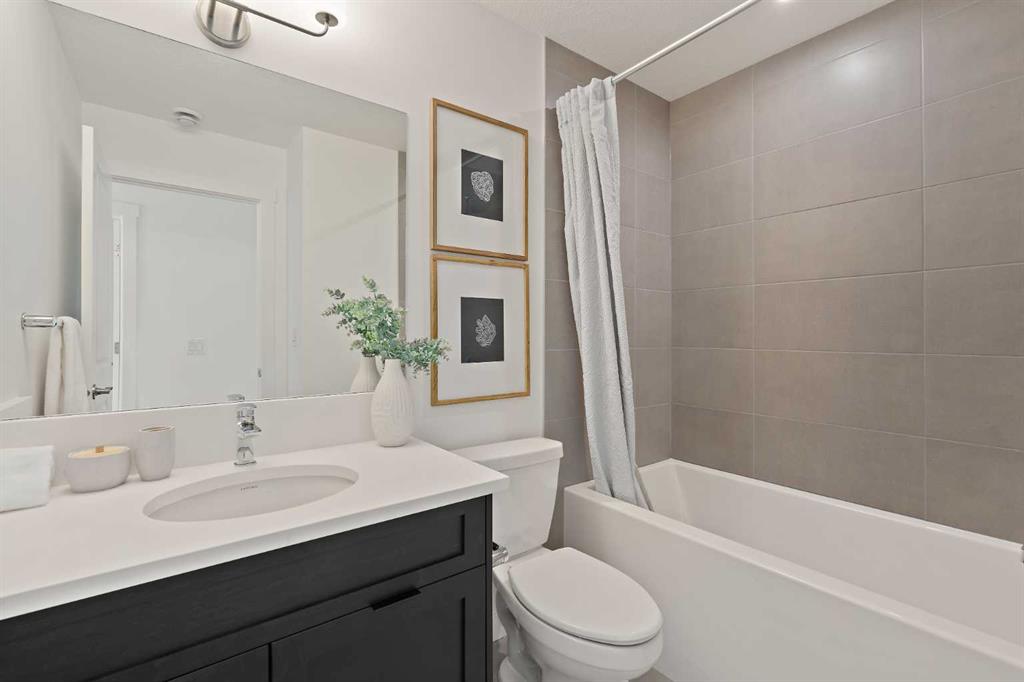 The Hyde at Crown Park is the perfect townhouse for those wanting single-level living without compromise. Featuring 3 bedrooms, 2 bathrooms, and nearly 1,400 ft2 of living space on one level with a private double attached and endless storage space, this home is perfect for those looking to downsize without compromising. Located in the heart of Crown Park overlooking a central park and just minutes from downtown Calgary, this brand new end-unit townhome perfectly combines maintenance-free living within a central urban setting. The beautifully designed main living area has the perfect open-concept design, making it ideal for entertaining and hosting. The kitchen anchors the main living space and opens perfectly to the living and dining areas with a wall of southwest-facing windows flooding the space with natural light. The timeless kitchen is complete with shaker cabinets, quartz countertops, and a suite of built-in appliances including a gas cooktop. The expansive living area has a central fireplace and ample seating space for six+ people, making entertaining a breeze. The large dining area can easily accommodate a table with seating for eight people and includes additional windows for added natural light. The primary suite is located at one end of the property, with laundry providing added privacy between the owner’s suite and secondary bedrooms. A luxurious 4 pc ensuite with dual sinks and a walk-in shower as well as a large walk-in closet complete the primary suite. Two additional bedrooms provide added flexibility, with space for a guest bedroom + home office space or media room, and have their own full bathroom. The main living area is complete with a large laundry room with additional cabinets for storage and a countertop for added convenience. A ~26’x8′ balcony provides the perfect outdoor living space – complete with a gas line, hose bib, and overlooking the park with optimal southwest exposure ensuring you’re maximizing your sun and natural light all year long. The lower level of the property provides access to the oversized private double attached garage and two expansive storage spaces provide the space you’ve been looking for! Located at Calgary’s newest inner-city development, this brand new home provides a lock-and-leave lifestyle without compromise and includes full builder warranty + Alberta New Home Warranty. These rare designs don’t come available often – this is your opportunity to get the bungalow-style home you were looking for that offers single-level living with a private garage and low fees that provide you with a maintenance-free lifestyle.