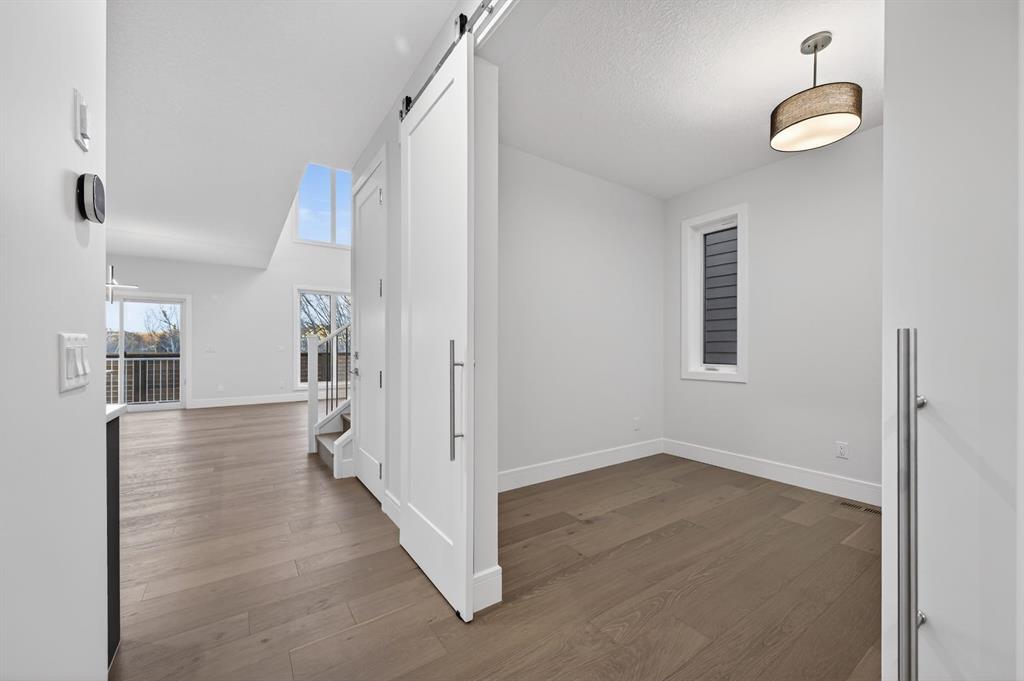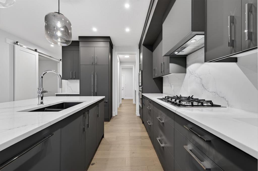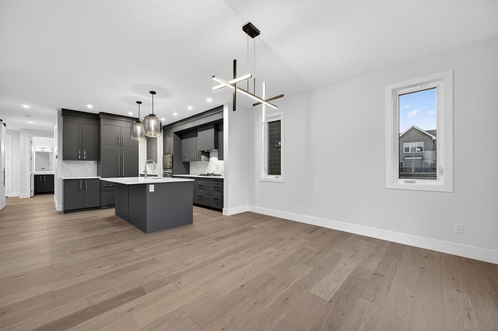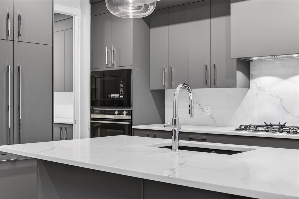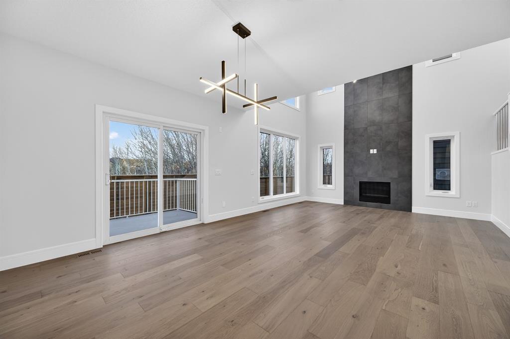 The open-concept main level is anchored by a chef-calibre kitchen featuring full-height custom cabinetry, soft-close doors and drawers, quartz countertops, and a premium integrated appliance package including a panelled refrigerator, gas cooktop, built-in microwave, and wall oven. A walk-in pantry with custom built-ins enhances both aesthetics and functionality. The kitchen flows seamlessly into the open-to-above great room, where dramatic two-storey ceilings create an impressive sense of volume. A gas fireplace with striking floor-to-ceiling architectural detailing serves as a commanding focal point, anchoring the space with warmth and understated elegance—ideal for both entertaining and quiet evenings.