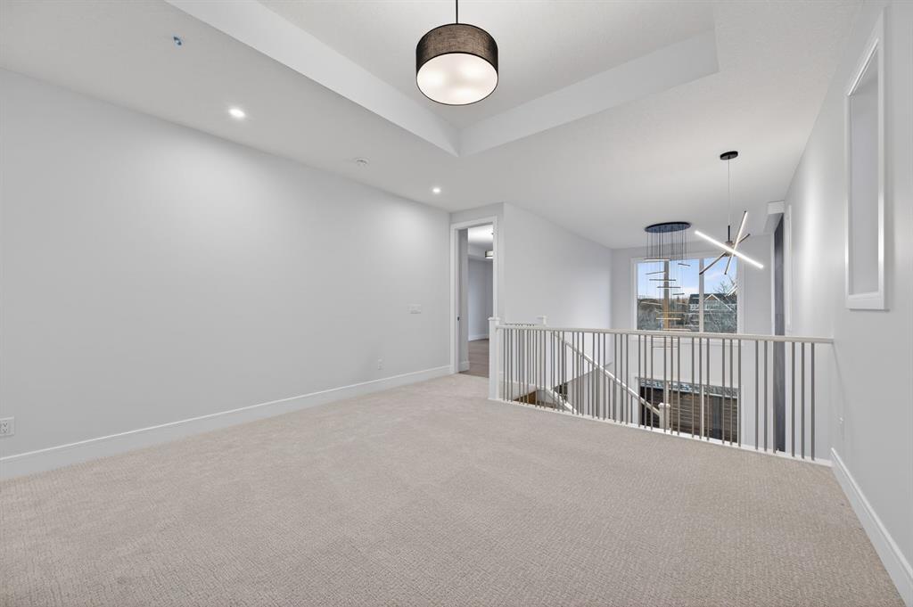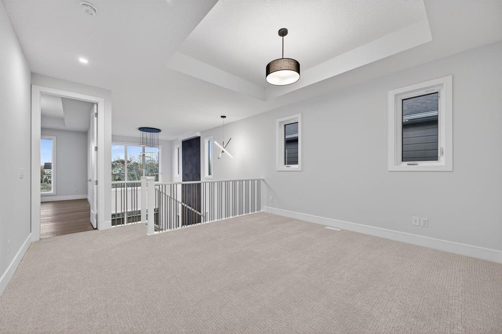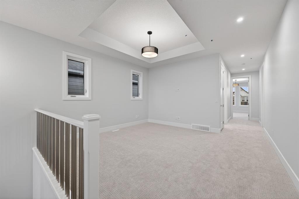 The upper level is distinguished by a primary retreat with tray ceiling, spa-inspired five-piece ensuite, and a generous walk-in closet. A centrally positioned bonus room, two additional bedrooms, a well-appointed four-piece bath, and upper-level laundry offer both comfort and functionality.
