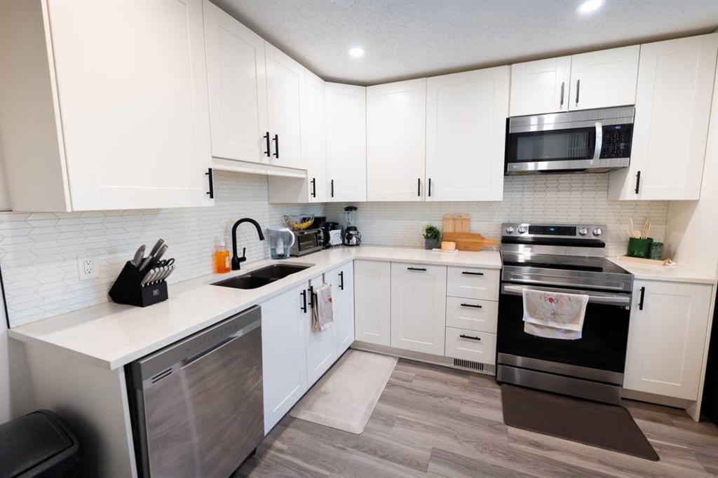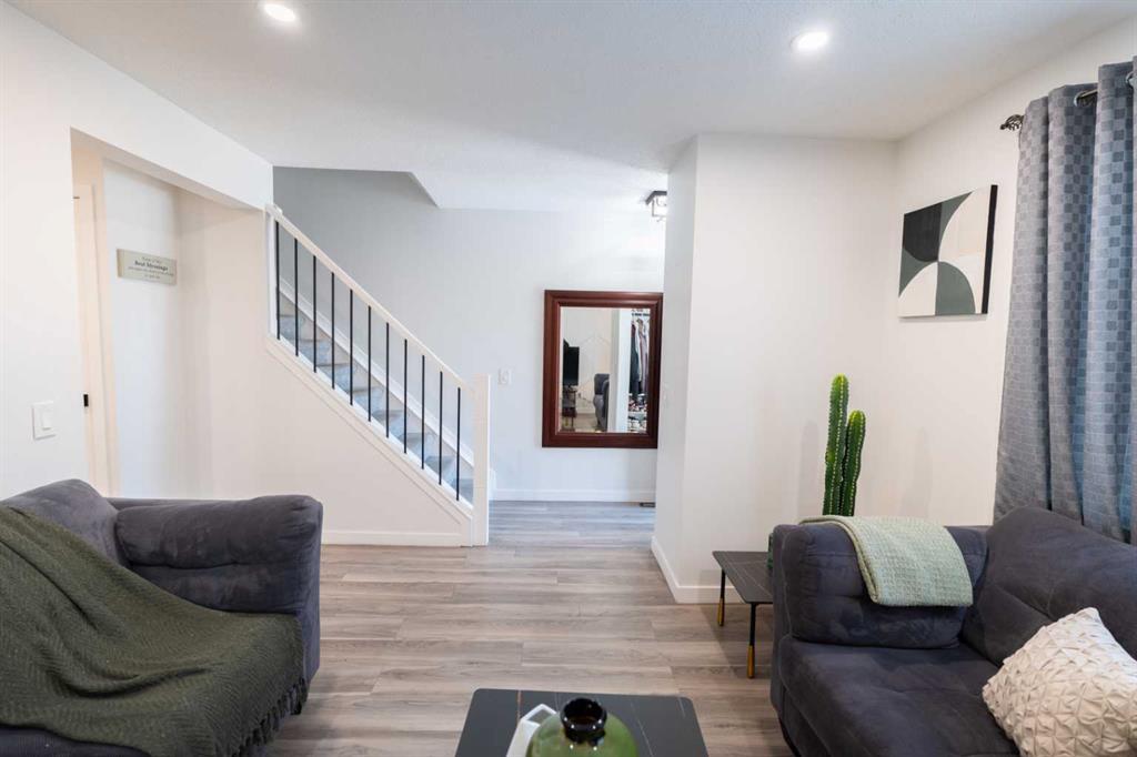 The interior features a modern kitchen with updated cabinetry, stylish tile backsplash, new appliances, and contemporary finishes. The home has been upgraded with new flooring, fresh paint, updated plumbing fixtures, and a renovated bathroom, creating a clean and cohesive look throughout. A custom feature wall adds character and warmth, while the fully finished family room provides additional living space ideal for relaxing or entertaining. The laundry and mechanical room are also fully finished for added convenience.