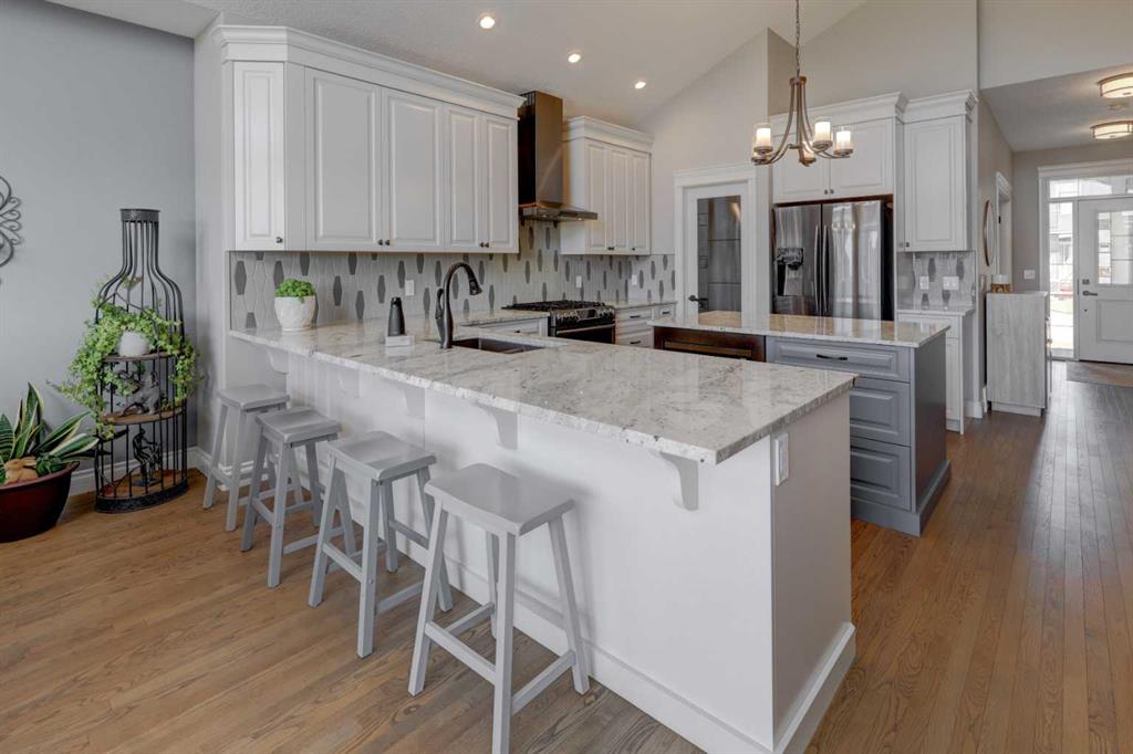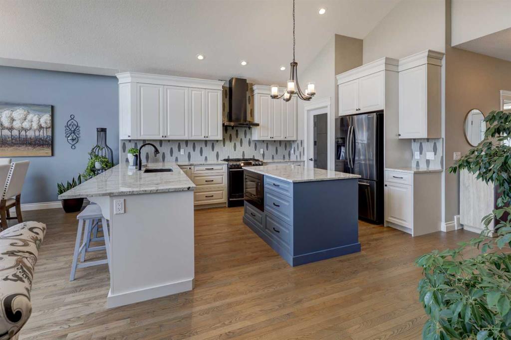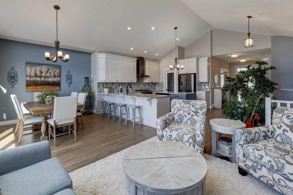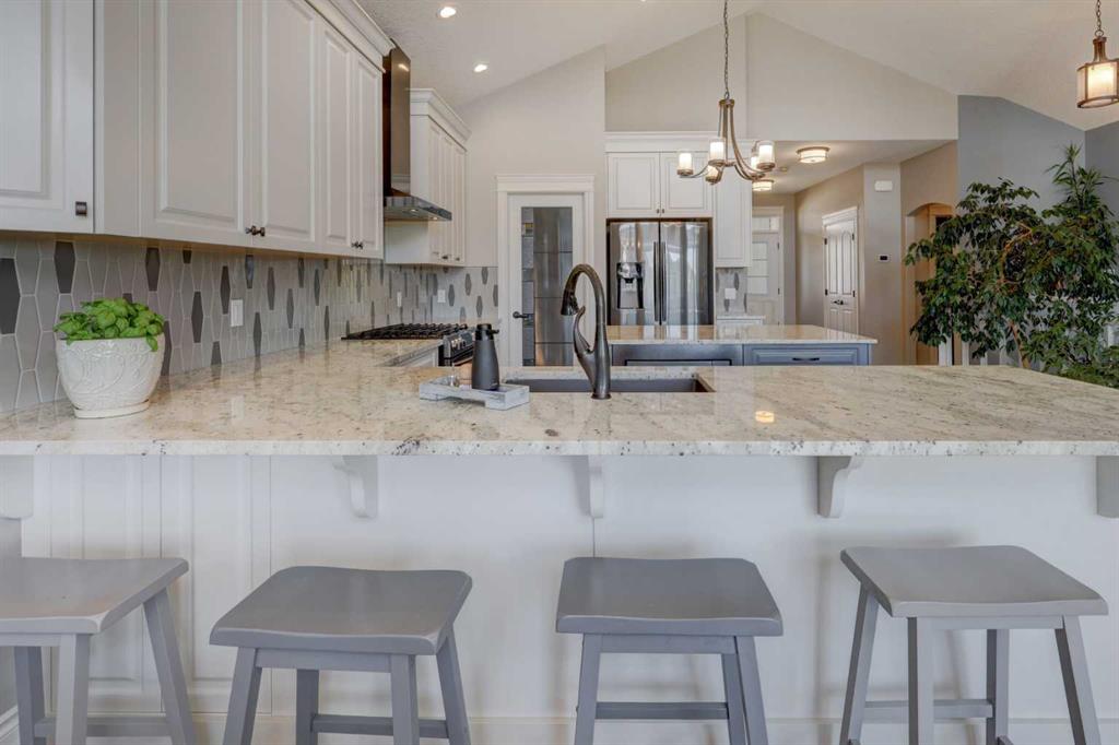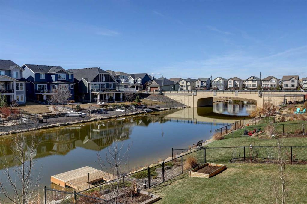 Welcome to this custom built McKee bungalow, proudly offered by the original owner and perfectly positioned on the waterfront in Bayside Estates. Featuring a triple tandem heated garage, this home offers exceptional space for all your vehicles, tools and toys. Step inside to a bright and inviting main floor, showcasing rich hardwood flooring and 9 foot ceilings throughout, complemented by central air conditioning to keep you comfortable year round.. Just off the entrance, a dedicated home office provides the ideal space for remote work or quiet study. As you move further in, the chef-inspired kitchen impresses with custom colors, including cream cabinetry, Black stainless steel appliances, granite countertops with a breakfast bar and a walk-in pantry with an elegant French door. The heart of the home is highlighted by soaring vaulted ceilings and stunning south-facing windows that flood the dining and living areas with natural light. A cozy fireplace creates the perfect ambiance for relaxing evenings. The spacious primary retreat offers a true escape, complete with a luxurious 5 piece ensuite featuring a soaker tub, separate shower, dual vanities and a walk in closet. Step out from the living room onto the expansive upper deck, finished with durable Duradek, where you can take in peaceful waterfront views. A convenient 2-piece bathroom and main floor laundry complete this level. Downstairs, the fully developed walkout basement is designed for entertaining, featuring 9 foot ceilings and a massive recreation and games area with a second fireplace. A custom-built wet bar and kitchenette add both function and flair. This level also includes two additional bedrooms and a 4-piece bathroom. Outside, your private backyard oasis awaits—complete with a concrete patio and direct water access. Whether you’re considering a future dock or simply enjoying the setting, this space is perfect for morning coffee or unwinding with a glass of wine in the evening. Located just a short walk to Nose Creek School (K–4) and close to parks, playgrounds, sports fields, shopping, restaurants, and everyday amenities, this home offers an unbeatable lifestyle. Waterfront. Luxury. Location. This one truly has it all.