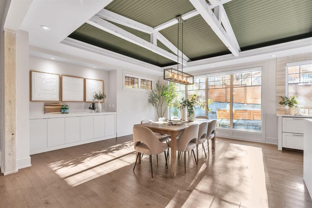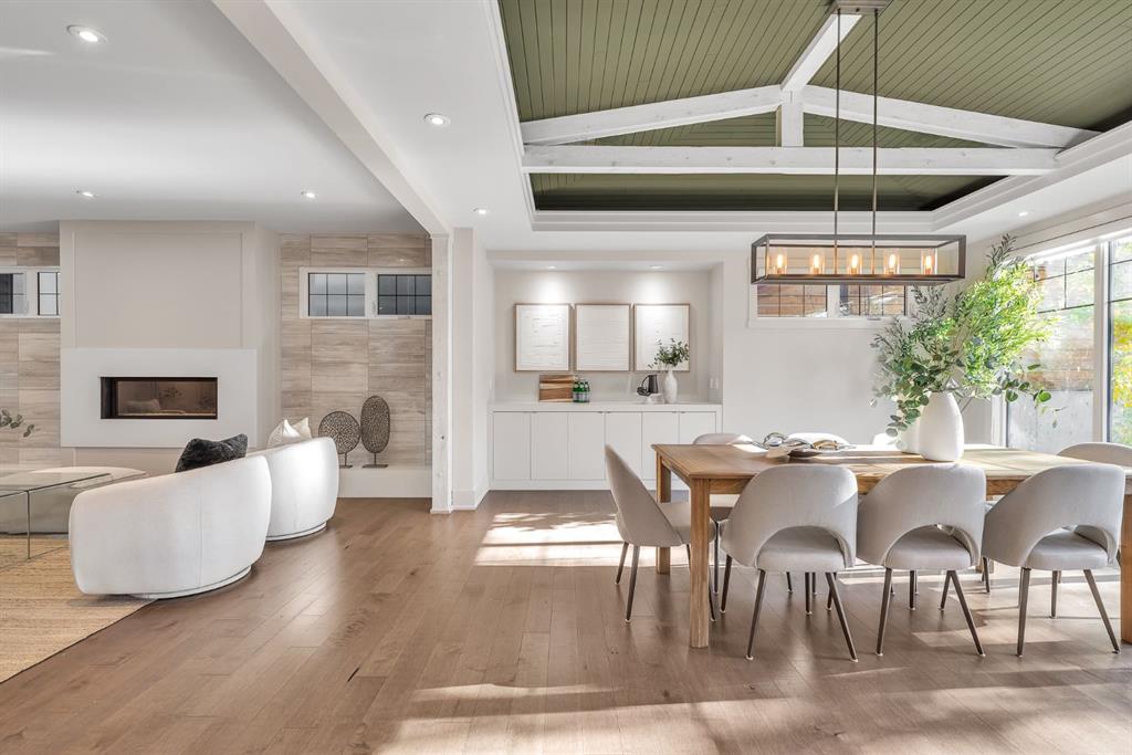 The main level blends warmth and sophistication through its open design and natural textures. Expansive windows flood the home with light, highlighting brushed cashmere hardwood floors, exposed timber accents, and rich custom millwork. The kitchen is a showpiece in both style and function, featuring professional-grade appliances, Caesarstone countertops, an oversized island, and a butler’s pantry with stand-up freezer. The adjoining dining and great room, framed by a gas fireplace, invite effortless entertaining and relaxed everyday living. A well-appointed main-floor office with built-ins provides privacy and focus.