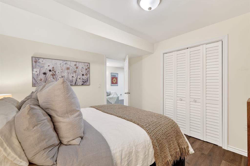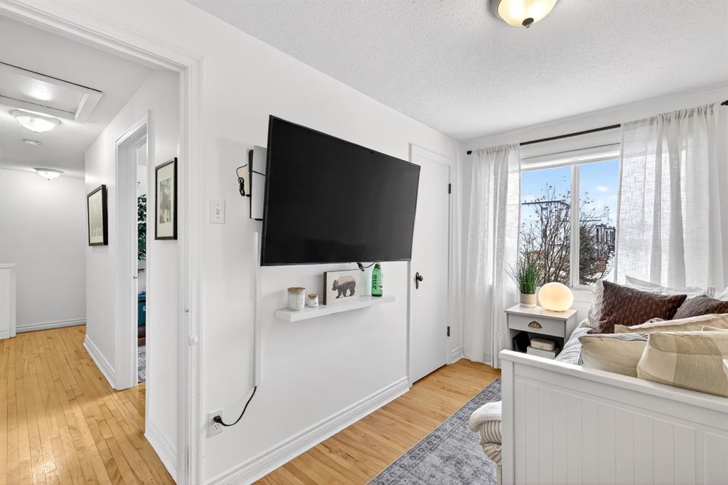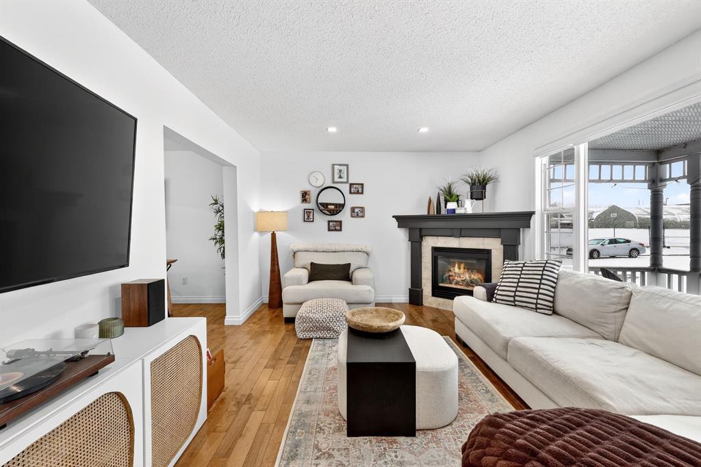 Welcome to this beautifully fully renovated semi-detached home in the established and highly sought-after community of Garrison Woods, perfectly designed for comfortable family living and summer enjoyment. The charming front porch and sun-drenched south-facing backyard create the ideal setting to soak up warm summer days. Step inside to a functional and inviting main floor featuring engineered hardwood flooring, a cozy living room warmed by a gas fireplace, a well-appointed dining area, and a spacious kitchen with breakfast bar, perfect for everyday living and entertaining. Large windows flood the home with abundant natural light.