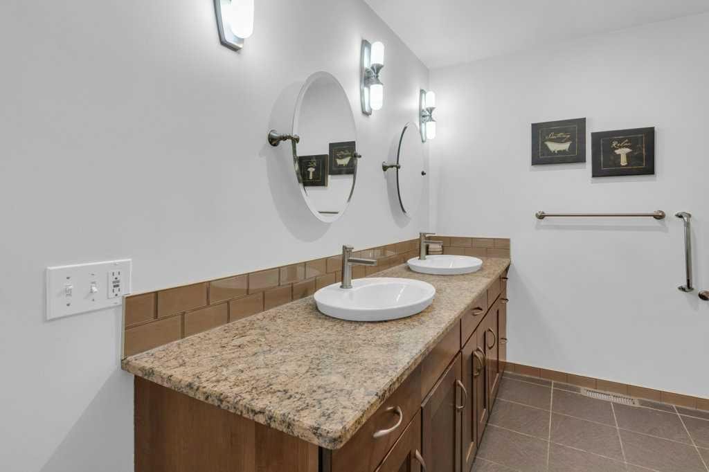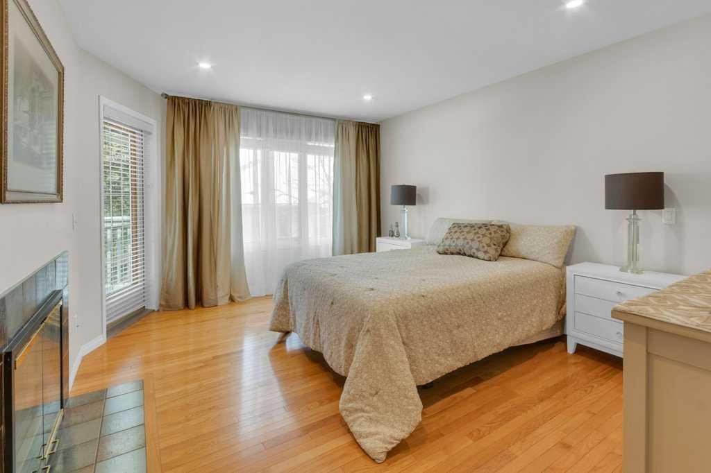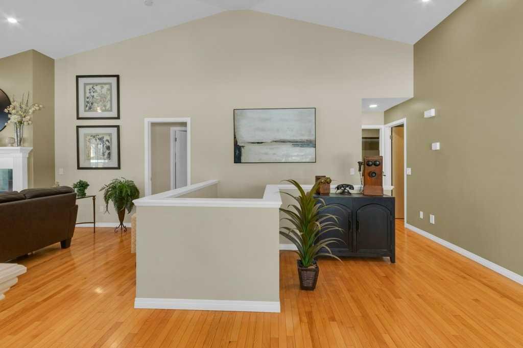The open-concept main floor is highlighted by rich hardwood flooring and soaring vaulted ceilings, creating an inviting space ideal for both everyday living and entertaining. The chef’s kitchen is the heart of the home, featuring a striking 16-foot granite island and abundant cabinetry, seamlessly flowing to the deck with a gas line for barbecuing. A formal dining room and separate nook provide flexible gathering spaces, while the living room showcases a stunning double-sided fireplace shared with the spacious main-floor primary suite. The primary retreat includes a walk-in closet and a luxurious five-piece ensuite. A den/home office, powder room, main-floor laundry, and quality Hunter Douglas blinds to complete the level.