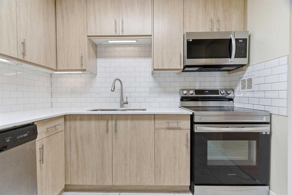 2 BEDROOMS | 1 BATHROOM | 835 SQFT | TOP FLOOR | FULLY RENOVATED | LARGE PATIO | ASSIGNED PARKING | IMMEDIATE POSSESSION | Welcome to this beautifully renovated top-floor condo in the established community of Southwood, offering incredible value and a turnkey, move-in-ready opportunity. With a bright and functional layout, this vacant unit is perfect for first-time buyers, investors, or anyone looking for affordable living in a prime location. Step inside to discover a thoughtfully updated interior featuring wide plank laminate flooring, upgraded tile, and fresh neutral paint throughout. The spacious living room is warm and inviting, complete with a tiled fireplace feature wall that adds character and charm. The open dining area with feature pendant flows seamlessly into the stunning kitchen, showcasing ceiling height cabinetry, quartz countertops, a classic subway tile backsplash, stainless steel appliances, and under-cabinet lighting, perfect for both everyday living and entertaining. The primary bedroom includes a walk-in closet with shelving for optimal organization, while the second bedroom provides flexibility for guests, a home office, or additional living space. The fully renovated bathroom features a quartz vanity with dual sinks and upgraded fixtures, creating a modern and functional space. Step outside to your oversized 17’ x 6’ private patio, complete with an additional outdoor storage area making it an ideal place for enjoying fresh air or relaxing in your own outdoor retreat. You’ll also appreciate the convenience of the outside storage unit in addition to the storage inside the unit. Enjoy the convenience of an assigned parking stall just steps from your door. The complex offers excellent amenities including a fitness centre, party room, visitor parking, tennis and basketball courts, and a playground. As well, the building is well managed with a healthy reserve fund. Located just minutes from Anderson LRT Station, Southcentre Mall, Fish Creek Park, Glenmore Reservoir, and with public transit right outside the complex, this is truly a location that offers both convenience and lifestyle. This is your chance to own a fully renovated, stylish home at an unbeatable price. Why rent when you can own? Book your showing today! Photos have been virtually staged.