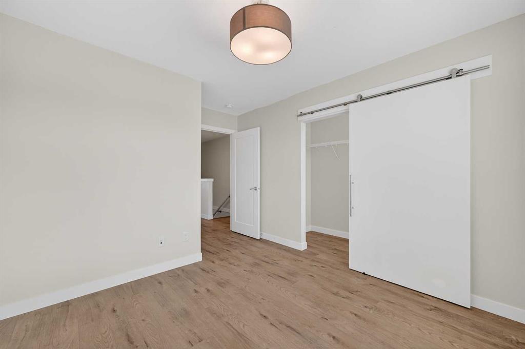 Upstairs, two generously sized bedrooms easily accommodate king-sized beds, each with walk-in closets and stylish barn doors. The home also offers three bathrooms (2 full and 1 half) — a rare and highly practical layout for a two-bedroom townhome that makes daily routines and hosting guests much more comfortable.