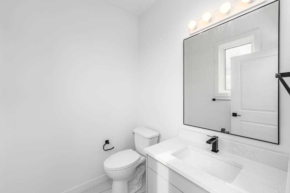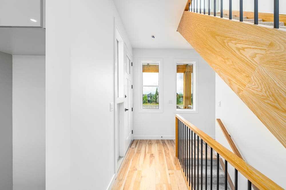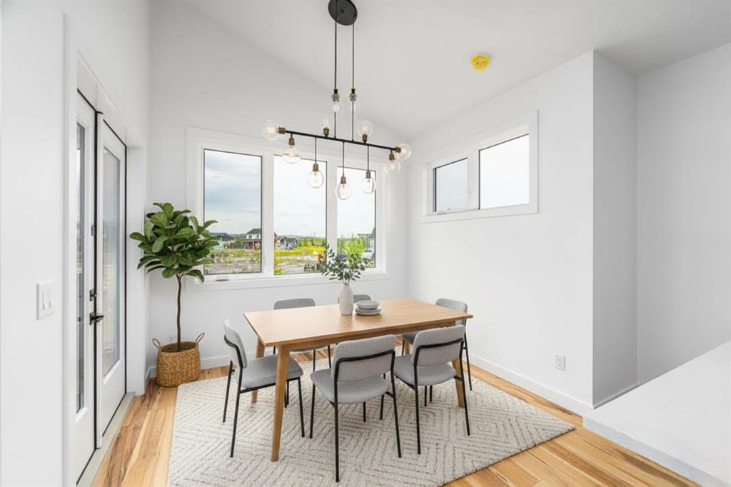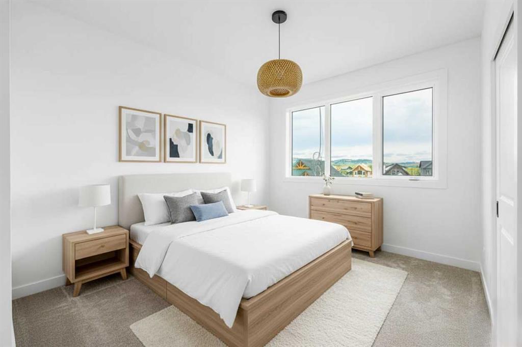 Crafted by a custom home builder, this new home showcases care and custom design throughout. Every inch of this 1107 square foot home has been thoughtfully planned and executed, creatively utilizing every square inch. Main floor features a functional layout with half bath, living room, dining area and kitchen. Kitchen is an optimal u-shape offering ample ceiling height cabinetry and large counterspace. Overlooking the dining area which features a vaulted ceiling and encased with oversized windows and patio door that leads to the 12’x15’ large deck. Off the kitchen and dining area you will find the cozy living room, uniquely closed off from the kitchen. This allows for optimal furniture placement. The thoughtfully designed staircase with modern railing leads you to the upper level. Here you will find a large 4-piece bathroom, 2 bedrooms and a linen closet. Both bedrooms feature functional closets, with the primary bedroom spanning an impressive 120 square feet. In the basement you will find the laundry and a large 553 sq feet of unfinished space awaiting a custom touch. The space, and window size can accommodate an additional bedroom and also a bathroom (roughed in), plus living space. Making it a very functional and exceptional future value add to this home. Outside you can enjoy the sunny front South facing porch under the striking timber pergola. Exterior siding is a durable composite providing piece of mind. This home comes with front parking for 2 cars, a garage could still be added at an additional cost. No expense has been spared in using upgraded materials throughout the building process and in the finishing touches. Features include Duradek on the front and back decks, stone countertops, and upgraded plumbing and lighting fixtures throughout. Conveniently located around the corner from the main entrance of this gated community and within walking distance to the lake and recreation center, this property offers exceptional value at the listed price point. Residents can enjoy the community’s incredible and unique amenities, such as an indoor pool, hot tub, fitness center, sandy beach, outdoor grill, playgrounds, numerous walking paths, and much more. Only 45 minutes from Calgary, and 10 minutes to the amenity rich town of Cochrane makes comfortable 4-season cottage living a reality. There are 3 homes remaining that are ready for possession today!