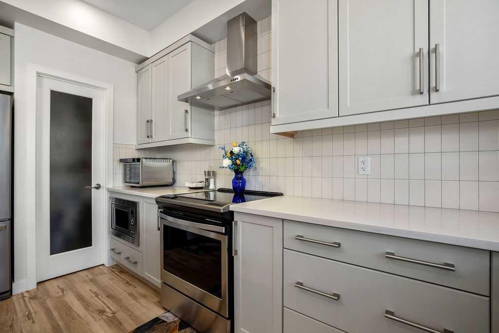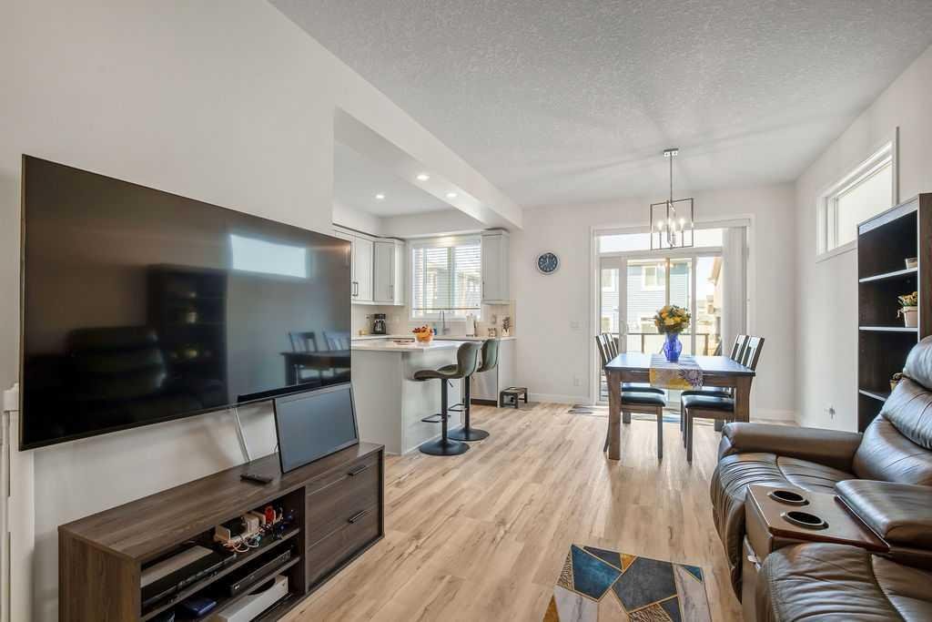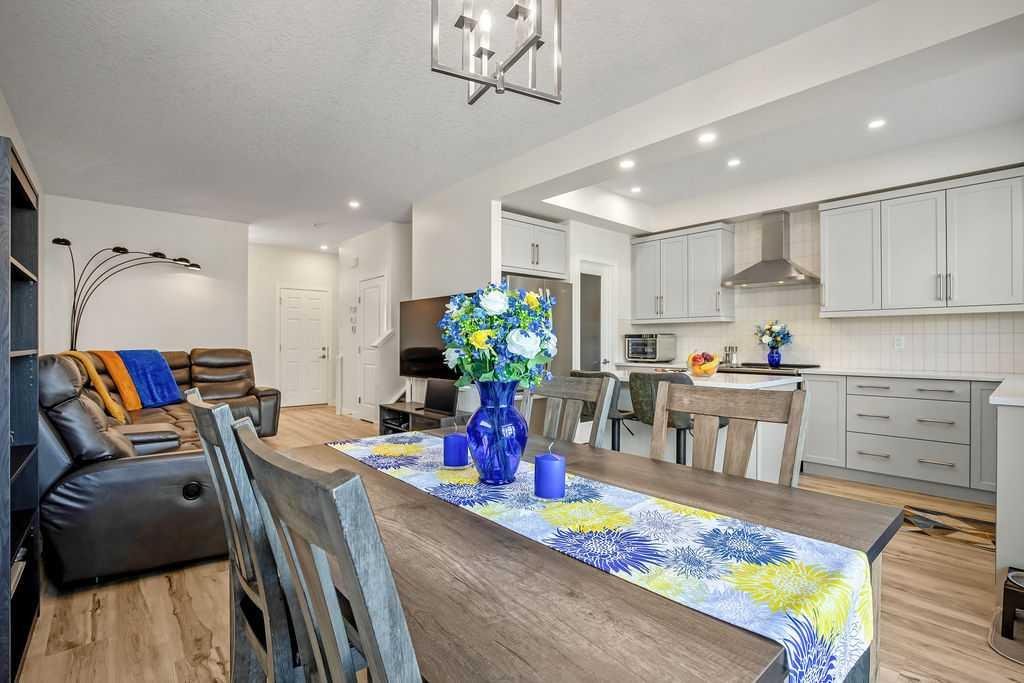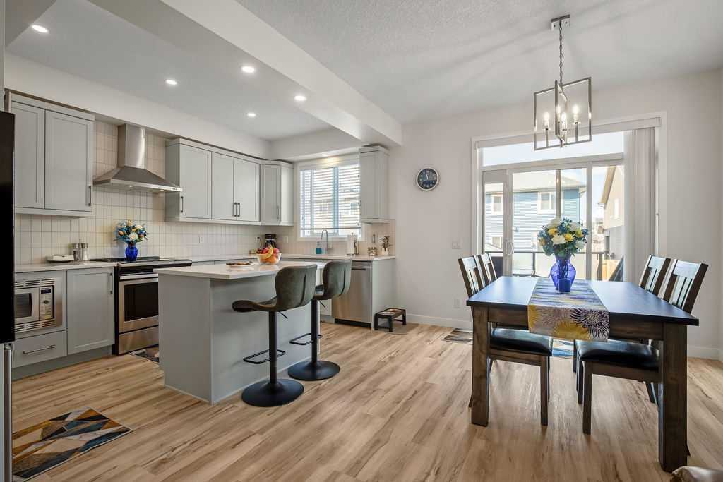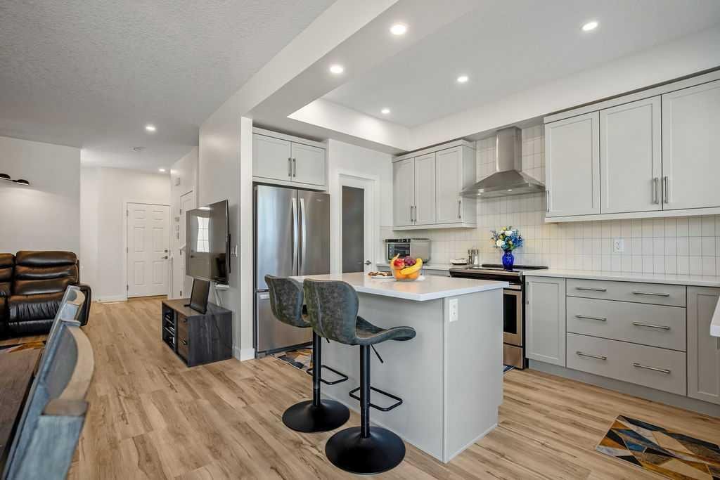 Step inside to a bright, open-concept main floor featuring durable luxury vinyl plank flooring and a spacious living area that seamlessly connects to the dining space and contemporary kitchen—perfect for both everyday living and entertaining. The kitchen is a standout with quartz countertops, a central island with flush eating bar, upgraded lighting, and a full stainless steel appliance package including a French door fridge with icemaker, glass-top stove, built-in dishwasher, designer hood fan, and built-in microwave.