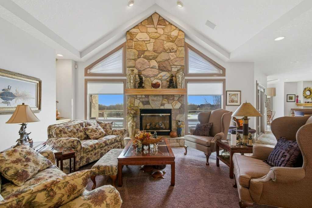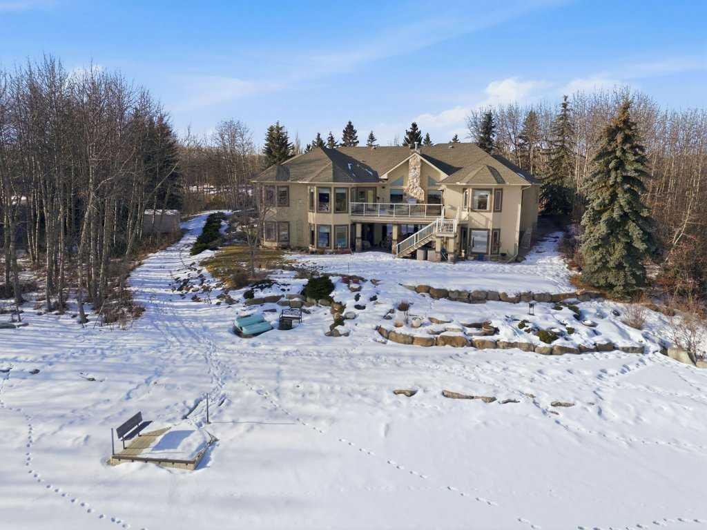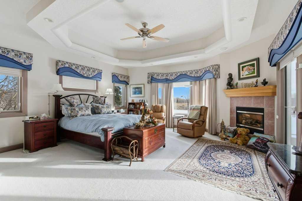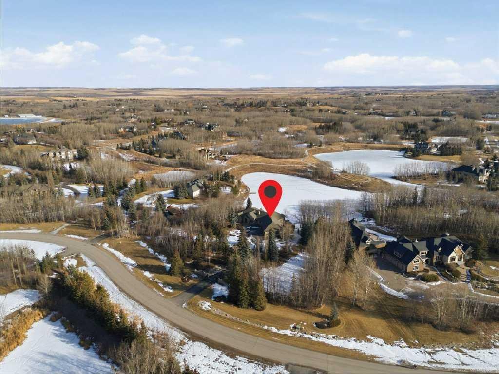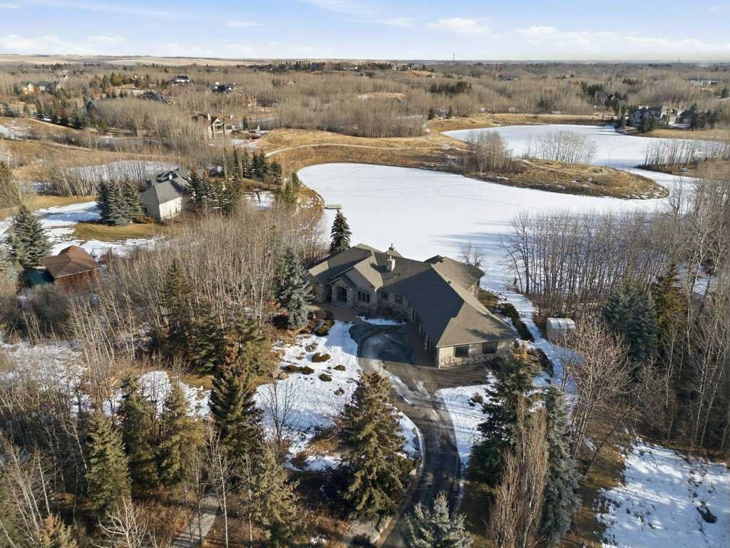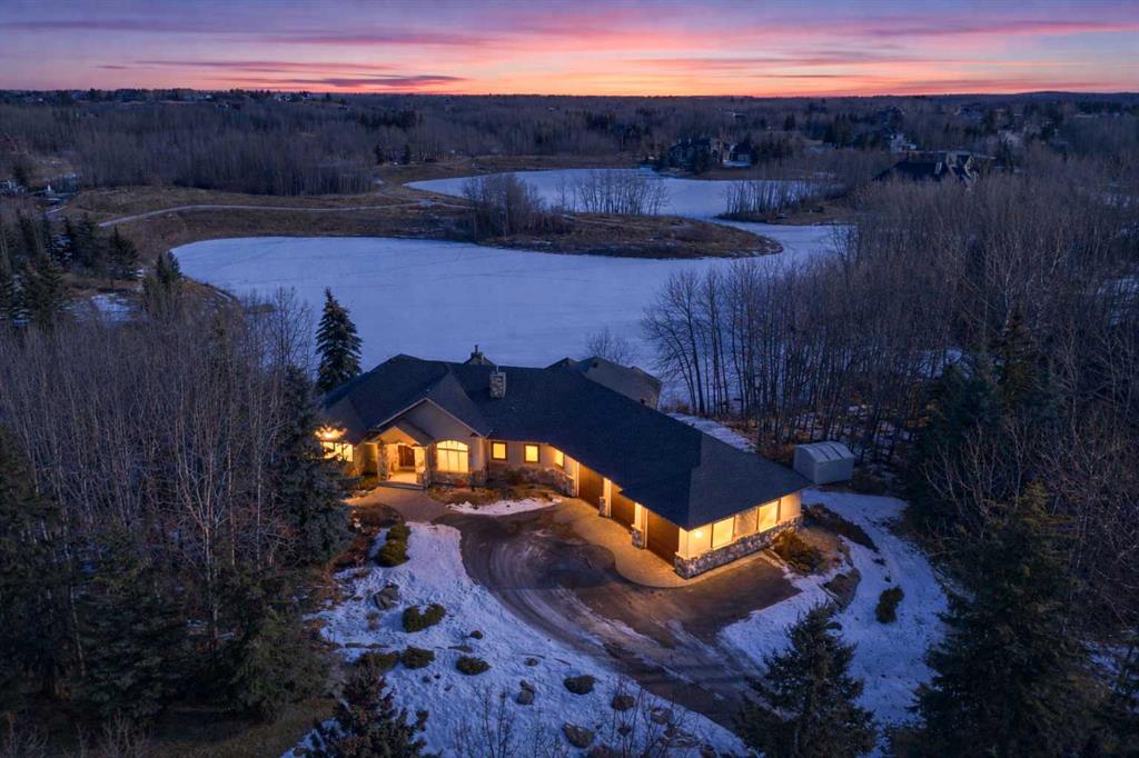 A rare opportunity to own a lakeside acreage in Church Ranches. Custom-built by Maillot Homes, this original-owner walkout bungalow sits on a beautiful 2.04-acre lakefront lot on the shores of Cheyanne Lake in Church Ranches. Offering nearly 6,000 sq. ft. of total living space, the home is designed for both comfort and longevity, featuring a thoughtful layout that includes a private home office, a main-floor primary suite, and an integrated elevator for easy access between levels. The main floor is centered around an open living area with vaulted ceilings and a floor-to-ceiling stone fireplace. The kitchen is built for daily life and hosting alike, finished with marble countertops, a Wolf cooktop, and double ovens. Adjacent to the kitchen, a bright eating nook and a cozy sitting area create an inviting space for casual gatherings. Throughout the home, the quality of construction is evident in the solid red birch doors and custom millwork. The primary bedroom serves as a quiet retreat, complete with its own fireplace and French doors leading to the back deck, which features a built-in BBQ and views of the water. The walk-out lower level is exceptionally bright, with large window banks that bring in plenty of natural light. This level includes two additional bedrooms, an entertainment area with pool table, additional office space with a murphy bed. Plenty of additional storage in the basement. A triple oversized garage with epoxy floors, built in cabinetry for all your storage needs and a work bench. With professionally maintained gardens and landscaping with full irrigation, a private gated driveway, and direct access to your own beach and dock on the swimmable community lake. Gravel pathways around the house for easy access to the gardens and the beach. This is a meticulously maintained for home that offers a peaceful, private lifestyle just minutes from the city. Residents of Church Ranches enjoy seventy acres of private common lands and three public lakes that are maintained by the HOA. The lakes are stocked with trout for fishing and swimmable. There are over 7km of walking trails on the common lands for resident use. Church Ranches is just north of the Calgary city limits and 30 minutes to downtown.