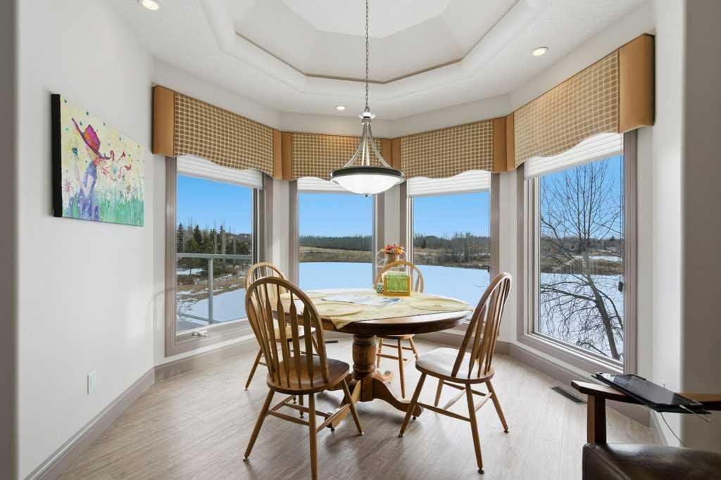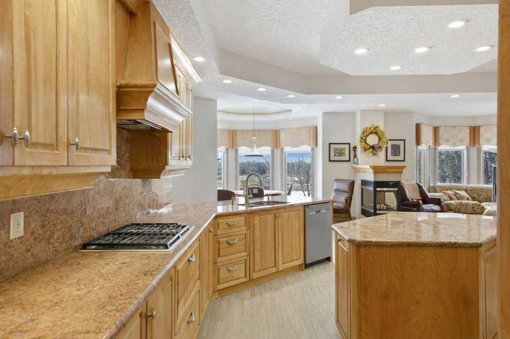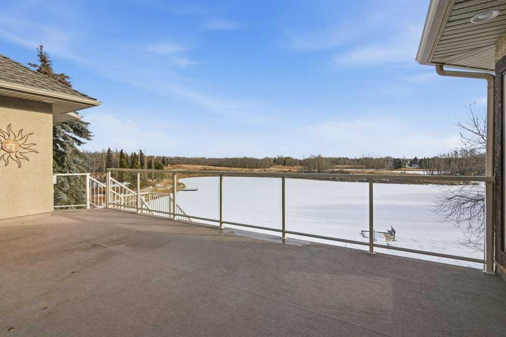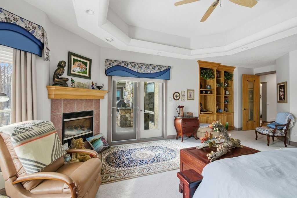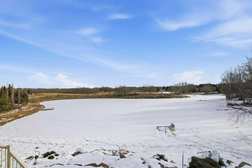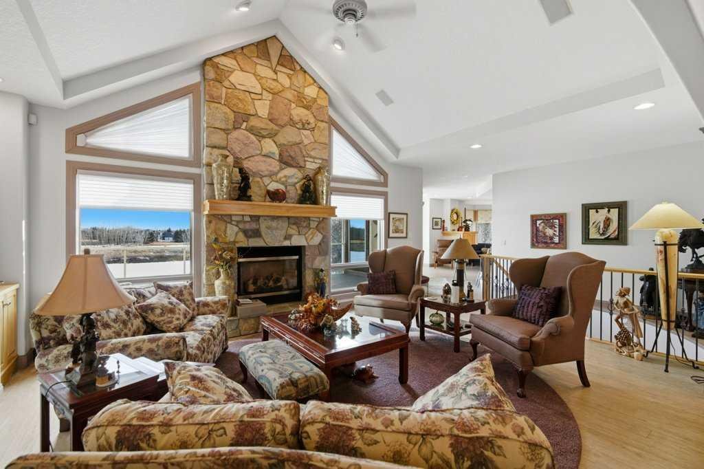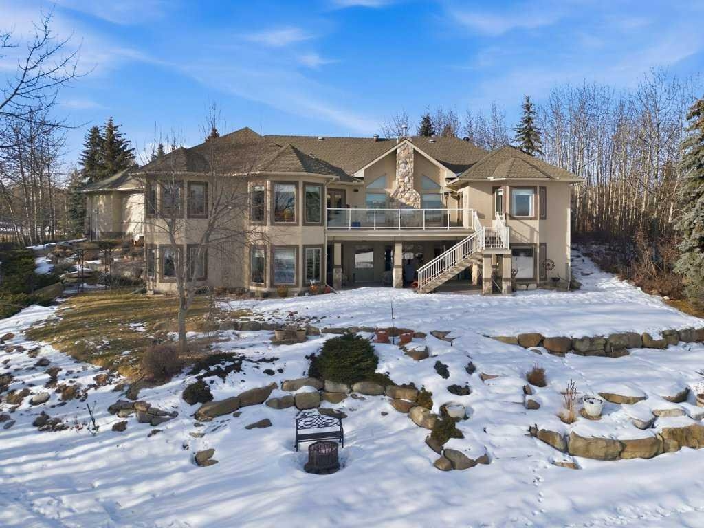 A rare opportunity to own a lakeside acreage in Church Ranches. Custom-built by Maillot Homes, this original-owner walkout bungalow sits on a beautiful 2.04-acre lakefront lot on the shores of Cheyanne Lake in Church Ranches. Offering nearly 6,000 sq. ft. of total living space, the home is designed for both comfort and longevity, featuring a thoughtful layout that includes a private home office, a main-floor primary suite, and an integrated elevator for easy access between levels. The main floor is centered around an open living area with vaulted ceilings and a floor-to-ceiling stone fireplace. The kitchen is built for daily life and hosting alike, finished with marble countertops, a Wolf cooktop, and double ovens. Adjacent to the kitchen, a bright eating nook and a cozy sitting area create an inviting space for casual gatherings. Throughout the home, the quality of construction is evident in the solid red birch doors and custom millwork. The primary bedroom serves as a quiet retreat, complete with its own fireplace and French doors leading to the back deck, which features a built-in BBQ and views of the water. The walk-out lower level is exceptionally bright, with large window banks that bring in plenty of natural light. This level includes two additional bedrooms, an entertainment area with pool table, additional office space with a murphy bed. Plenty of additional storage in the basement. A triple oversized garage with epoxy floors, built in cabinetry for all your storage needs and a work bench. With professionally maintained gardens and landscaping with full irrigation, a private gated driveway, and direct access to your own beach and dock on the swimmable community lake. Gravel pathways around the house for easy access to the gardens and the beach. This is a meticulously maintained for home that offers a peaceful, private lifestyle just minutes from the city. Residents of Church Ranches enjoy seventy acres of private common lands and three public lakes that are maintained by the HOA. The lakes are stocked with trout for fishing and swimmable. There are over 7km of walking trails on the common lands for resident use. Church Ranches is just north of the Calgary city limits and 30 minutes to downtown.