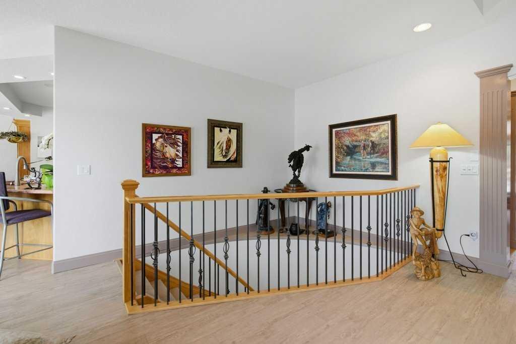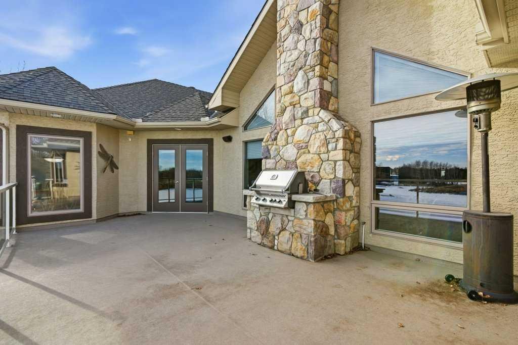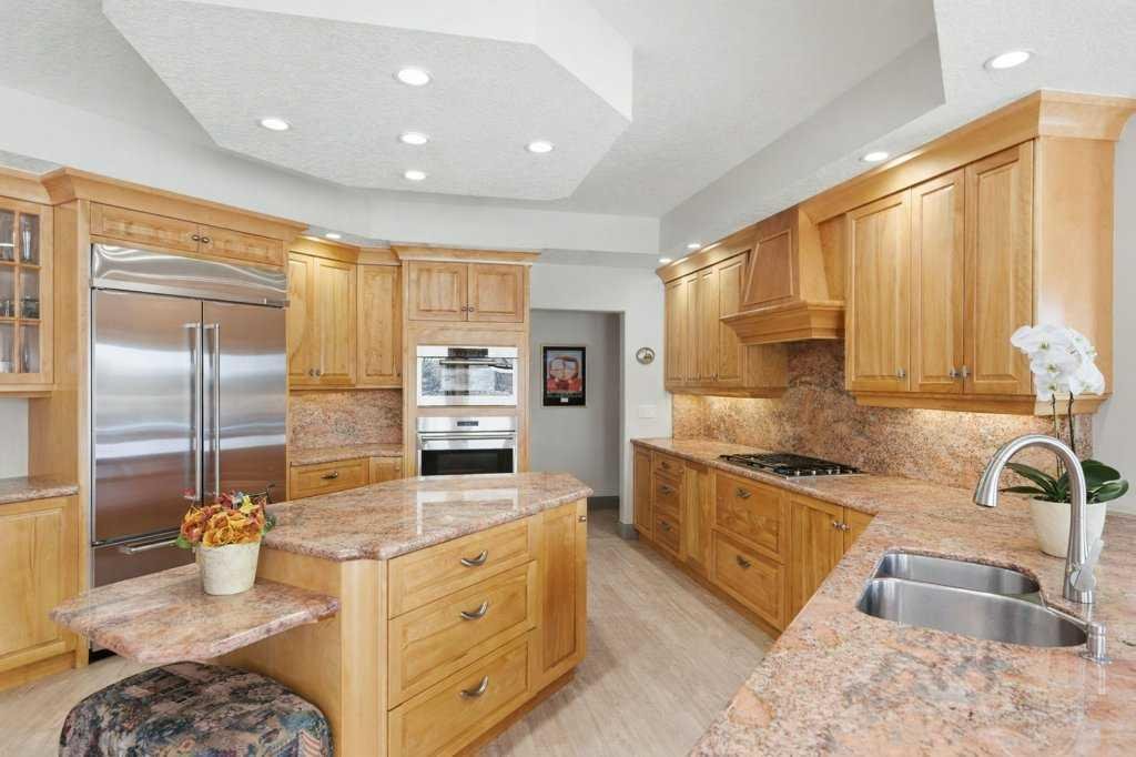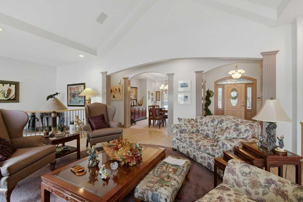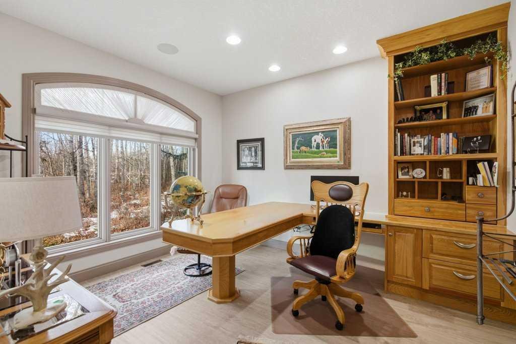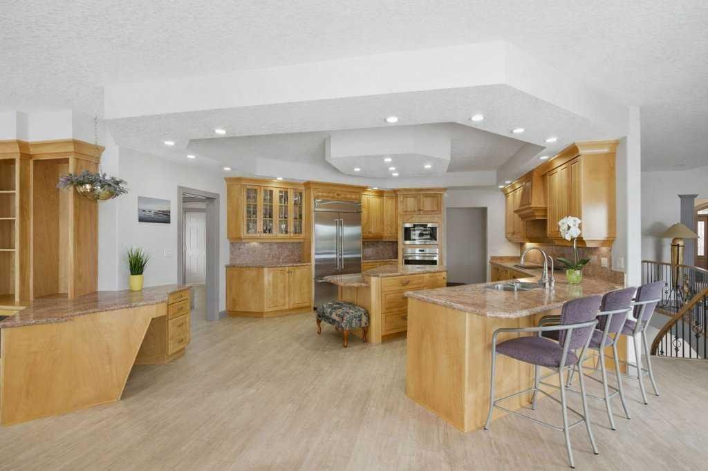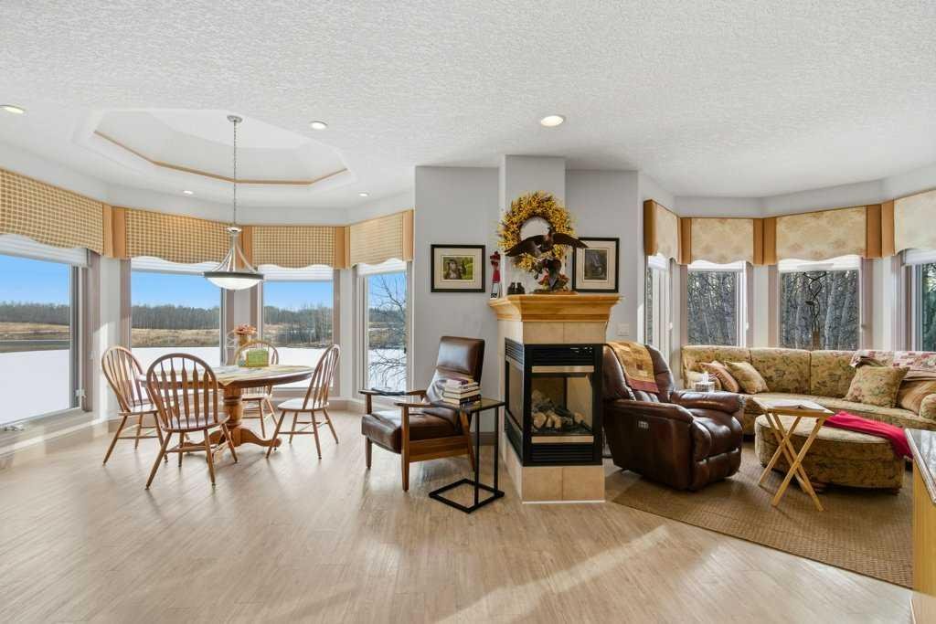 A rare opportunity to own a lakeside acreage in Church Ranches. Custom-built by Maillot Homes, this original-owner walkout bungalow sits on a beautiful 2.04-acre lakefront lot on the shores of Cheyanne Lake in Church Ranches. Offering nearly 6,000 sq. ft. of total living space, the home is designed for both comfort and longevity, featuring a thoughtful layout that includes a private home office, a main-floor primary suite, and an integrated elevator for easy access between levels. The main floor is centered around an open living area with vaulted ceilings and a floor-to-ceiling stone fireplace. The kitchen is built for daily life and hosting alike, finished with marble countertops, a Wolf cooktop, and double ovens. Adjacent to the kitchen, a bright eating nook and a cozy sitting area create an inviting space for casual gatherings. Throughout the home, the quality of construction is evident in the solid red birch doors and custom millwork. The primary bedroom serves as a quiet retreat, complete with its own fireplace and French doors leading to the back deck, which features a built-in BBQ and views of the water. The walk-out lower level is exceptionally bright, with large window banks that bring in plenty of natural light. This level includes two additional bedrooms, an entertainment area with pool table, additional office space with a murphy bed. Plenty of additional storage in the basement. A triple oversized garage with epoxy floors, built in cabinetry for all your storage needs and a work bench. With professionally maintained gardens and landscaping with full irrigation, a private gated driveway, and direct access to your own beach and dock on the swimmable community lake. Gravel pathways around the house for easy access to the gardens and the beach. This is a meticulously maintained for home that offers a peaceful, private lifestyle just minutes from the city. Residents of Church Ranches enjoy seventy acres of private common lands and three public lakes that are maintained by the HOA. The lakes are stocked with trout for fishing and swimmable. There are over 7km of walking trails on the common lands for resident use. Church Ranches is just north of the Calgary city limits and 30 minutes to downtown.