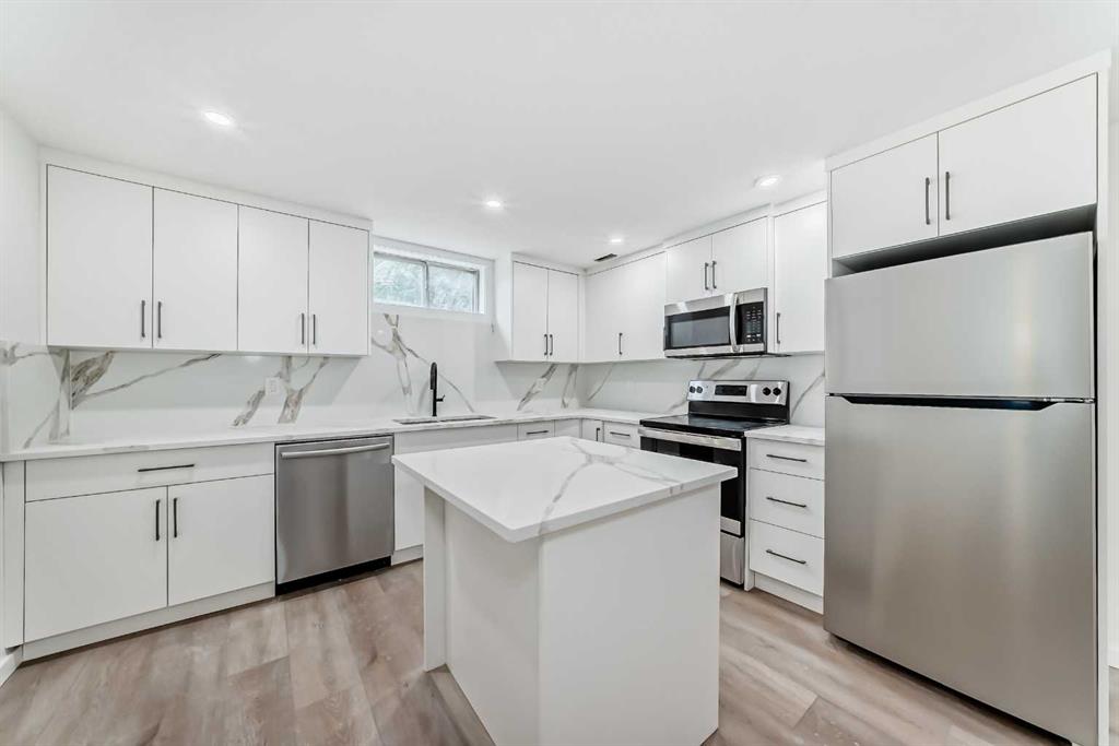 Enjoy the convenience of being just minutes from local schools, parks, and shopping centres, making day-to-day errands effortless. The quiet, tree-lined street enhances the sense of community, while nearby transit options offer easy access to the city core. This thoughtfully updated bungalow blends modern amenities with a welcoming atmosphere, ready for you to call it home. Welcome to this beautifully renovated bungalow located on a quiet street in the well-established community of Woodlands. With over 1,400 sq. ft. of living space on the main floor, this home offers the feel of a brand-new build combined with the charm of a mature neighborhood. Step inside to a bright and open-concept layout featuring brand new hardwood floors, a chef-inspired kitchen with all-new stainless steel appliances, and a massive island—perfect for entertaining family and friends. The spacious living room boasts a cozy fireplace, and the dining area is ideal for hosting gatherings. The main floor includes three generously sized bedrooms, including a primary suite with a private 3-piece ensuite. Large new windows throughout provide an abundance of natural light. Downstairs, the fully finished basement offers incredible versatility with a second kitchen (including an island), three additional bedrooms, a full laundry room, and plenty of living space. With the potential for a separate entrance, this home can easily be suited for rental or multigenerational living. Additional upgrades include a new furnace, hot water tank, and a large private deck—perfect for enjoying summer evenings. Whether you’re a growing family or looking for investment potential, this home is a must-see.