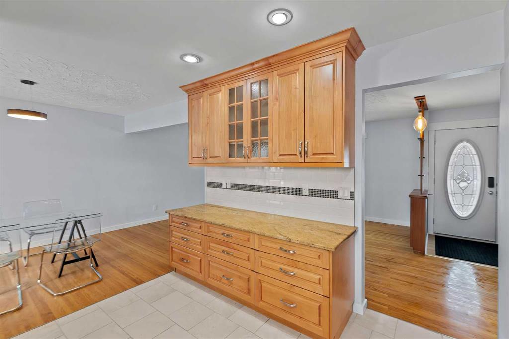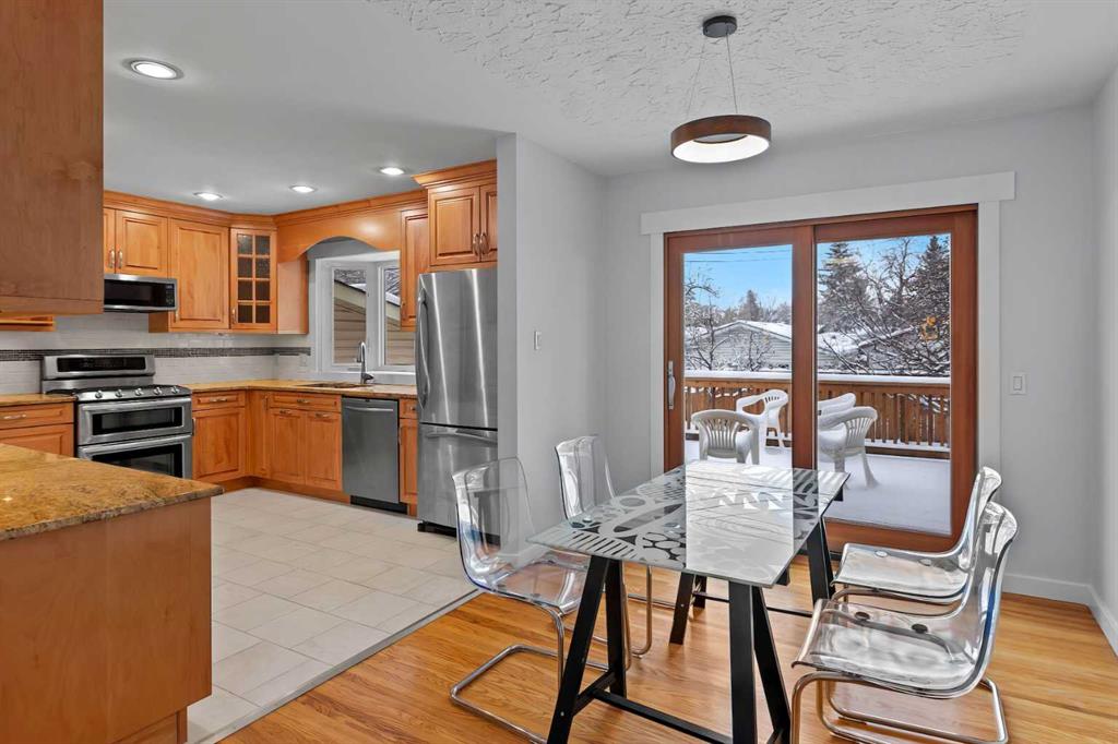 This home is adorned with charming features that cater to modern comforts while retaining its classic character. The moment you arrive, you’ll be greeted by mature trees including a weeping birch and large spruce tree, and interlocking paving stones that grace the driveway and walkways winding across the property. It’s perfect for setting the magic so come inside and make yourself at home. Walking in, you will immediately appreciate the mix of midcentury charm and modern living touches. There is a spacious living room with a corner gas fireplace and huge bay window as well a dedicated dining space both with gleaming site finished hardwood floors. The dining area is bright with its west facing patio doors leading out to the backyard deck and open to the updated kitchen. The kitchen boasts modern touches with stainless-steel appliances, a gas stove with double oven, sleek minimalized microwave hood fan, beautiful granite countertops, tile floors and extensive ceiling height custom cabinetry with lots of pot drawers. Upstairs you will find 3 good sized bedrooms and an updated main bathroom, the hardwood floor continues throughout these rooms.