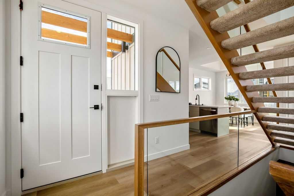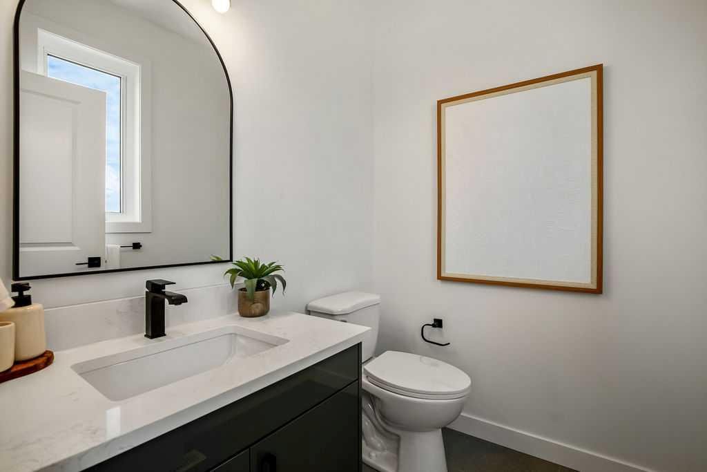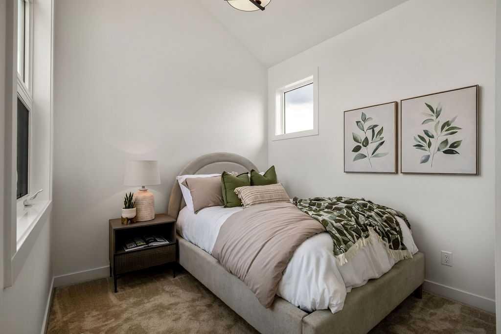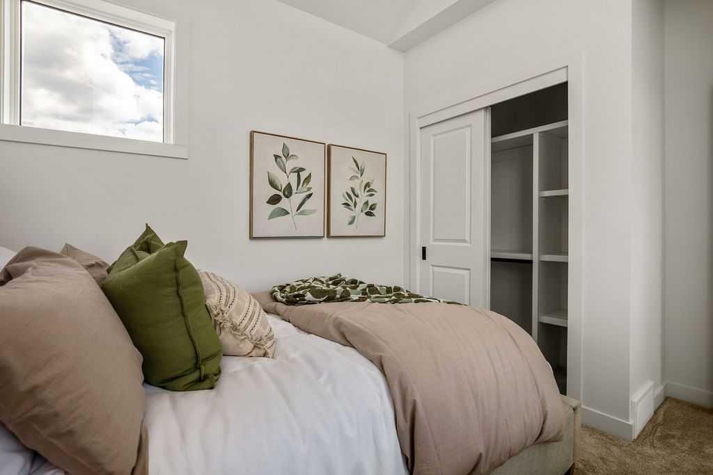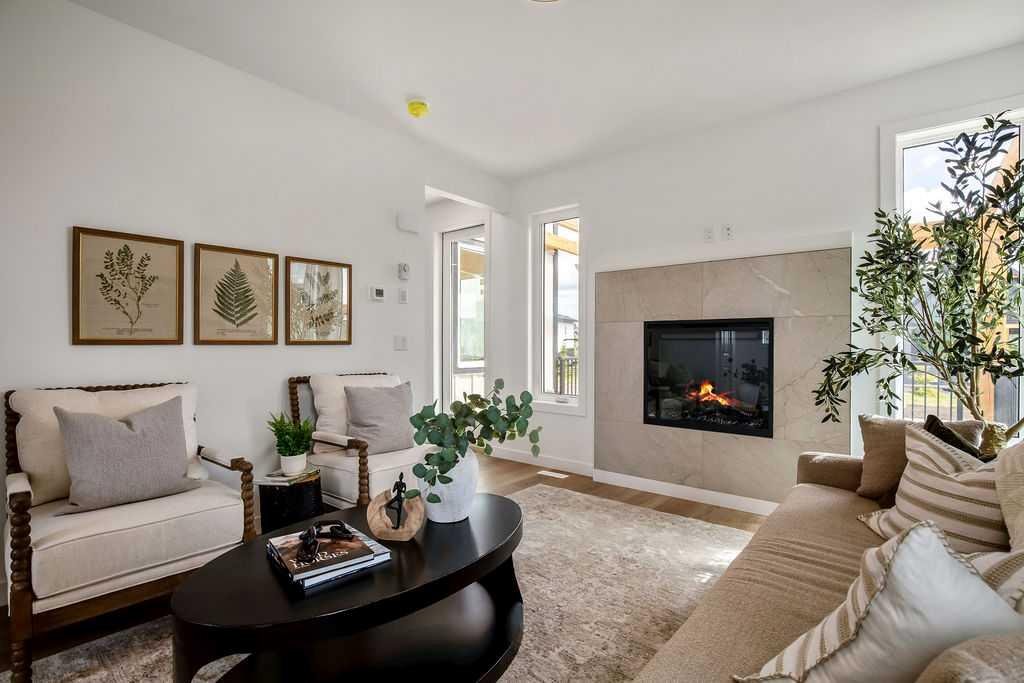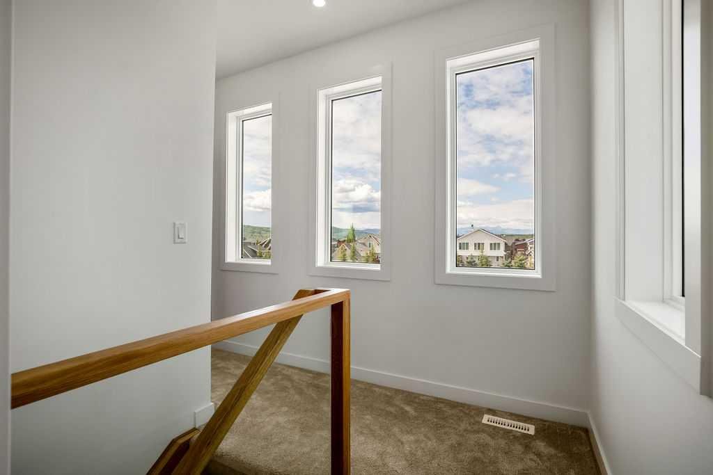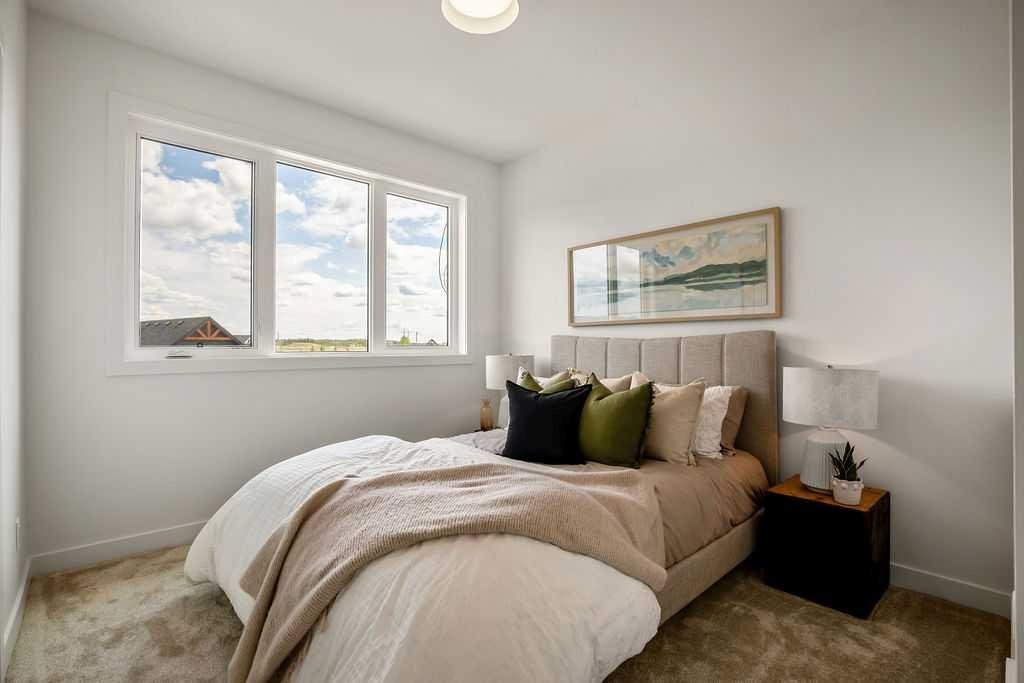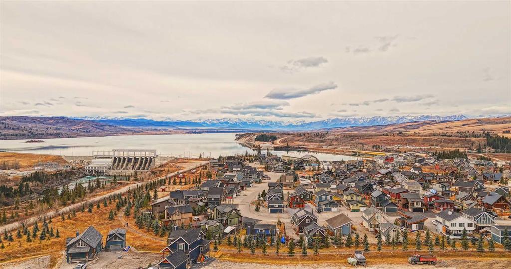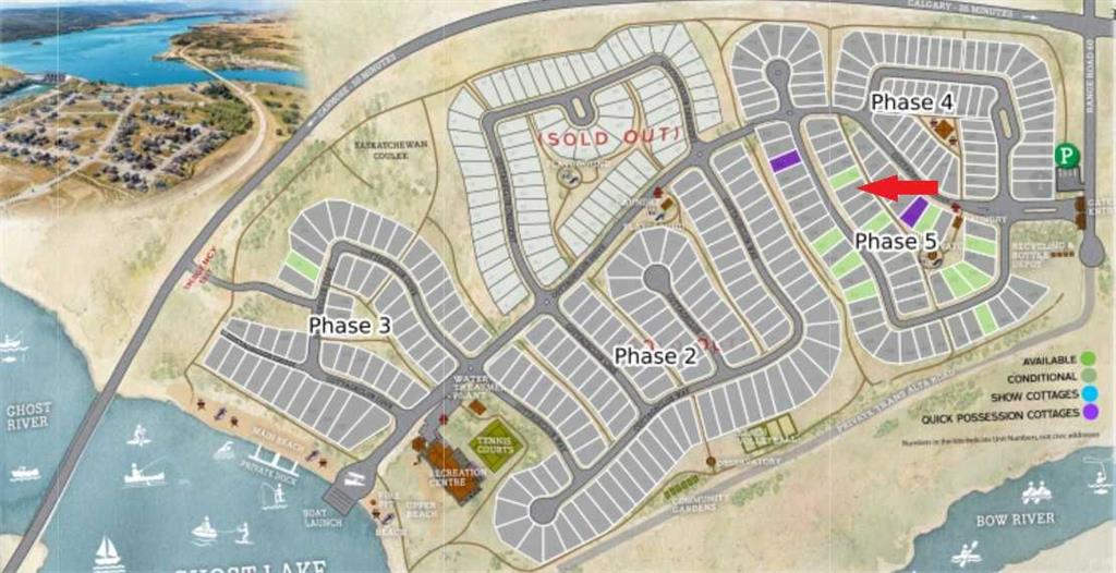 FORMER SHOWHOME! Crafted by a custom home builder, this new home showcases care and custom design throughout. Every inch of this 1,100 square foot developed home has been thoughtfully planned and executed, creatively utilizing every square inch. Main floor features a functional layout with half bath, living room, dining room and kitchen. Kitchen is an optimal u-shape offering ample cabinetry and counterspace. Overlooking the dining area which is upgraded with a tray ceiling and encased with oversized windows that flood the space with an abundance of natural light. Off the kitchen and dining area you will find the cozy living room with an upgraded Napoleon fireplace. This space offers direct access through an oversized doorway to the very large 17×12 deck. An exceptional place to spend summer evenings barbecuing and spending time with friends and family! The thoughtfully designed staircase with glass railing leads you to the upper level. Here you will find a large 4-piece bathroom with dual sinks, 2 bedrooms and a linen closet. Both bedrooms feature functional closets, with the primary bedroom spanning an impressive 100 square feet. The front bedroom is particularly unique, featuring a vaulted ceiling, mountain views captured through the oversized windows. In the basement you will find the laundry and a 550 sq ft unfinished space awaiting a custom touch. The space, and window size can accommodate an additional bedroom and also a bathroom (roughed in), plus living space. Making it a very functional and exceptional future value add to this home. Outside you can enjoy the sunny front West facing porch under the striking timber pergola. Exterior siding is a durable composite providing piece of mind. This home comes with front parking, a garage could still be added at an additional cost. No expense has been spared in using upgraded materials throughout the building process and in the finishing touches. Features include Duradek on the front and back decks, stone countertops, and upgraded plumbing and lighting fixtures throughout. Conveniently located around the corner from the main entrance of this gated community and within walking distance to the lake and recreation center, this property offers exceptional value at the listed price point. Residents can enjoy the community’s incredible and unique amenities, such as an indoor pool, hot tub, fitness center, sandy beach, outdoor grill, playgrounds, numerous walking paths, and much more. Only 45 minutes from Calgary, and 10 minutes to the amenity rich town of Cochrane makes comfortable 4-season cottage living a reality. There are only 3 homes remaining that are ready for possession today!