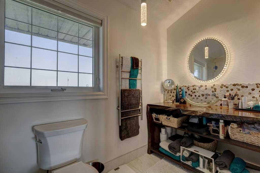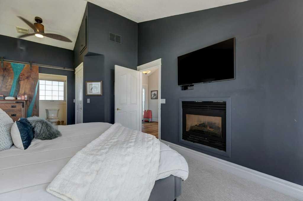 The kitchen offers both style and function with stainless steel appliances, quartz countertops, a bold blue tile backsplash, garburator, stylish pendant lighting, and a large island with breakfast bar seating. The smart layout and ample cabinetry make it ideal for everyday living and entertaining. From here, step onto one of two expansive decks; one covered and equipped with a gas hookup for year-round BBQing. The second deck also connects to the private primary bedroom, offering peaceful views across the prairies.