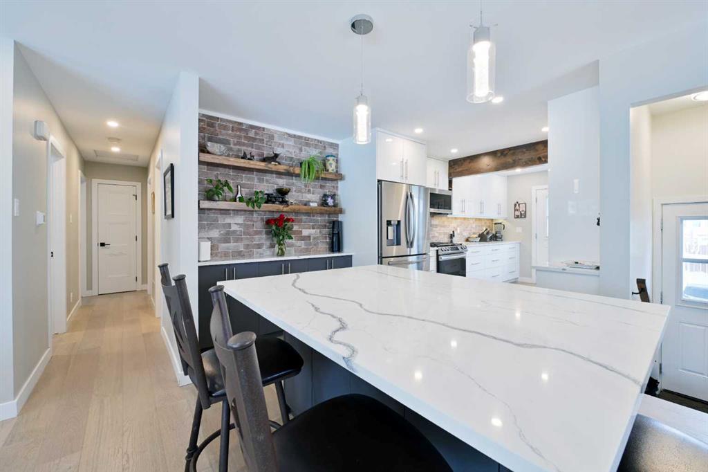 This beautifully renovated custom built over 1,400sq ft bungalow on a quiet street and within easy walking distance to the Earl Grey Golf course, Lakeview Plaza, and numerous highly regarded schools is truly exceptional. Upscale finishes elevate every aspect of the home both inside and outside. The welcoming front entry opens to a spacious living room centered by the gas stone fireplace with custom designed wooden mantle. A large separate dining area makes it ideal for entertaining. The fabulous custom kitchen is designed for both function and style, with quartz counters, custom cabinetry, high end appliances and an abundance of storage. The huge primary bedroom with walk-in closet and spa inspired ensuite with heated floors overlooks the West facing backyard. Two additional bedrooms allow for the option of a separate office or den. The well designed completely renovated lower level offers a recreation room complete with wet bar, and two additional good sized bedrooms, an additional full bathroom, and laundry. The exterior of the home also features premium upgrades by the current owners, including mahogany exterior trim, real stone on the foundation, a triple-lock Pella security front door, and a heated double garage complete with epoxy flooring and its own electrical panel. The Outdoor living is exceptional, highlighted by an extensive cedar deck, reinforced concrete pad for the hot tub, gazebo, extensive landscaping, and 2 custom sheds. The widened driveway with new curbing adds both convenience and additional parking. This prime location, walkable to the Earl Grey Golf Course, schools, the Lakeview community centre, Glenmore Reservoir, the Canoe Club, and just a short drive away from Mount Royal University, The Tennis Academy, Rockyview Hospital, Chinook Mall, Heritage Park, and downtown — truly provides the perfect blend of lifestyle and convenience.