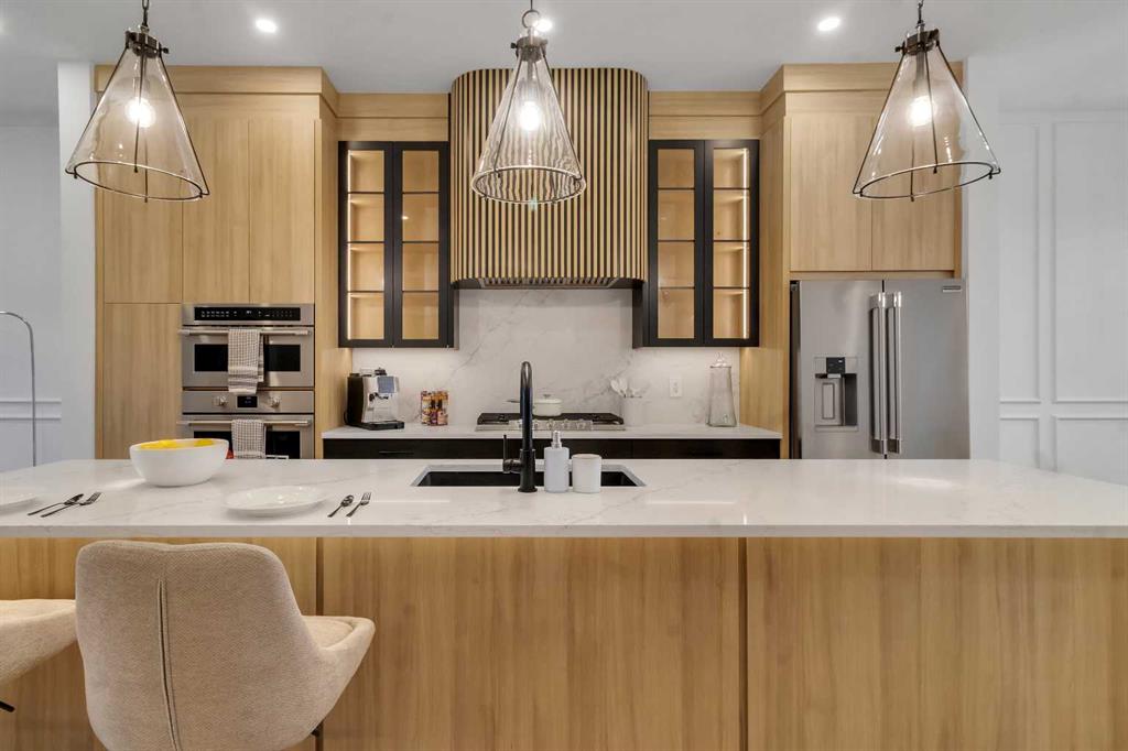 Modern luxury and timeless design come together in this brand new, meticulously crafted infill by Moon Homes, ideally located on a quiet, tree lined street in the heart of Mount Pleasant. Offering thoughtfully curated living across all three levels, this residence delivers elevated craftsmanship, refined architectural detailing, and exceptional functionality just steps from Confederation Park and minutes to downtown. The main floor is defined by soaring 10 foot ceilings, oversized windows, rich hardwood flooring, and custom millwork throughout. A grand arched entry opens to a spacious foyer, setting the tone for the sophisticated interior. The open concept living and dining areas are anchored by a beautifully tiled gas fireplace with custom built ins and a statement chandelier, while large sliding patio doors create seamless indoor outdoor flow to the rear concrete patio, ideal for entertaining. The chef inspired kitchen is a true showpiece, featuring a massive quartz island, premium Frigidaire Professional Series appliances, a custom slat hood fan, bar fridge, and full height cabinetry with extensive pull out storage. Thoughtfully designed LED lighting including under cabinet, toe kick, floating shelf, and glass front upper lighting adds both function and dramatic ambiance. A dedicated pocket office or home workspace and a custom mudroom with built ins are perfectly positioned for modern daily living, complemented by a stylish powder room with a floating vanity and designer lighting. Upstairs, wainscoting continues through a bright, sun filled hallway. The primary retreat is nothing short of exceptional, showcasing nearly 15 foot vaulted ceilings, a fully detailed feature wall, upper transom windows, plush carpeting, and a striking chandelier. The walk in closet offers custom shelving, pull outs, and motion sensor LED lighting. The spa inspired ensuite includes heated tile floors, dual vanities, a freestanding soaker tub, a tiled rainfall shower with bench, ambient mirror and vanity lighting, and a private water closet. Two additional bedrooms each feature walk in closets and share a beautifully appointed four piece bathroom. A well designed upper laundry room includes LG appliances, folding counter, deep sink, cabinetry, hanging rack, and linen storage conveniently located near the bedrooms. The fully finished legal basement suite (pending final inspection) offers a private side entrance and mirrors the quality of the main home. Complete with a full kitchen, spacious living area, modern four piece bathroom, and dedicated laundry with built in sink, this space is ideal for extended family, guests, or future rental income. Finished with a detached double garage and paved alley access, this home is surrounded by top rated schools, parks, pathways, Mount Pleasant Pool, and beloved local amenities, with quick access to major routes and the city core.
