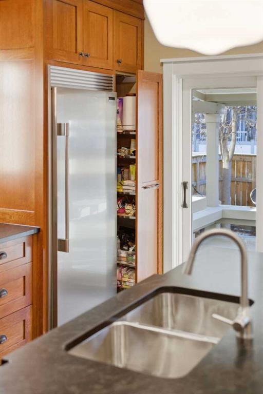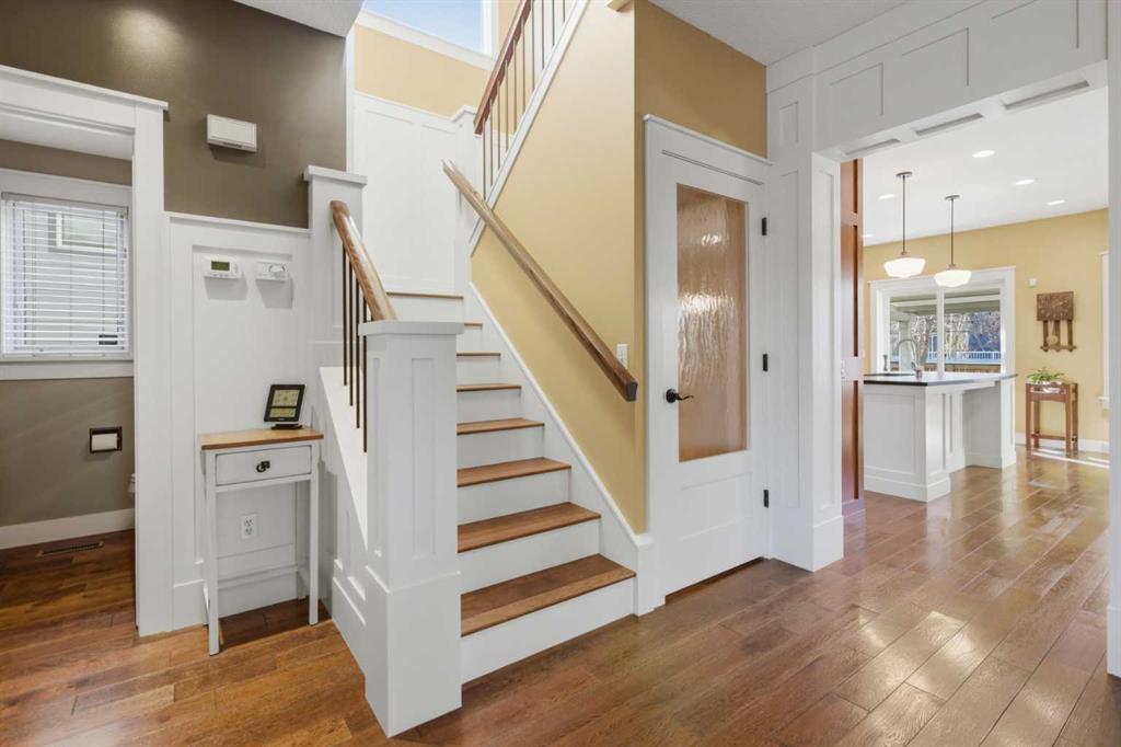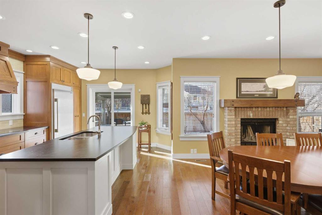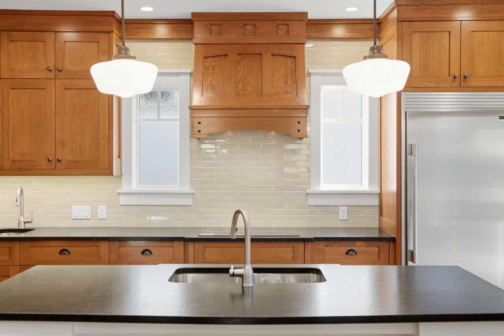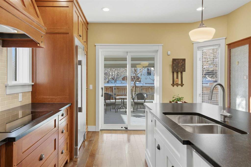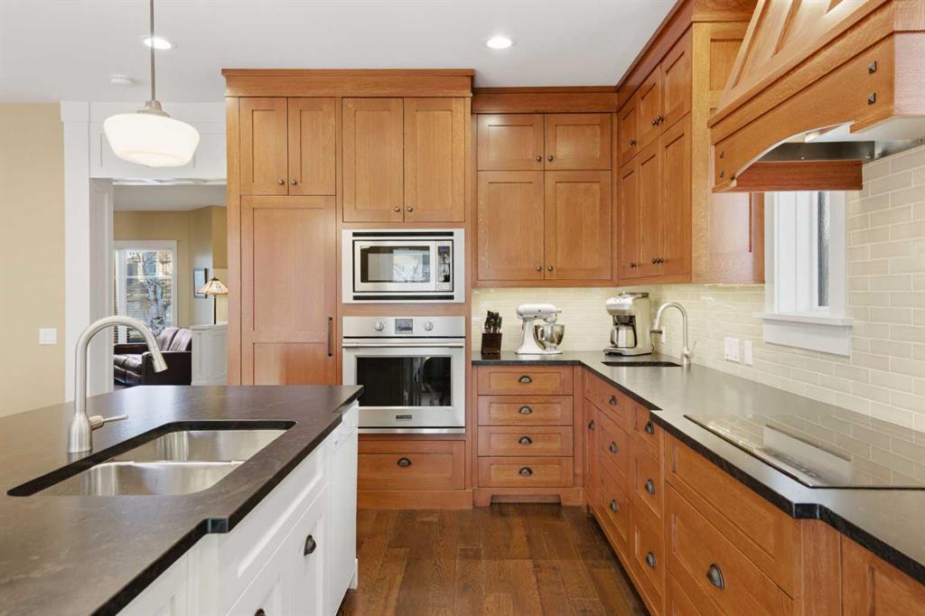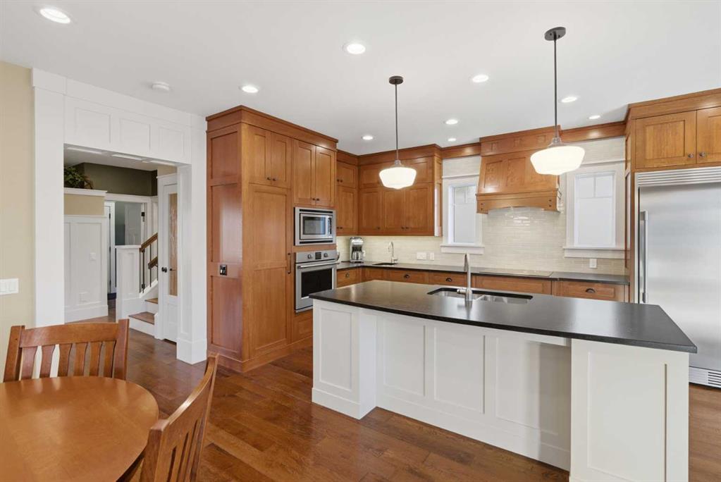 Entering the main level, you’ll notice engineered hardwood flooring, generous 9 foot ceilings, custom wainscoting, and a panelled transitional archway adding warmth and architectural character, while the many upgraded Pella windows flood the upper levels with natural light. The incredible kitchen features quarter sawn white oak cabinetry, leather finished granite countertops, and an oversized island anchoring the space. Extensive pull outs, a secondary prep sink, Sonoma tile backsplash, and high end stainless steel appliances complete with built in wall oven and cooktop make the space as functional as it is striking.