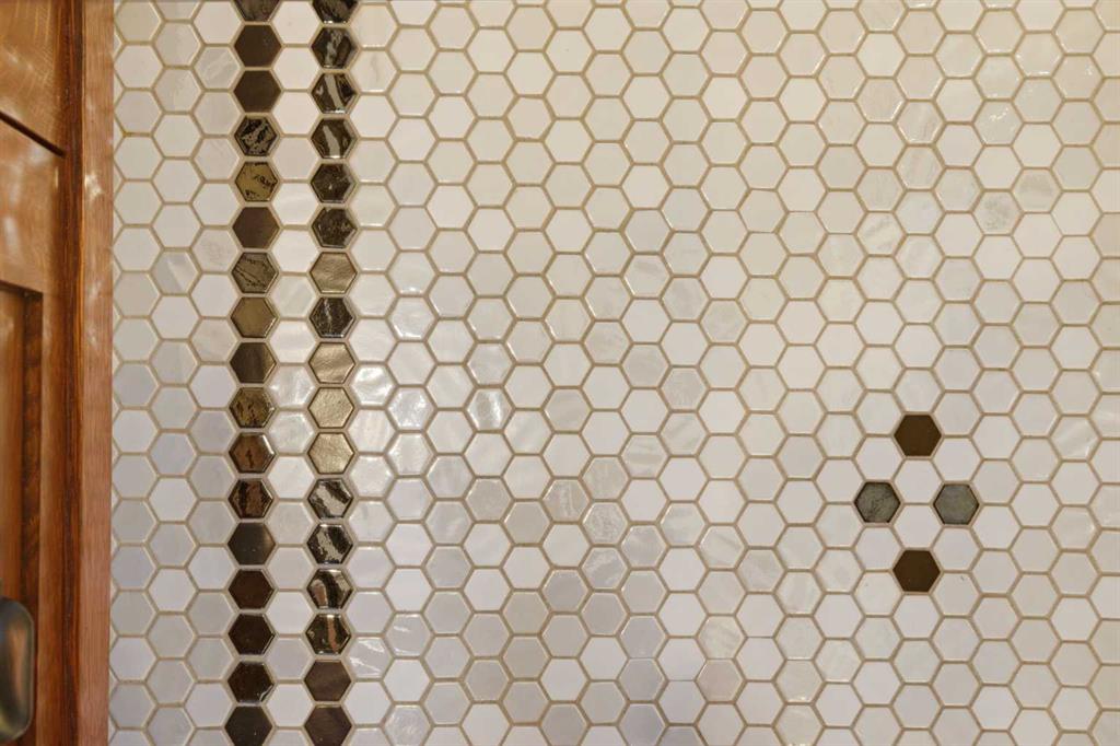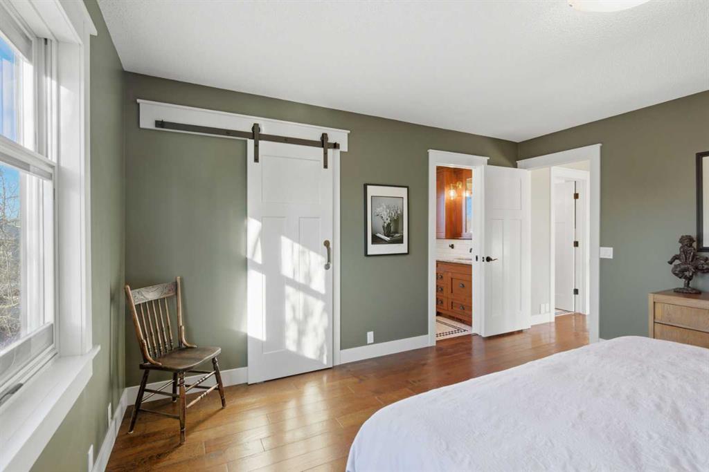 Heading up the fully customized stairwell brings you to the spacious primary retreat where behind the barn door you will find a walk in closet located next to the designer ensuite showcasing a tiled shower, intricate penny tile detailing, bespoke vanity and medicine cabinet, custom built for the space.