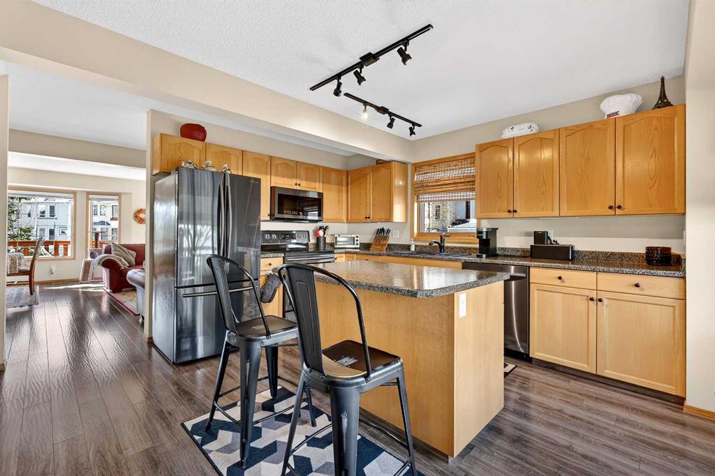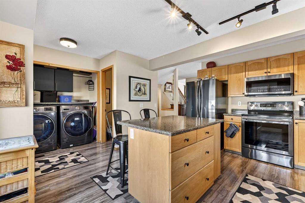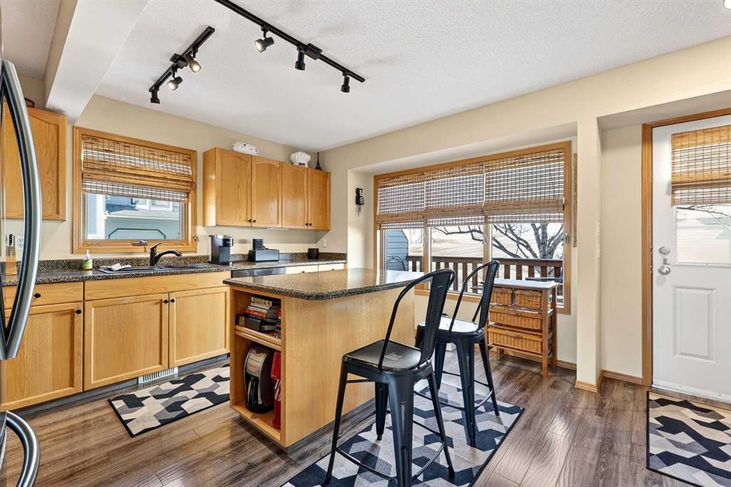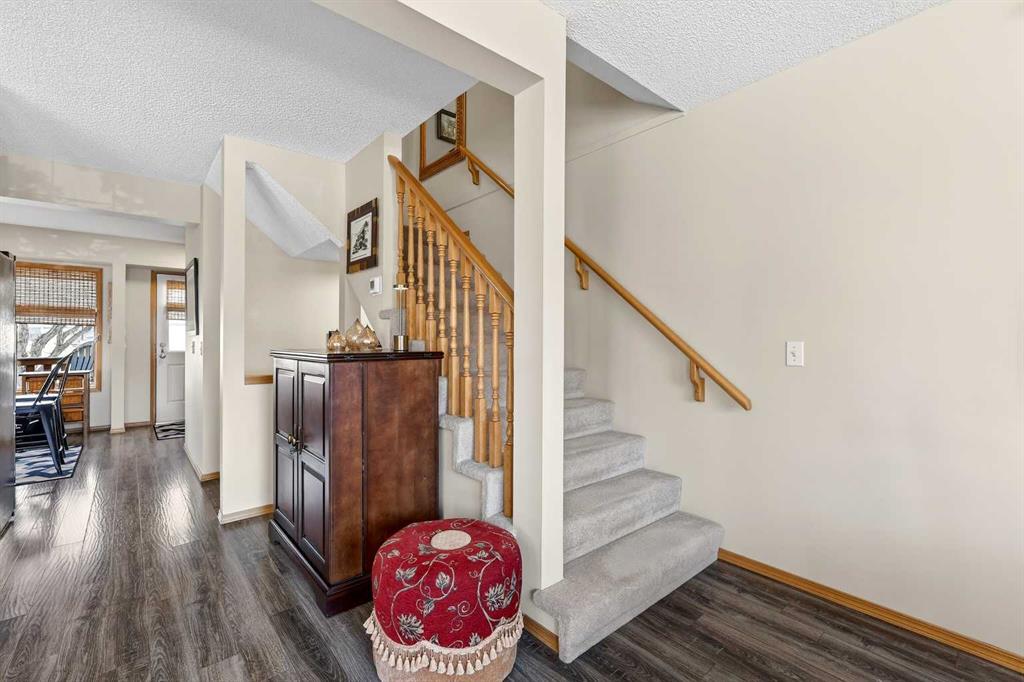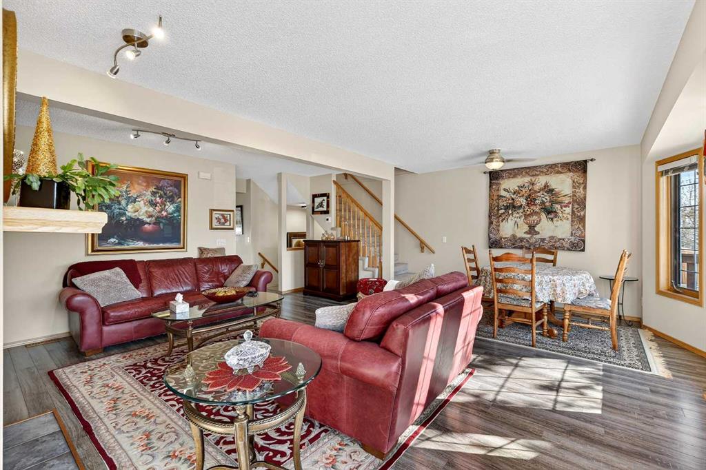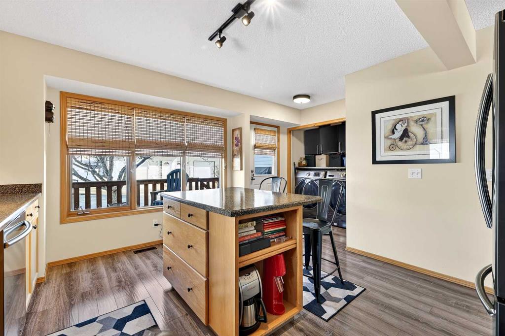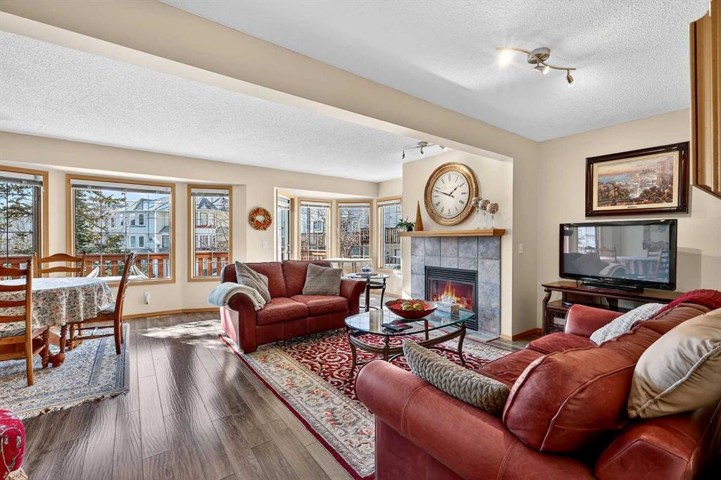 Tucked into the desirable community of Patterson, this well-maintained 2-bedroom, 2 full bathrooms corner-unit townhome in Capilano Gardens offers a bright and functional layout designed for comfortable everyday living. As an end unit, large bay windows fill the home with natural light, creating a warm and inviting atmosphere throughout. Central air conditioning ensures year-round comfort, while two private decks provide wonderful spaces to enjoy the outdoors. The main level features durable laminate flooring and a thoughtfully designed floor plan. The spacious kitchen is surrounded by windows that bring in plenty of sunshine and is equipped with dark stainless steel appliances, ample cabinetry, and a central island, perfect for meal prep or casual dining. Just off the kitchen, one of the two decks offers the ideal setting for BBQs, morning coffee, or evening relaxation. The adjoining living room is anchored by a cozy gas fireplace, creating the perfect place to unwind or entertain. A 2-piece powder room and convenient main floor laundry complete this level. Upstairs, you’ll find two generously sized bedrooms, each offering excellent privacy. The primary suite features a walk-in closet and a private 3-piece ensuite, while the second bedroom enjoys direct access to a 3-piece bathroom, making it ideal for guests, family, or a home office. The double tandem garage provides ample space for vehicles, storage, or even a small workshop, perfect for those who appreciate extra room for hobbies or gear. Capilano Gardens is a well-managed complex with low condo fees, with updates including a new roof in 2018, refreshed decks, and repainted garage door trims. Located close to parks, pathways, schools, WinSport, and Calgary Farmers’ Market West, the home also offers quick access to downtown Calgary and an easy escape to the mountains. Enjoy low-maintenance living, bright interior spaces, and exceptional west-side convenience in this fantastic Patterson townhome.