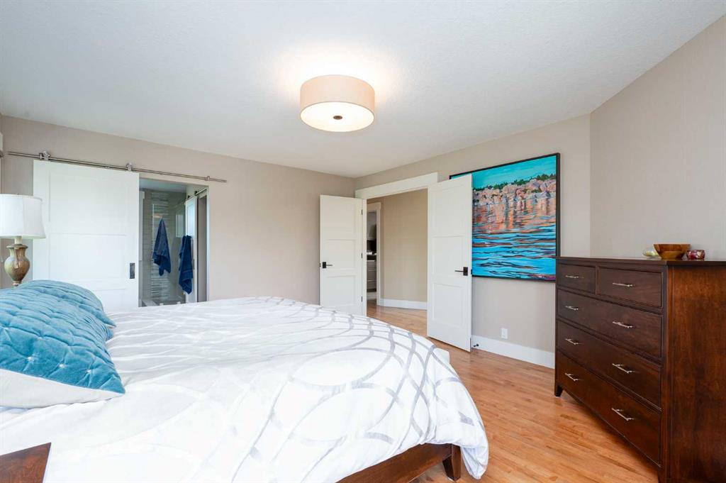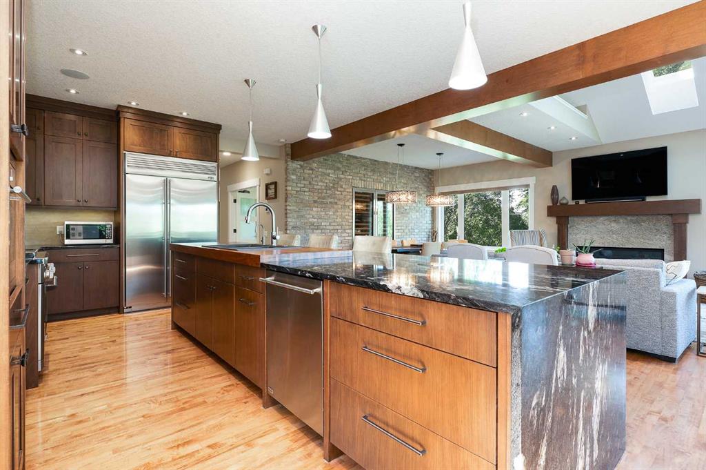 OPEN HOUSE SATURDAY, FEBRUARY 7TH FROM 2-4 PM & SUNDAY, FEBRUARY 8TH FROM NOON – 2 PM. Unprecedented location siding & backing onto picturesque Confederation Park! This gracious 3+1 bedroom home with FULLY DEVELOPED WALK-OUT BASEMENT & over 3800 sq ft of developed living space, underwent a “to the studs” renovation in 2015 & exudes elegance. The open & airy main level is adorned with hardwood floors, showcasing a living room with beamed vaulted ceiling with skylights & feature fireplace. The spacious dining area with brick feature wall & built-in Sub-Zero wine fridge has ample space to host friends & family. The kitchen is discerningly finished with granite counter tops, island/eating bar, plenty of storage space & top of the line stainless steel appliances. A bright private office with built-ins is tucked away just off the foyer & a 2 piece powder room & convenient mudroom complete the main level. The second level with hardwood floors hosts 3 generously sized bedrooms, a 4 piece bath & laundry room equipped with sink & storage. The primary retreat boasts a walk-in closet with in-floor heat & private 4 piece ensuite also with heated floors, dual sinks & oversized shower. The walk-out basement with in-floor heat has access to the patio & is the perfect space for game or movie night, featuring a huge family room with home theatre system plus a games/recreation area complete with bar area including a Kegerator & wine fridge. A fourth bedroom & 4 piece bath with relaxing steam shower are the finishing touches to the basement. Other notable features include dual central air conditioning units, dual high efficiency furnaces (2022), 2 hot water heaters, wired for sound/video, Hunter Douglas blinds throughout & 2 open to below features from second to main level. Outside, enjoy the tranquil Duradeck covered main floor deck with beautiful views of the park & lower patio with paving stones surrounded by Kayu Batu fencing. Parking is a breeze with a double attached garage with heated floor. The premier location can’t be beat, steps from the park with access to walking/biking paths, a ball diamond, tennis courts, golf course & also close to schools, shopping & public transit.
