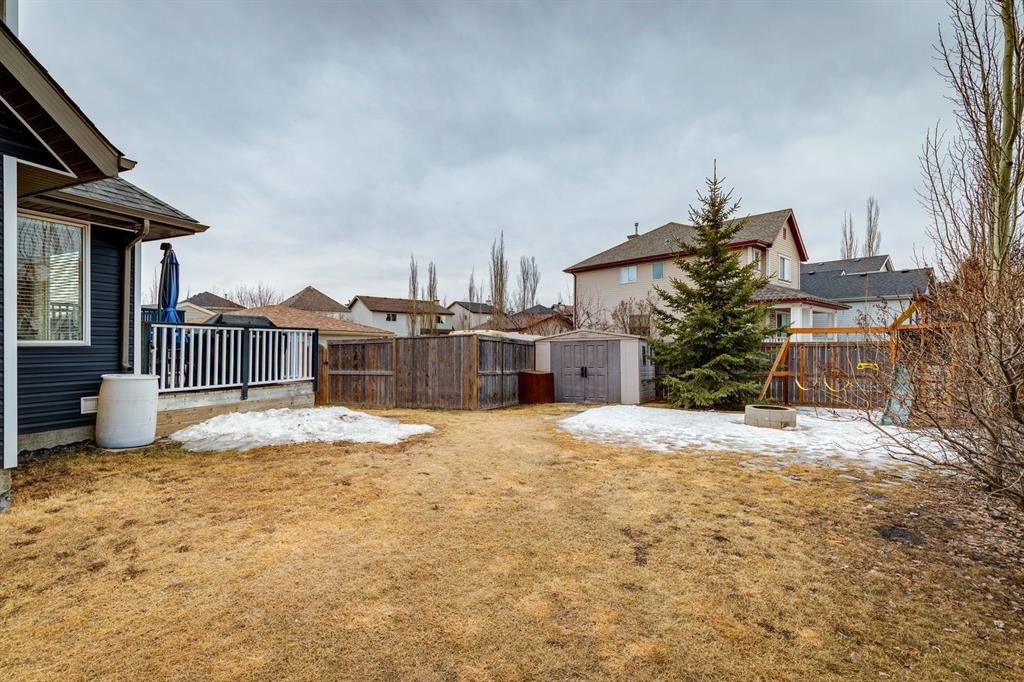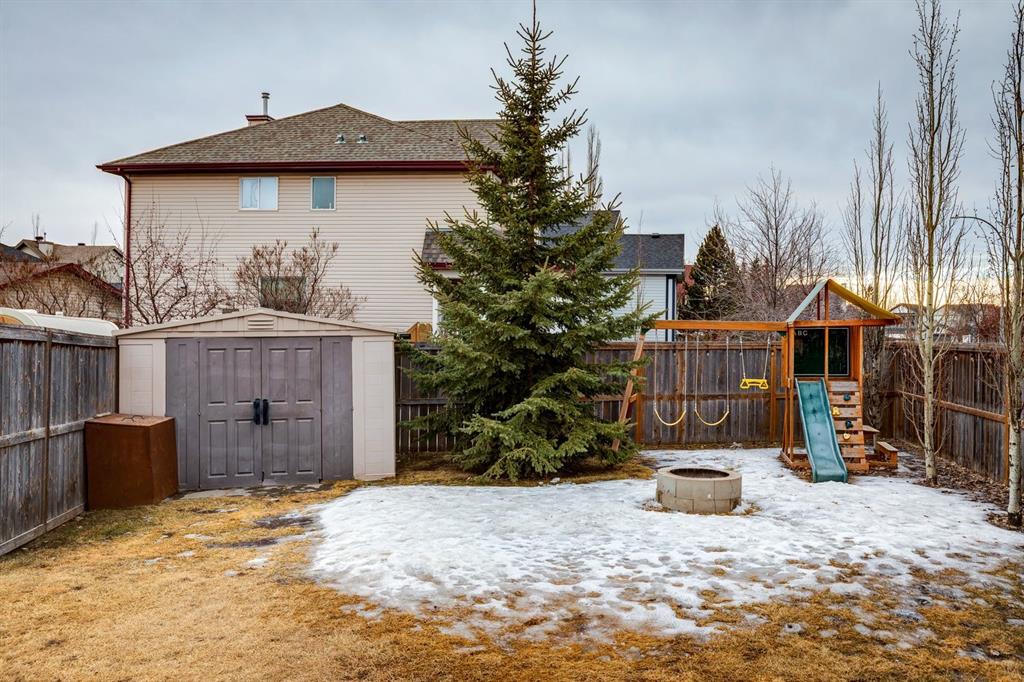 Situated on a large corner lot with sunny south and west exposure, this detached home offers incredible value. Priced below other detached homes in the district, this is the perfect opportunity for a small family starting out, a first-time buyer, or someone ready to upgrade from a townhouse or condo to enjoy more space and freedom. Inside, the open-concept main floor is designed for everyday living and easy entertaining, featuring a fireplace in the living room, and a bright kitchen with a central island, breakfast bar, stainless steel appliances including a brand new stove, and a sink set beneath a window overlooking the backyard. The dining area is especially inviting, wrapped in windows on three sides with warm south-facing sunlight pouring inside. Upstairs offers three bedrooms, including a spacious primary with a walk-in closet and private ensuite, plus a second full bathroom. The undeveloped lower level provides a blank canvas to customize as your needs grow. Outside, the fully fenced south backyard is ready for summer BBQs on the deck, evenings around the fire pit, kids climbing on the swing set and pets roaming freely in the sunshine. Mature trees and a garden shed add privacy and function and there is more than enough space to build a future triple garage, a garden, or expanded outdoor living space. With recently updated siding, the curb appeal is fresh and modern, and the corner lot position offers extra privacy, abundant sunlight, and the added bonus of no sidewalk along that side, meaning less snow shovelling in the winter months. Located in the heart of Copperfield, close to schools, shopping, playgrounds, pathways and ponds, with easy access to Stoney and Deerfoot Trails, this home delivers lifestyle, flexibility, and smart value all in one.