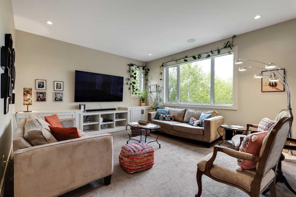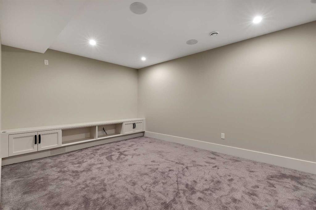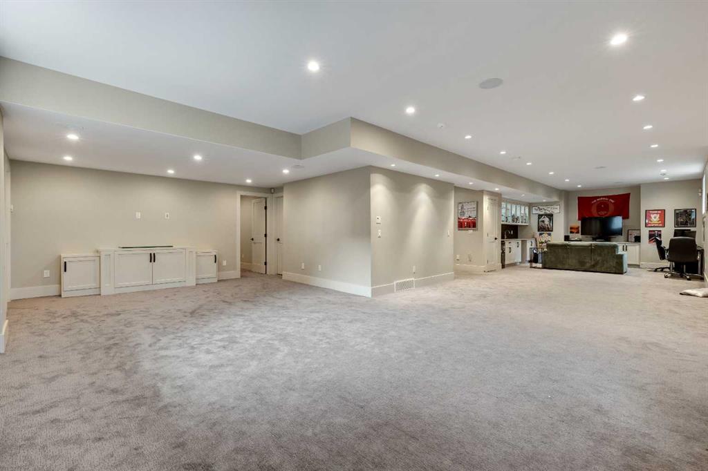 The fully developed walk-up basement features a media room, large games/family area, fifth bedroom, full bathroom, and underfloor heating. Enjoy ceiling speakers in every room, exterior surround cameras, a triple oversized garage with room for car lifts and gas pipes ready for a garage heater, two furnaces, an air conditioning unit, and a central vacuum.