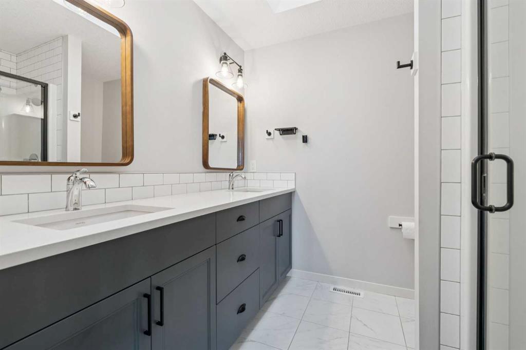 The upper level contains three spacious bedrooms, including a primary suite with a double sink vanity, a walk-in closet, and a skylight that floods the room with natural light. The upper floor also boasts a very spacious laundry room.