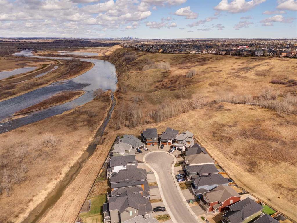 Welcome to this stunning executive bungalow located on a quiet cul-de-sac in the heart of Riverstone that features 3 bedrooms, 2.5 bathrooms, and over 2,700 square feet of developed living space and backs on to the escarpment. The main level features an open-concept layout with 10 foot ceilings, 8 foot doors, and a wall of windows along the rear of the home offering unobstructed views of the escarpment. Luxury vinyl plank flooring flows throughout the main level into the living area that features a gas fireplace and a built-in entertainment centre with functional storage and floating shelves above. The highly-upgraded kitchen offers two-tone full-height cabinetry, a pantry for extra storage, a custom range hood, a built-in wall oven, microwave, and induction cooktop, quartz countertops, and a spacious centre island with a breakfast bar for additional seating. The kitchen overlooks the dining and living areas – making this the perfect space for entertaining friends and family. Enjoy your morning coffee watching the wildlife along the escarpment from your large deck that is conveniently located off of the dining area. The expansive primary bedroom is located on the main level and features private views of the escarpment, floor to ceiling drapes, a spacious walk-in closet with custom built-ins, and a beautiful ensuite bathroom offering heated tile floors, a large soaker tub, a walk-in shower with upgraded glass surround, a double vanity, and fully tiled walls. The main level is complete with a 2-piece bathroom, a mudroom, and a dedicated laundry room that is accessible from both the main hallway and primary walk-in closet. The fully finished walkout basement features luxury vinyl plank flooring throughout and offers two spacious bedrooms, a 3-piece bathroom with heated floors, a large rec room area with surround sound speakers, ample storage space, and direct walkout access to the back patio and yard. One of the bedrooms features floor-to-ceiling drapes and views of the escarpment and the other bedroom offers a spacious walk-in closet. The backyard space offers a large patio that spans the length of the home and is ready for summer barbecues and the undeveloped section along the fence is a blank canvas that can be landscaped to your liking. Additional features of this home include a double garage with an EV charger and floor drain, central air conditioning for the warmer months, LED light fixtures, a water softener, and a water filtration system that runs to the kitchen sink. Centrally located in the sought-after community of Riverstone, this home is steps away from nearby walking paths along the escarpment and river, as well as parks and playgrounds and is a short drive to nearby schools and amenities. Access around the city and daily commuting is made easy with quick access to Deerfoot Trail and Stoney Trail. As one of the newest homes in Riverstone that backs on to the escarpment, this extensively upgraded home is a true rarity!