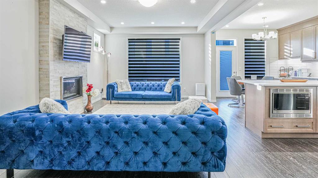 The living area is highlighted by a full-height stone gas fireplace, modern railings, and an open, elegant design. Upstairs includes a spacious primary suite with a luxurious ensuite and walk-in closets, while secondary bedrooms offer excellent natural light and smart storage.