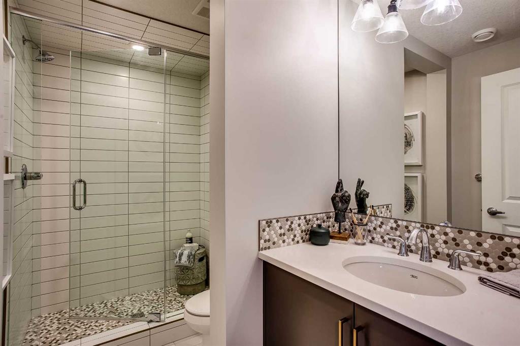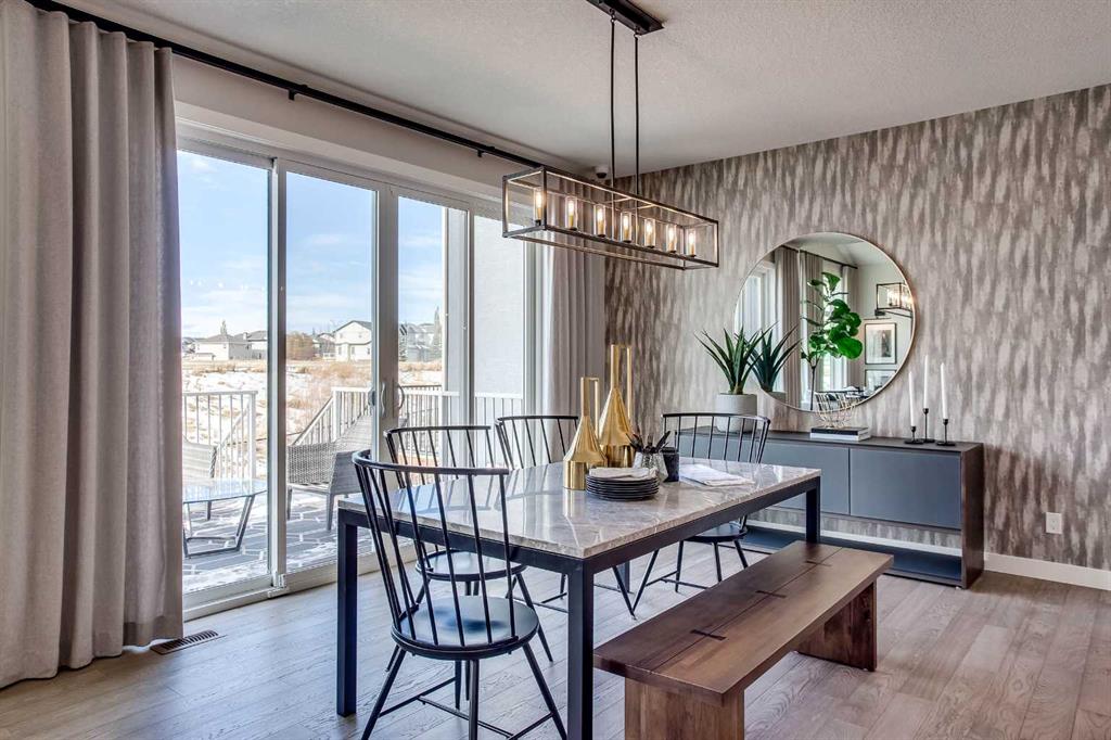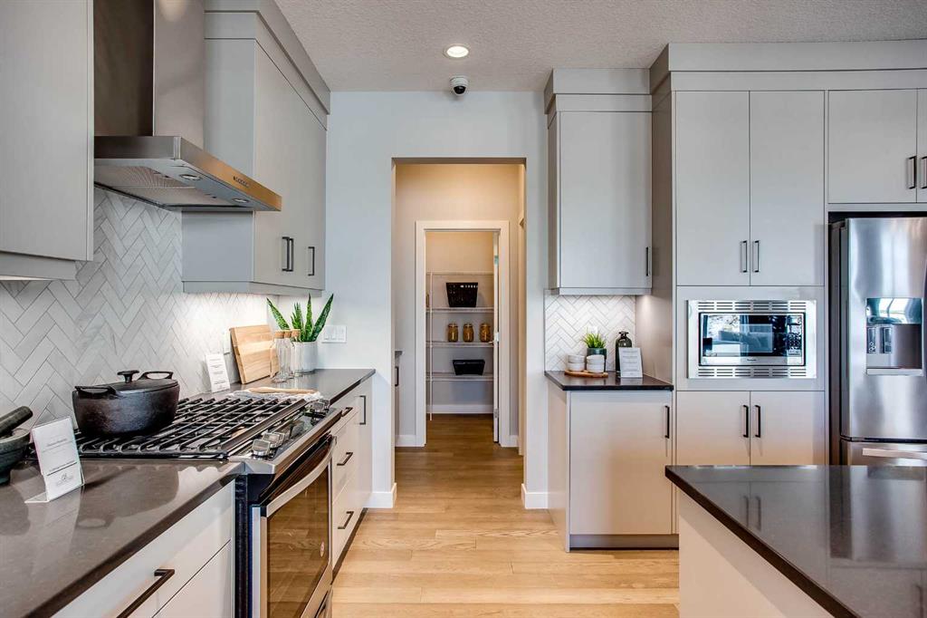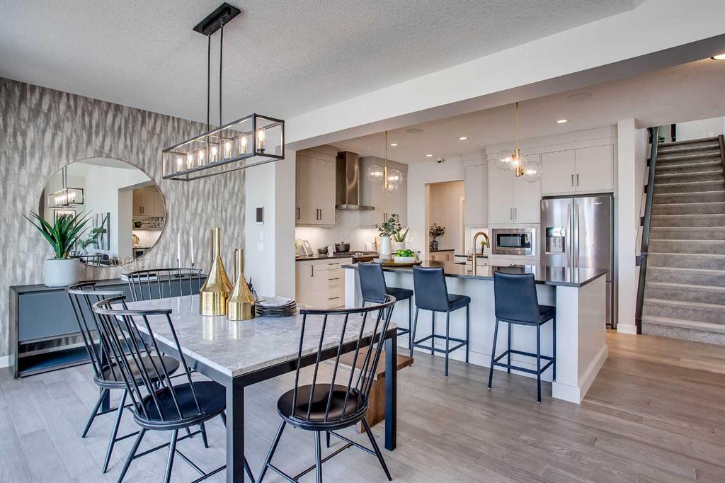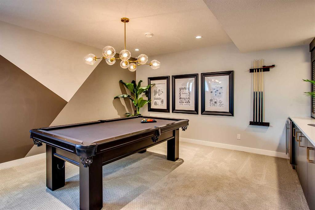 Exquisite Former Show Home with Majestic Mountain Views. Welcome to the “Hennessy III” by Calbridge Homes, an award-winning former show home where sophisticated designer upgrades meet an unparalleled lifestyle location. Backing onto a serene green space with a coveted west-facing backyard, this residence offers a front row seat to breathtaking Rocky Mountain sunsets. The interior is bathed in natural light, highlighted by wide-plank hardwood floors and custom designer lighting throughout an open-concept layout masterfully planned for both intimate family life and grand-scale entertaining. The gourmet chef’s kitchen serves as the heart of the home, featuring full-height cabinetry, a massive breakfast bar island, premium stainless steel appliances with a gas range, and a substantial butler’s pantry for seamless organization. In the grand great room, soaring vaulted ceilings with wood beams and a tiled fireplace create a sense of scale, while a signature wall of windows perfectly frames the outdoor oasis. For those seeking a quiet workspace, elegant French doors lead to a dedicated den perfect for a sophisticated home office. The upper level is a true sanctuary of comfort, led by a primary retreat featuring a massive walk-in closet and a spa-inspired ensuite with dual vanities, an oversized shower, and a deep soaker tub. A versatile central bonus room offers the ideal loft space for movie nights, complemented by three additional bright bedrooms, a full family bathroom, and a conveniently located laundry room. The professionally finished basement significantly extends the living space, offering a massive recreation area and a fully equipped wet bar with a beverage fridge. A large fifth bedroom and full bathroom provide a private suite for guests or older children. Complete with a generous triple-car garage, this home is close to the incredible walking paths that lead you throughout the parks and playgrounds this community has to offer. Enjoy unbeatable convenience being just minutes from the C-Train, YMCA, community center, and a vibrant array of local shops and dining. Experience the pinnacle of craftsmanship and scenery in this rare property. Call today for your personal viewing.