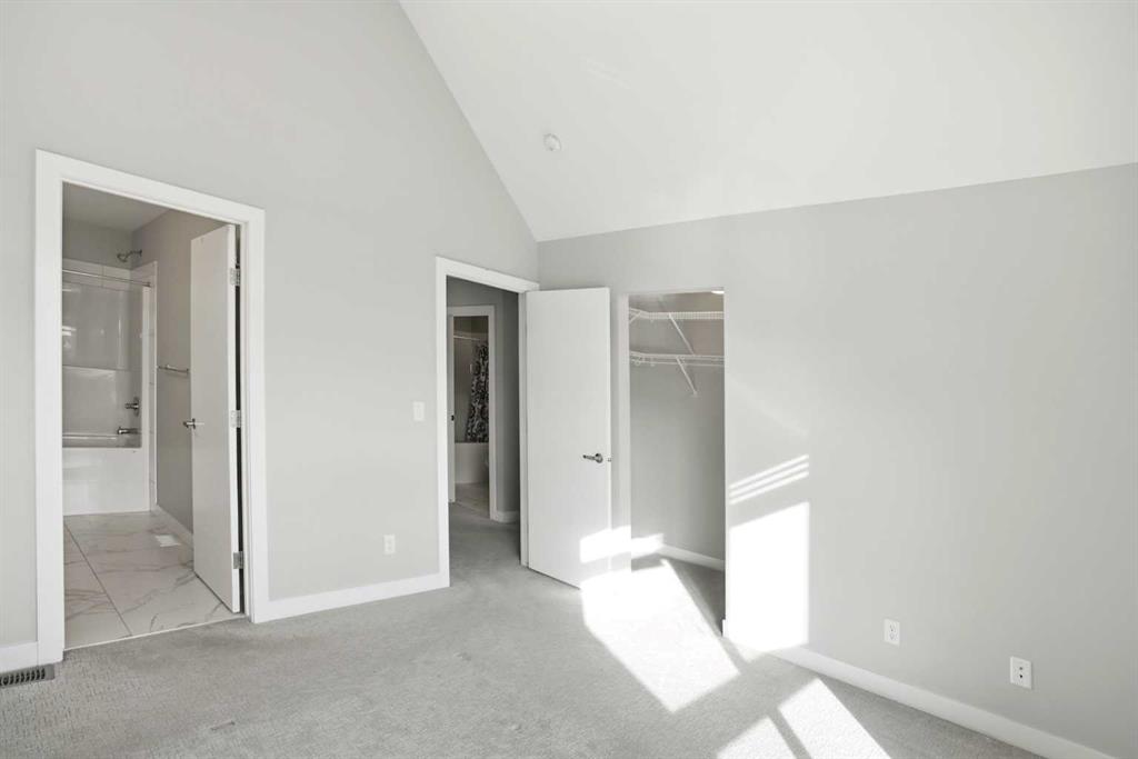 PRIMARY SUITE SANCTUARY Dramatic vaulted ceilings, expansive windows, walk-in closet with barn door & spa-inspired ensuite featuring oversized shower and quartz double vanities.