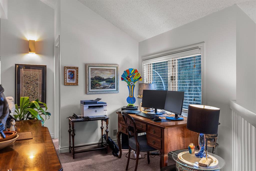 Properties within this limited collection of residences are rarely available, a clear indication of the desirability and long-term ownership in this location. Offering over 2,200 sq ft of well-designed living space, this 3-bedroom, 3-bathroom home backs directly onto unique green space and showcases exceptional south-facing mountain views, combining privacy with a strong connection to its natural surroundings. The main floor is configured for convenient main-floor living, featuring a spacious primary bedroom, 3-piece bathroom, kitchen, dining area, and living room. Vaulted ceilings and expansive windows in the living room provide abundant natural light and frame the surrounding landscape. A slate entry foyer creates a strong first impression, while the adjacent deck extends the living space outdoors and offers a sunny setting to enjoy the views. The upper level includes two additional bedrooms and a 4-piece bathroom, offering flexibility for family or guests.