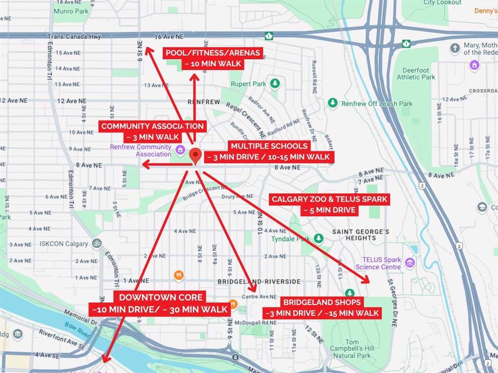 *VISIT MULTIMEDIA LINK FOR FULL DETAILS & FLOORPLANS!* BRAND NEW, MOVE-IN-READY TOWNHOME PROJECT FOR SALE IN RENFREW! Presenting this upper-level unit boasting over 1,000 sq ft, with 2 beds, 2.5 baths, and a single detached garage. The main floor showcases luxury vinyl plank flooring, and an open-concept layout with a central kitchen boasting tiled backsplash, quartz countertops, bar seating, and stainless steel Samsung appliances, including a French-door refrigerator and ceramic top stove. The adjoining living and dining areas provide a comfortable setting for meals or unwinding after a long day, while a stylish 2-piece powder room completes the main level. Upstairs, 2 spacious bedrooms, each with a 4-piece ensuite, await. Both bathrooms feature tiled flooring, quartz vanities, and a tub/shower combo. The spacious primary bedroom features a private balcony overlooking the residential street and downtown. Completing this upper level is a laundry closet with a stacked washer/dryer. Stylish and durable, the exterior features Hardie Board and Smart Board detailing, as well as brushed concrete steps and walks. Located in the heart of Renfrew, a tranquil inner-city community filled with tree-lined streets and green spaces. Enjoy being steps from ample parks, playing fields, and the Renfrew Community Association, which includes a playground and seasonal ice rink. Plus, enjoy being just minutes from the vibrant dining and shopping scene of neighbouring Bridgeland, and offering quick access to Calgary’s downtown core and major roadways, this townhome project blends inner-city convenience with the ease of a lock-and-leave lifestyle. *Interior photos are of the show home (unit #8). Schedule your private showing today!