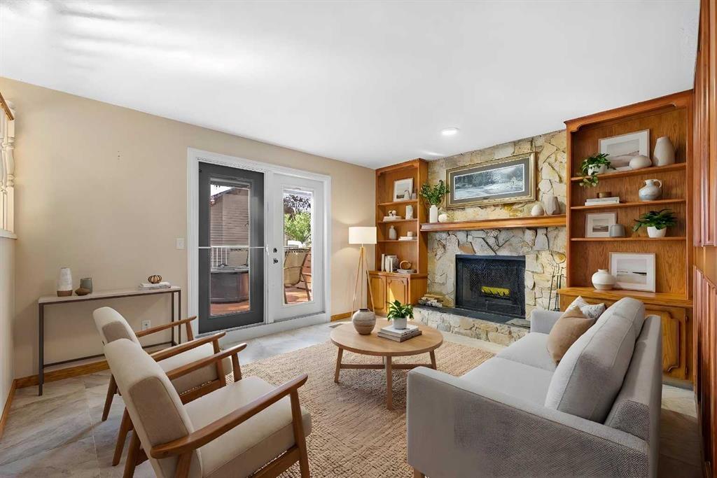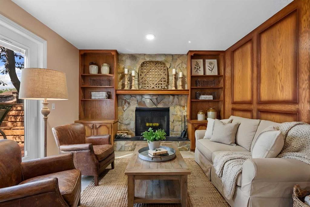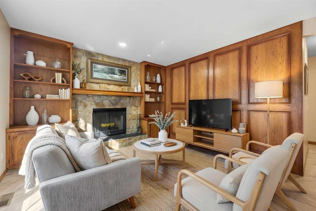The walkout level, open to the dining area above, offers a cozy family space with a built-in feature wall and wood-burning fireplace, plus direct access to the attached garage.