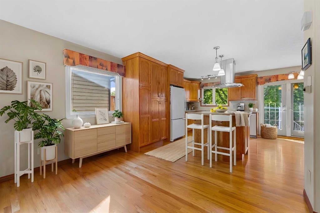 The open-concept oak kitchen is an entertainer’s dream, featuring a center island with eating bar, ample cabinetry with built-in pot drawers, a pantry, and a charming corner china cabinet that enhances the adjacent dining area. Personalize your custom kitchen – refinish or stain with a colour that makes it your own.