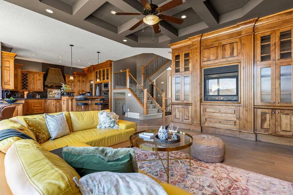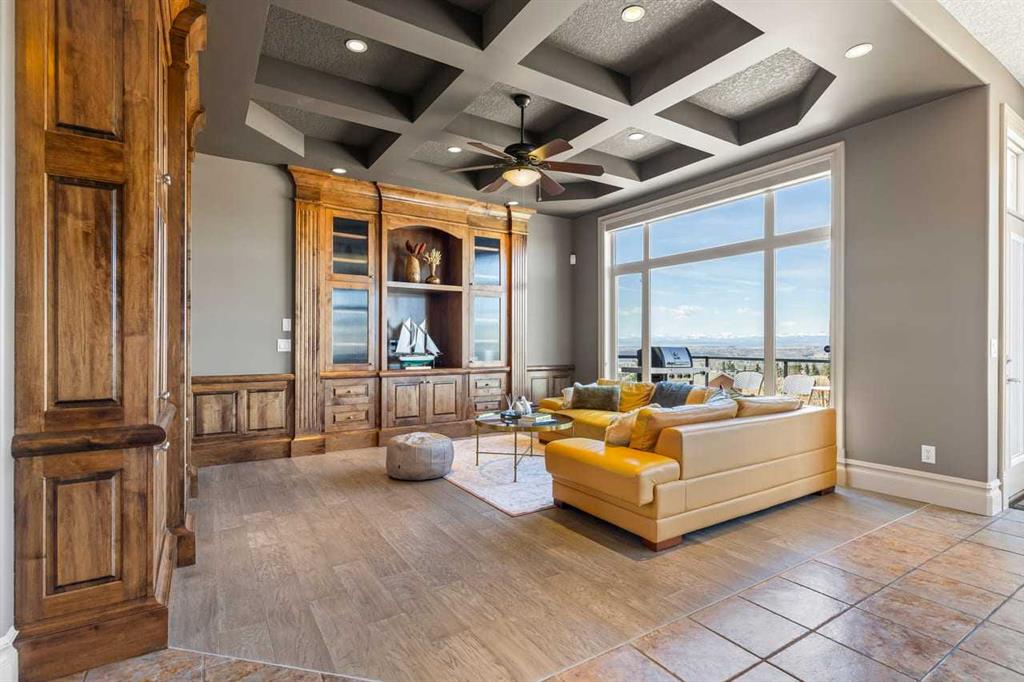 Panoramic Rocky Mountain views take center stage in this exceptional former show home, creating a sense of space and calm that is immediately felt the moment you enter. Offering over 4,000 sq. ft. of total living space, the spacious main floor is enhanced by 10 ft ceilings and an open-concept layout designed to maximize light and sightlines. Expansive windows frame the landscape like artwork, with open skies, rolling horizon, and distant peaks visible throughout the main living areas. The living room is both inviting and refined, anchored by a coffered ceiling and a substantial custom wood built-in that speaks to the level of craftsmanship throughout. Warm engineered hardwood flooring and the seamless connection to the dining area create a space equally suited for everyday living and entertaining. A separate main floor sitting area provides additional flexibility for formal gatherings or a quiet retreat.